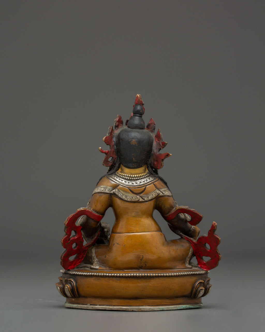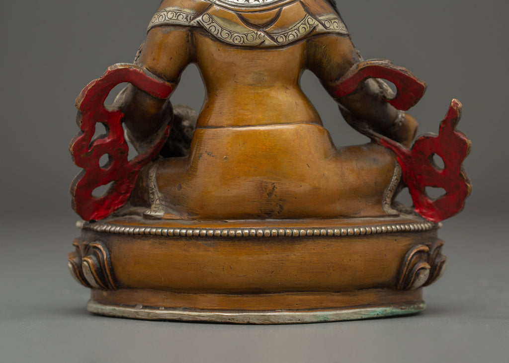 In his iconography, Dzambhala is depicted seated in a regal posture on a lotus base, symbolizing purity and spiritual elevation. He holds a citron fruit in his left hand, representing prosperity, while his right-hand mongoose spits a jewel, a powerful emblem of wealth, generosity, and abundance. This composition reflects Dzambhala’s role as the deity of material and spiritual riches, making the statue both visually captivating and spiritually meaningful.