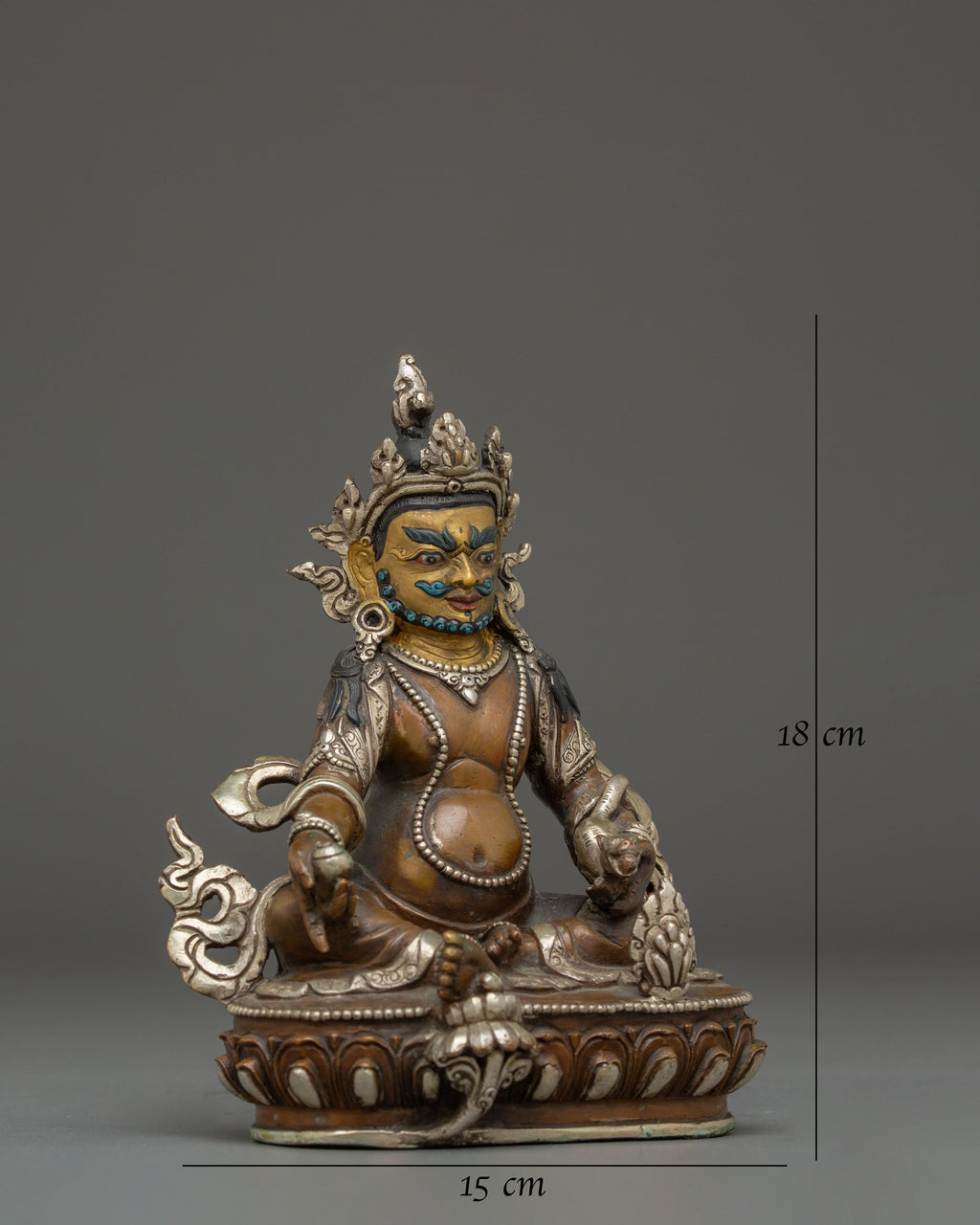 This Handmade Copper Statue of Dzambhala stands 7.1” (18 cm) in height with a 5.9” (15 cm) base and weighs 1.37 kg. Crafted from oxidized copper and adorned with silver plating, along with detailed acrylic paintings, this piece beautifully reflects the artistry of skilled Nepali craftsmanship.
