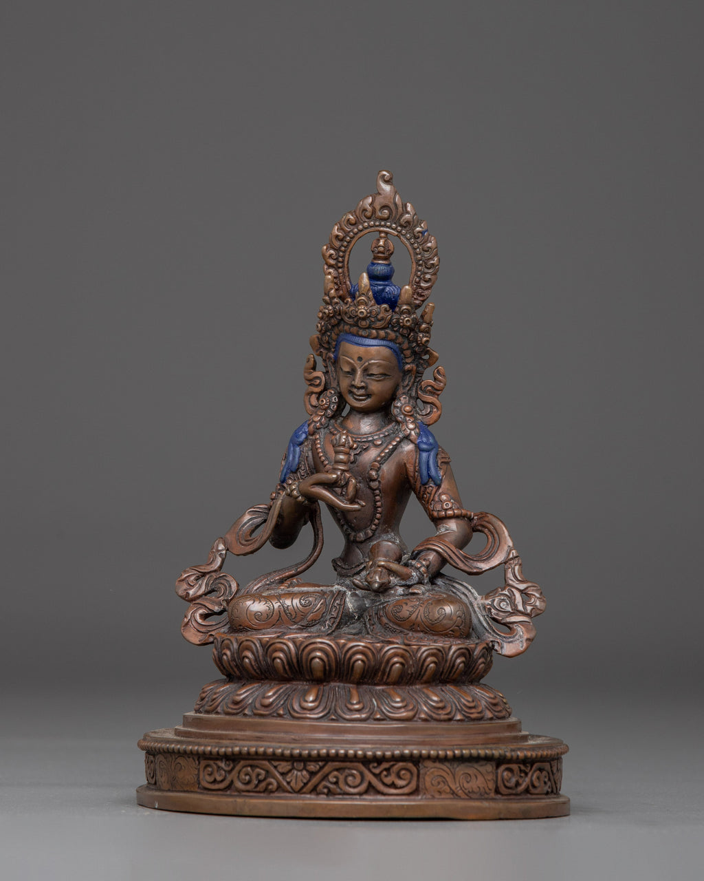 In his iconography, Vajrasattva is depicted holding a vajra in his right hand, symbolizing skillful means and the method aspect of enlightenment, while his left hand holds a bell, representing wisdom and the realization of emptiness. Seated gracefully on a padmasana (lotus) base, the statue embodies purity and spiritual awakening, making it a powerful representation of Vajrasattva’s role as the purifier of negativities and obscurations.