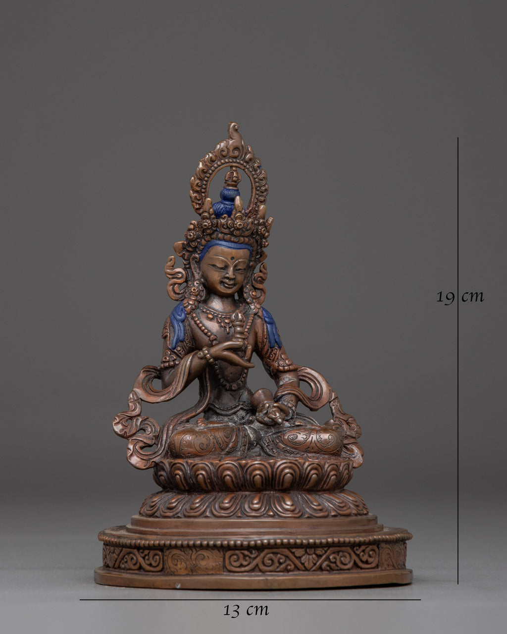This Handmade Copper Statue of Vajrasattva stands at 7.5”/19 cm in height with a 5.1”/13 cm wide base, weighing 0.80 kg. Expertly crafted from oxidized copper and adorned with detailed acrylic paintings, this piece showcases the skill of its artisans and makes a meaningful addition to personal altars, meditation spaces, or sacred collections.