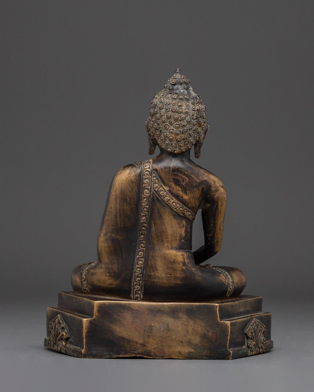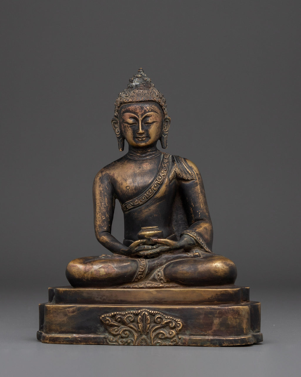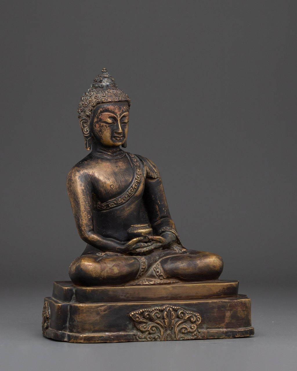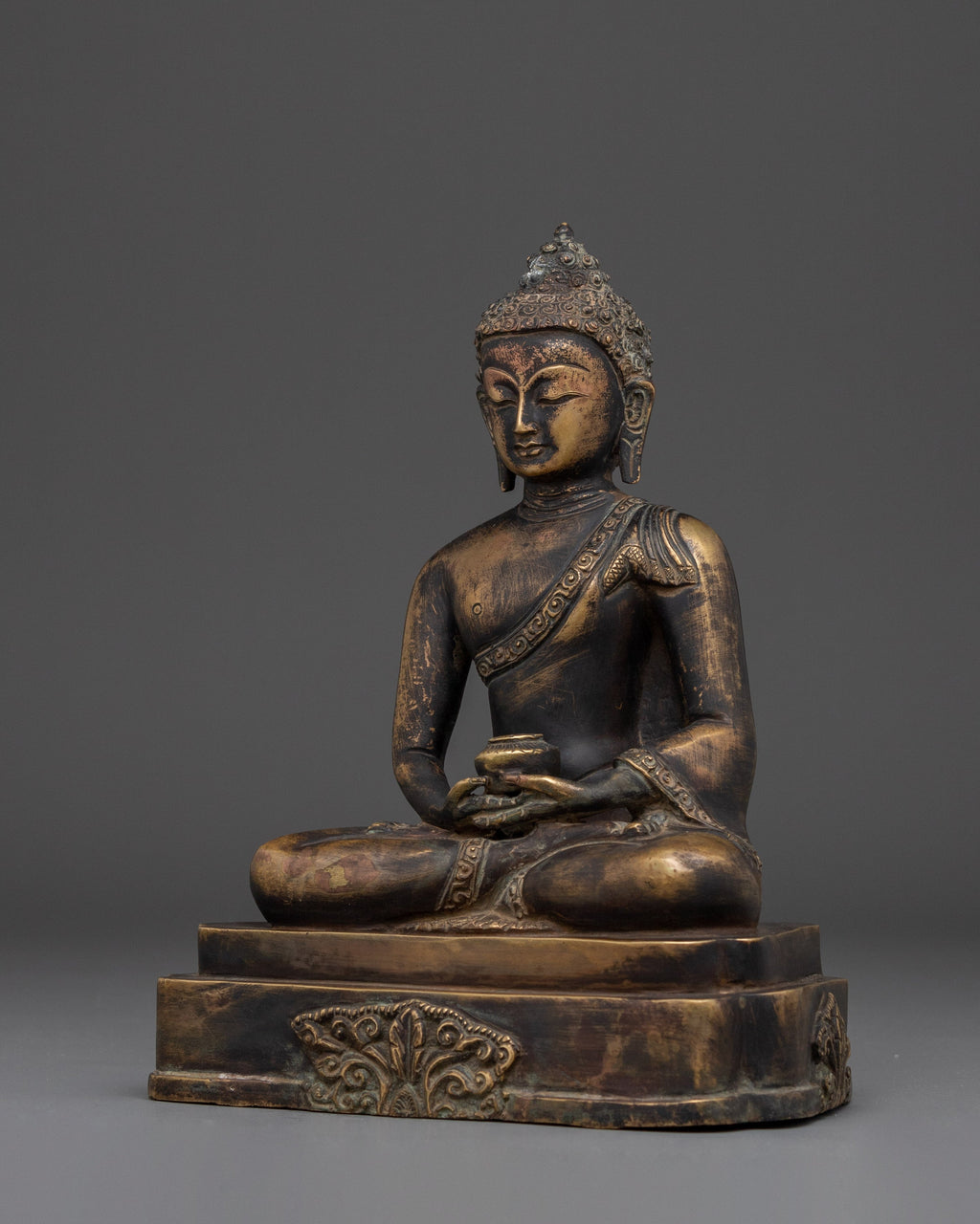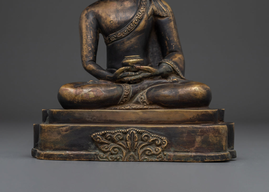 This Dharmakara Amitabha Sculpture is a one-of-a-kind and sacred artifact, ideal for individuals seeking to deepen their spiritual practice or add a significant touch to their home. Its small size allows it to be conveniently put on altars, shelves, or tables, infusing the space with positive energy. Its hand-finished workmanship and usage of copper transform this sculpture into not only a work of art, but also a conduit for spiritual growth and harmony.