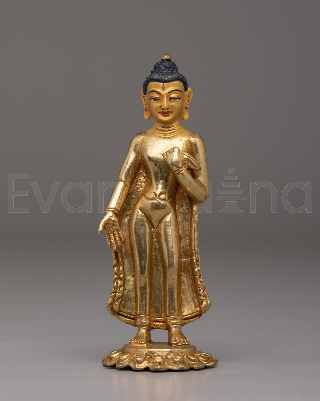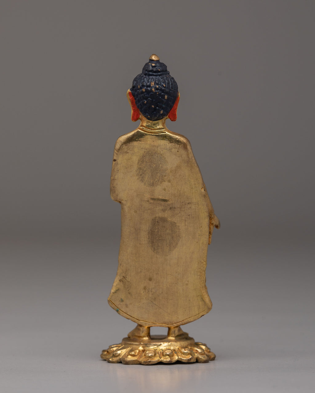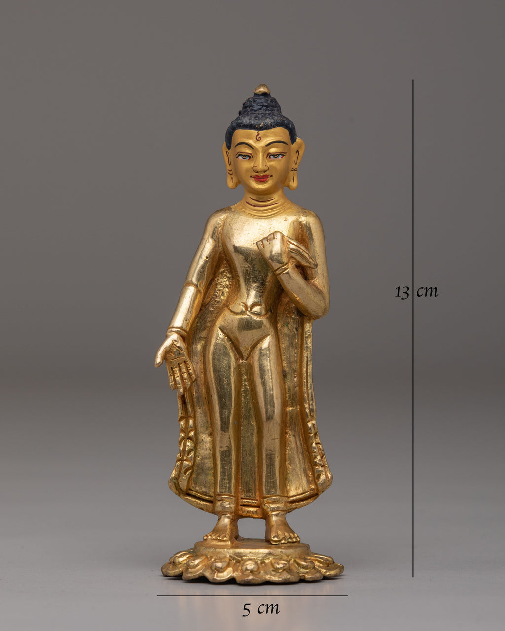 The Dipankara Buddha Statue is a beautifully crafted, small-scale representation of the ancient Buddha, designed with great attention to detail. Measuring 13cm in height and weighing only 0.26kg, this lightweight yet striking statue is plated in 24K gold and accented with acrylic color on a copper body. As the Buddha of light and the future Buddhas, Dipankara Buddha symbolizes the journey towards enlightenment, making it a perfect addition to any meditation space or spiritual altar.