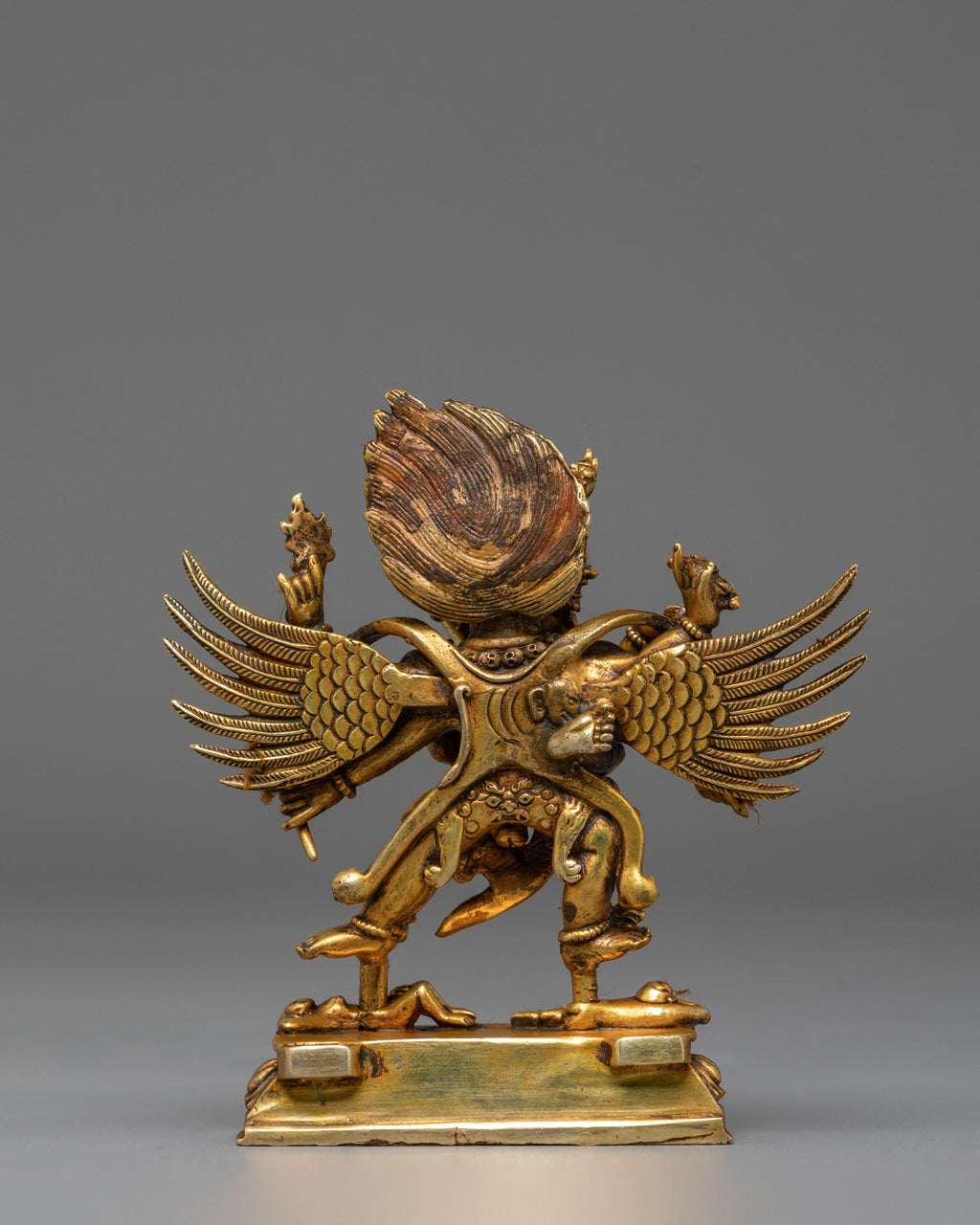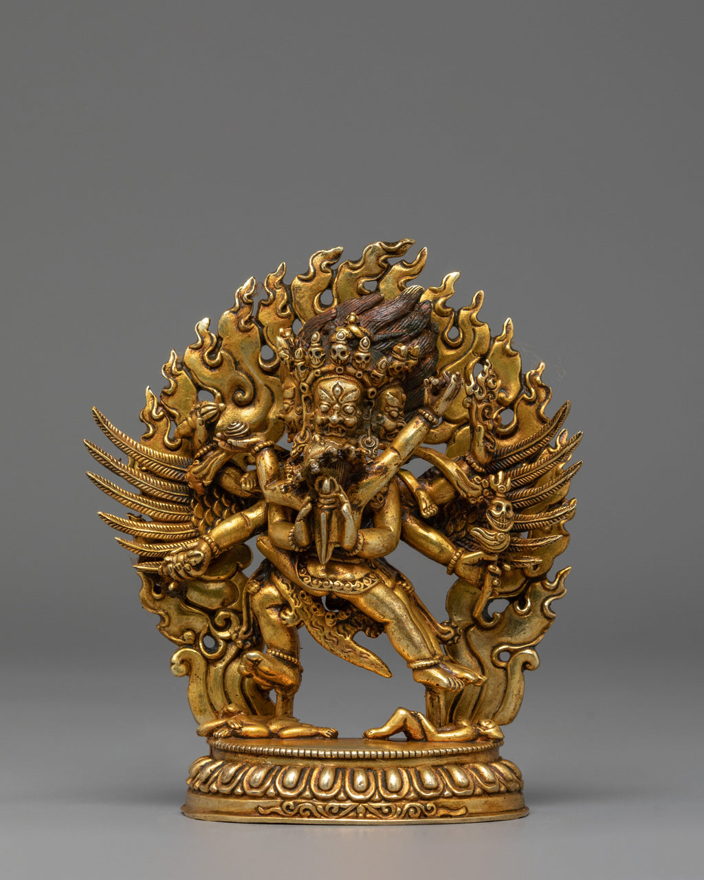 This magnificent handmade Dorje Phurba Buddhist statue, crafted from a gold-plated copper body, embodies the powerful wrathful deity Vajrakilaya, revered throughout Tibetan Buddhism for removing obstacles and protecting practitioners. Measuring 12.5 cm in height, 11 cm in width, and weighing 0.49 kg, this Vajrakilaya sculpture showcases extraordinary craftsmanship with intricate detailing. Dorje Phurba, meaning “Vajra Dagger,” is depicted in his classic three-headed form with six arms holding sacred implements, including the ritual phurba dagger, while embracing his consort in a powerful union that symbolizes the inseparable nature of wisdom and compassion. The statue features an elaborate flaming aureole representing the transformative fire of wisdom that consumes negativity. His fierce expression, adorned with a skull crown and flowing scarves, radiates wrathful compassion. The deity stands powerfully upon a lotus throne, trampling obstacles beneath his feet, symbolizing the subjugation of ego and delusion.