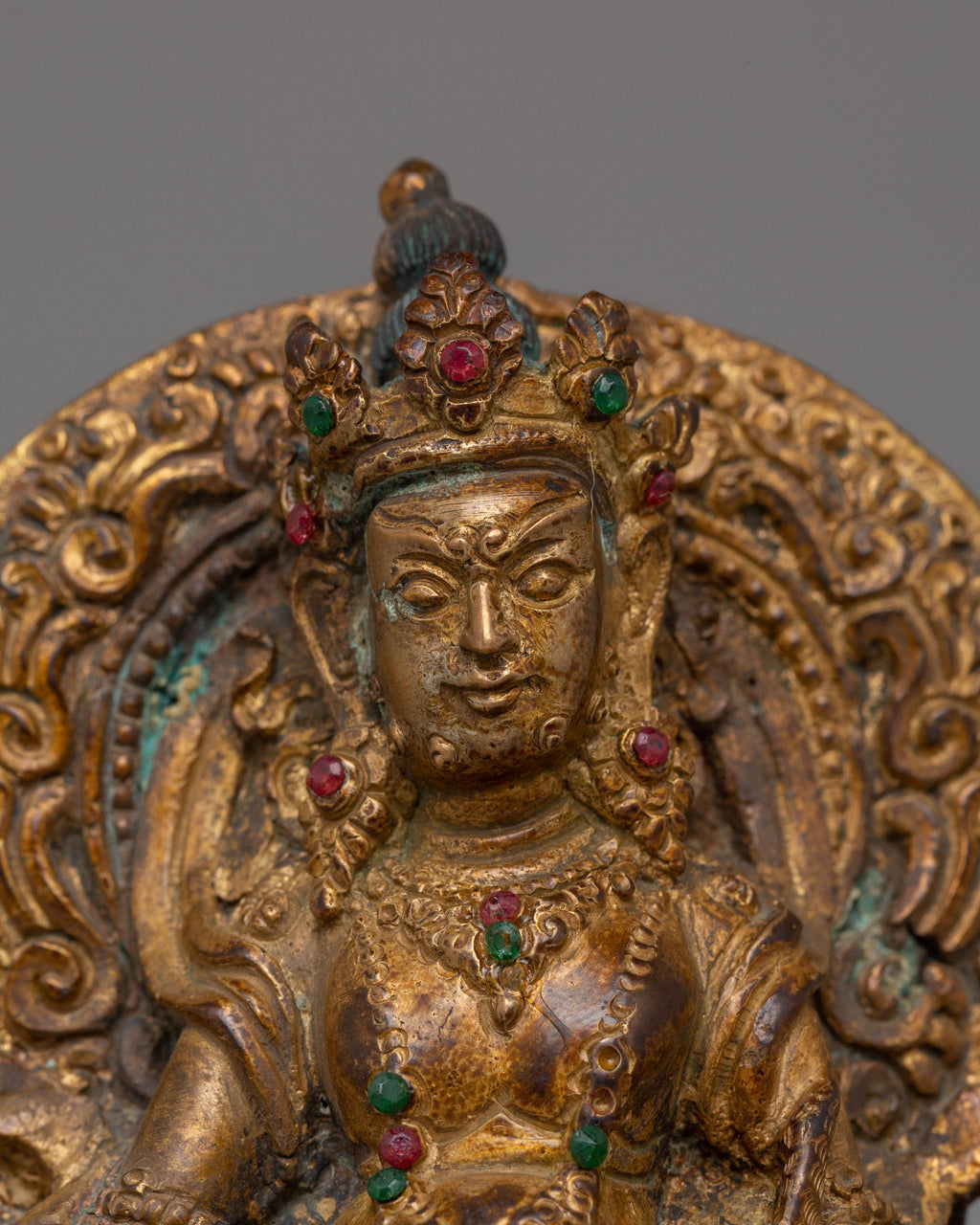 The fine carvings on Dzambhala's flowing robe, the life-like characteristics of his face, and the complex patterns on his jewelry are all enhanced by the sumptuous gold-plated. The inlaid jewels lend depth and brightness to the statue, increasing its visual appeal and spiritual importance. Dzambhala's intricate craftsmanship and towering presence make this statue an effective complement to any environment, serving as a continual reminder of his lessons on charity and wealth.