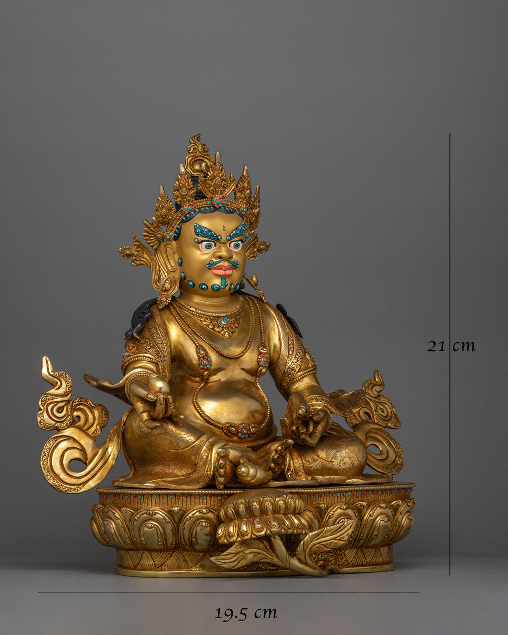 The intricate patterns on Dzambhala's clothing and the sumptuous textures of the lotus seat are only two examples of the skilled sculpture that went into creating this statue. The piece has been given elegance and spiritual meaning by the craftspeople's deft attention to the fine details. The flawless artistry of the artists is further enhanced by the use of 24K gold gilding, which also represents the sacred character of Dzambhala. For people looking for artwork that infuses their environment with richness and good vibes, this statue is perfect.