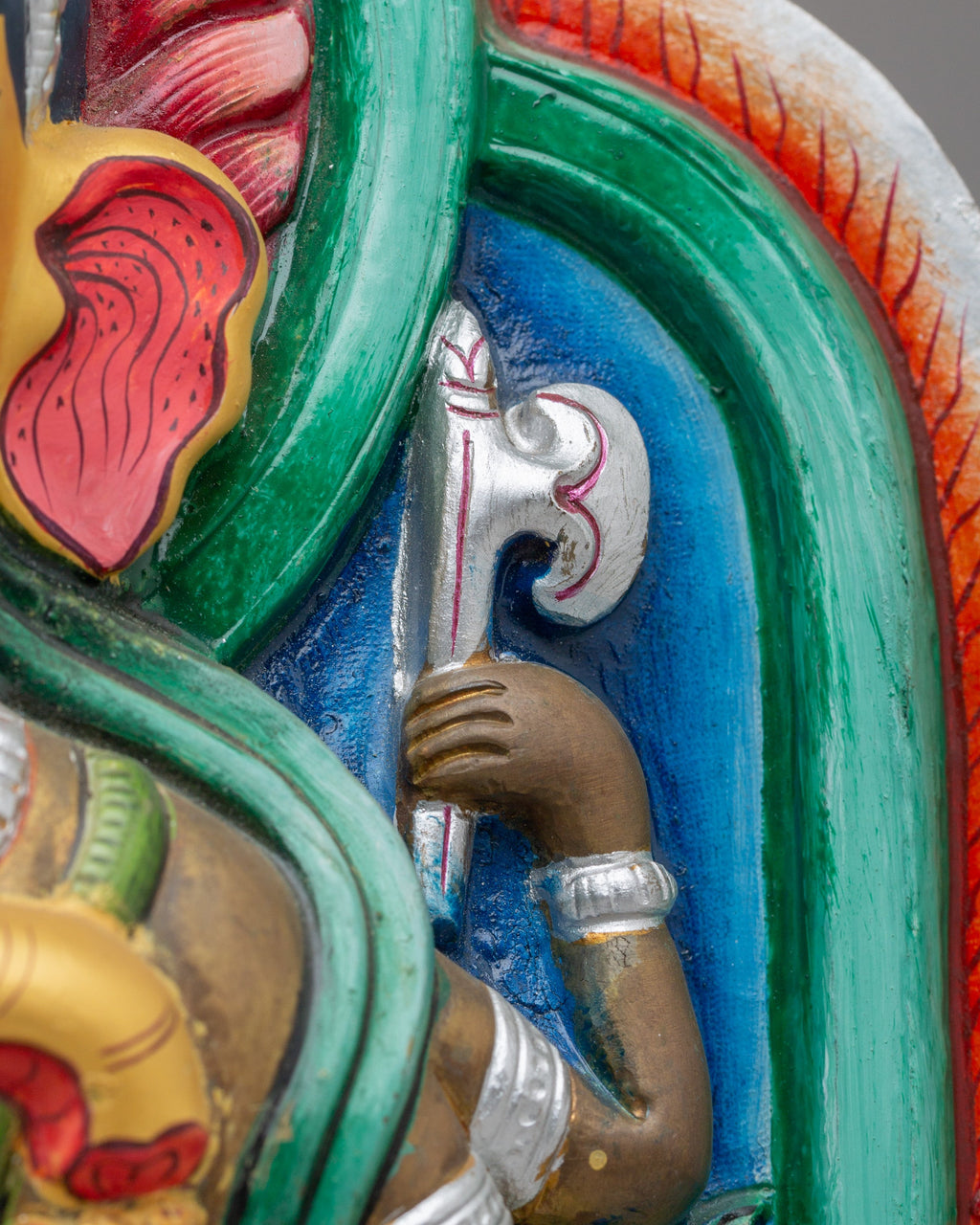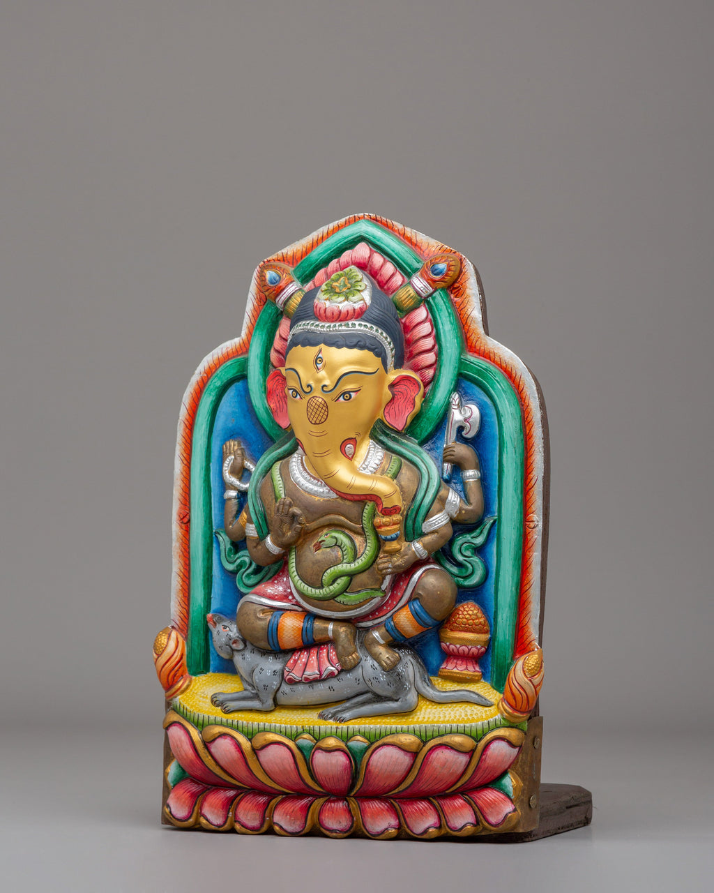 Invite blessings of prosperity and wisdom into your home with this exquisite Ganesha sculpture, the beloved remover of obstacles in Hindu tradition. Seated majestically upon a lotus bloom, this handcrafted statue embodies spiritual purity and the path to enlightenment. Every element tells a story of triumph—from the graceful mudras of his hands to the serpent coiled nearby and the sacred rat beneath, each symbolizes the victory of intellect over adversity. Rendered in vibrant, jewel-toned hues that captivate the eye, this piece transforms any meditation space, personal altar, or room into a sanctuary of divine energy and spiritual intention. A meaningful treasure for seekers and devotees alike.