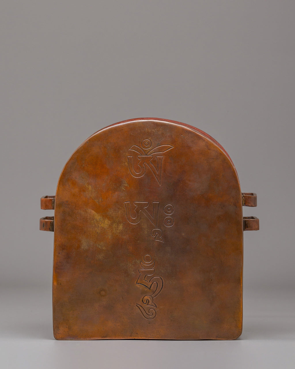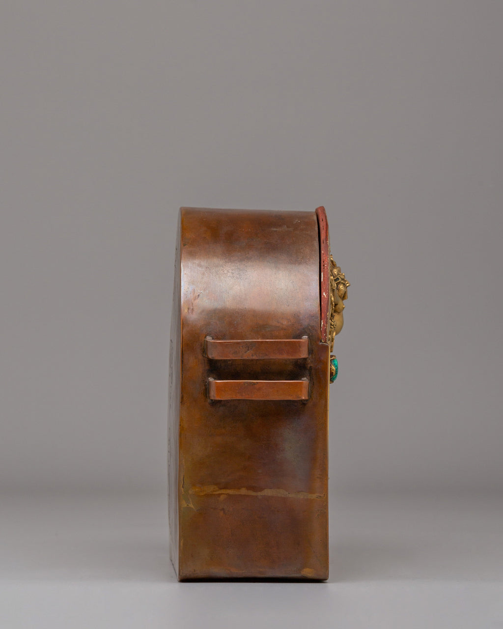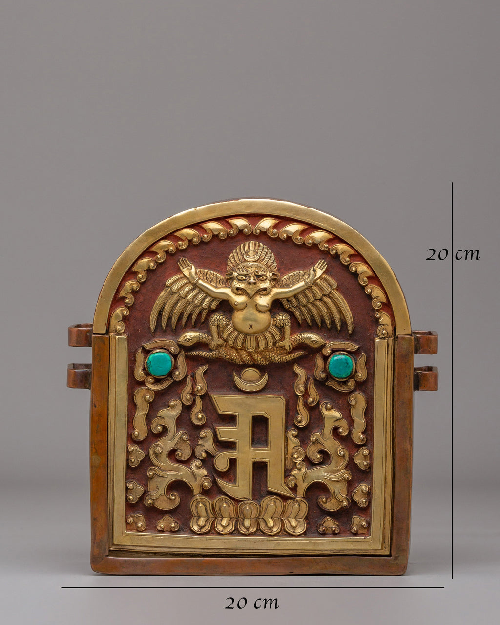 This Traditional Garuda Ghau Box measures 20 cm in height and 20 cm in width and weighs 1.12 kg, making it perfect for altar display. It is crafted from oxidized copper, gold-plated, and adorned with gemstones. The construction and detailed work reflect traditional Himalayan craftsmanship, making it suitable for altars, meditation spaces, and devotional interiors.