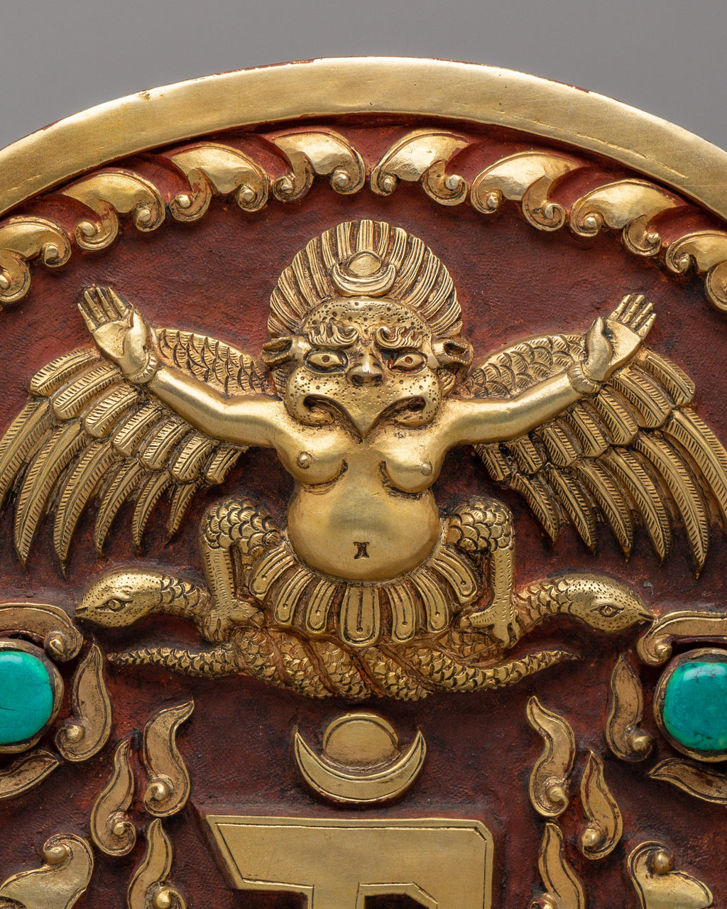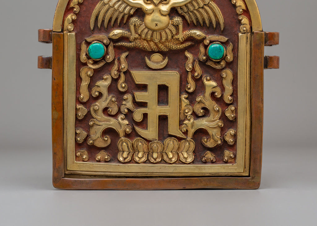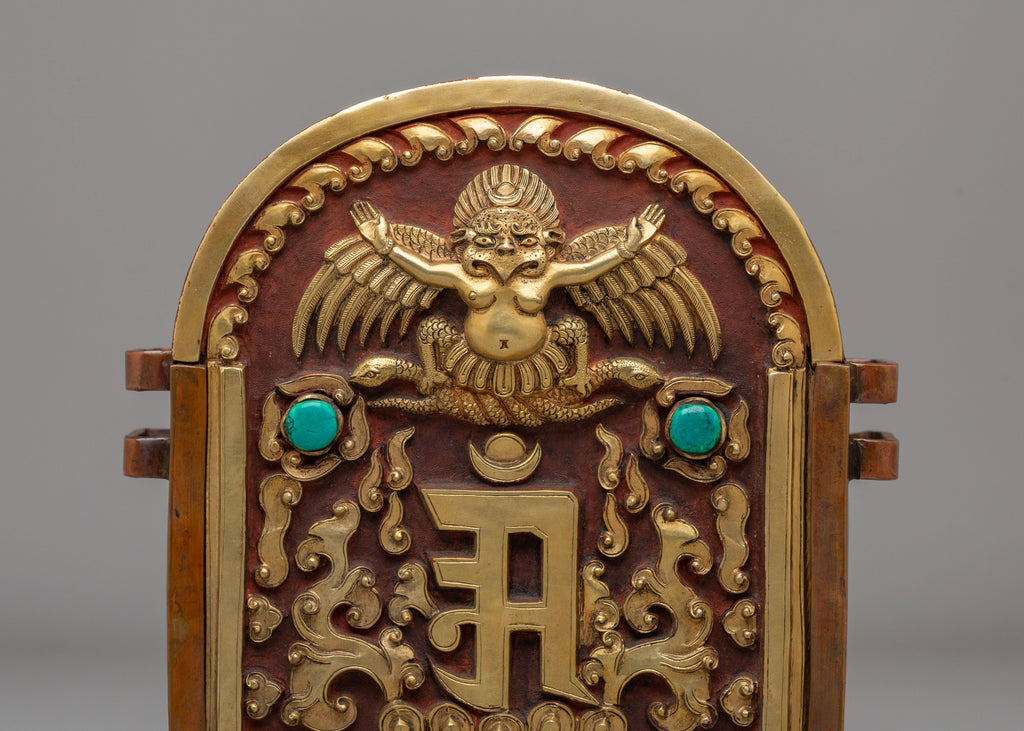 The iconography centers on Garuda, the powerful mythical bird revered in Buddhist tradition as a guardian figure and symbol of protection. Depicted with a commanding stance and expressive wings, Garuda represents strength, fearlessness, and the ability to overcome obstacles. The surrounding decorative motifs and gemstone accents enhance the sacred symbolism, signifying purity, vitality, and spiritual defense. As a traditional ghau box, the piece is associated with holding sacred items and mantras, reinforcing its role as a symbol of protection and spiritual strength.