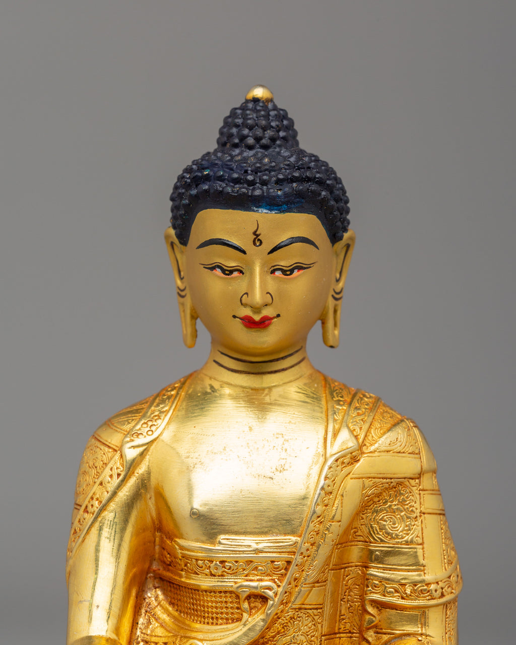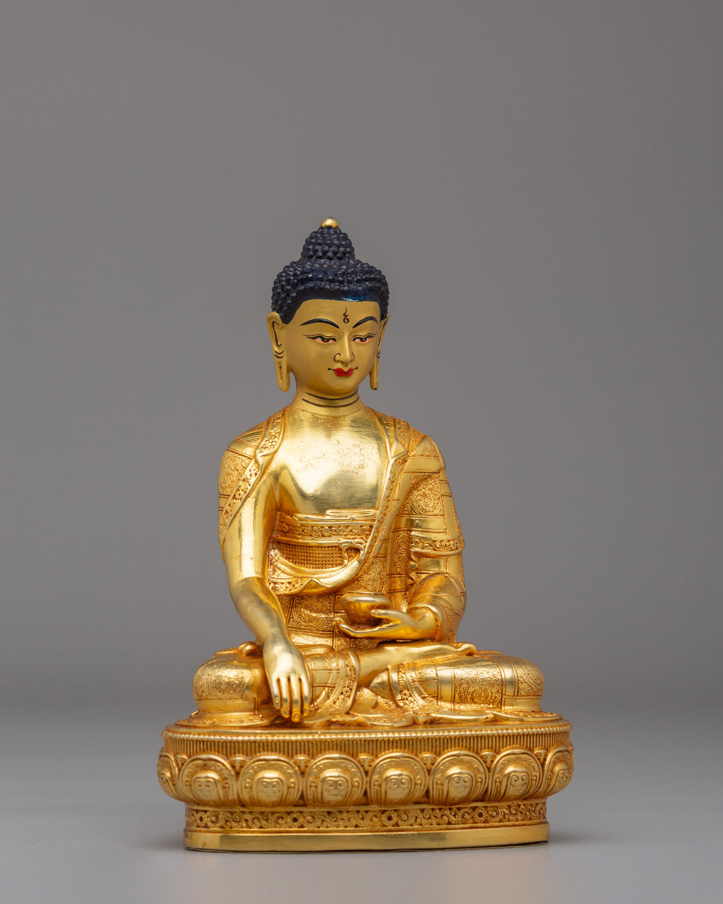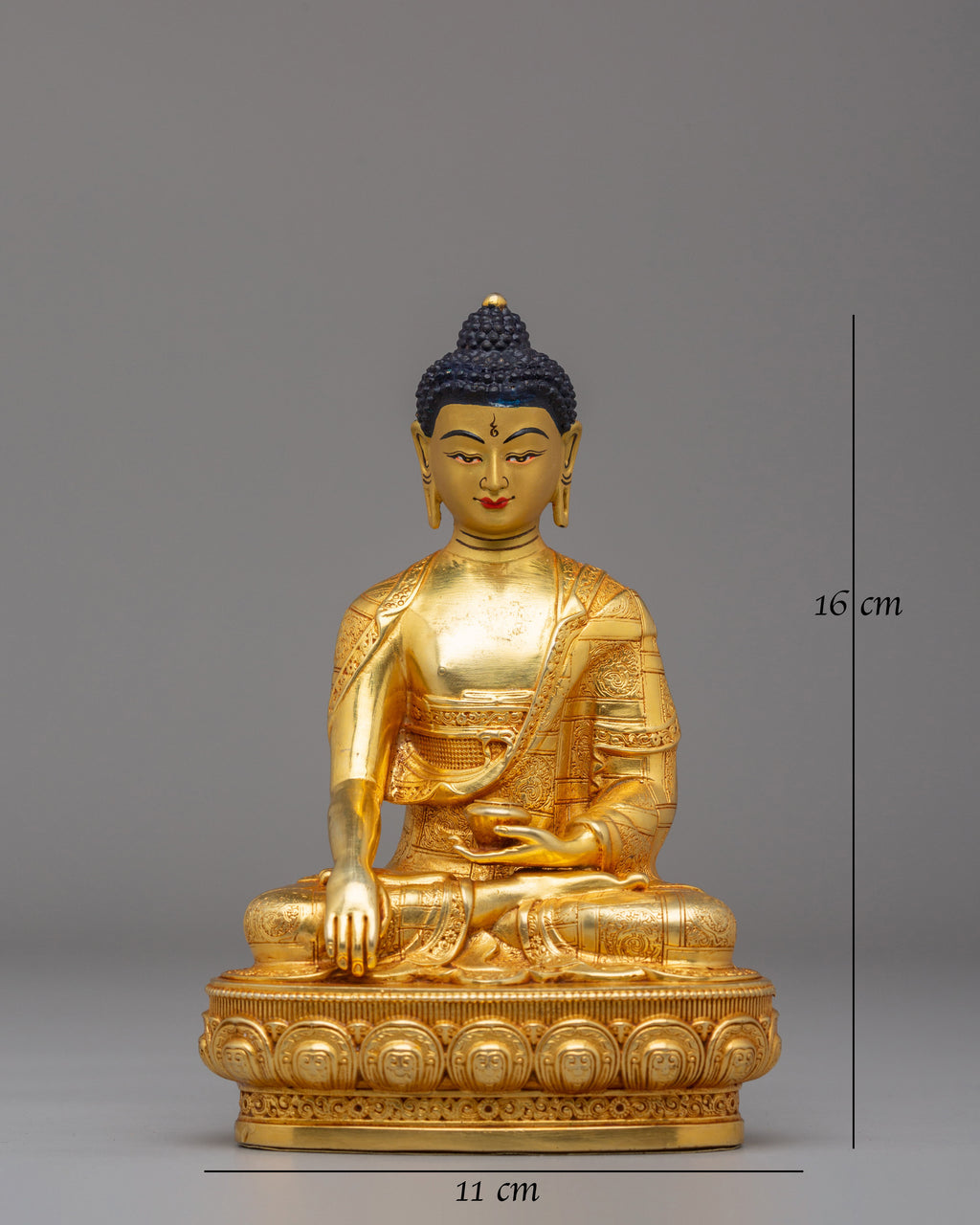 This Shakyamuni Buddha statue, made of copper with 24K gold plating and acrylic color, symbolizes tranquility, knowledge, and enlightenment. Standing 16 cm tall and 11 cm wide, it represents the historical Buddha's serene presence, making it a valuable addition to any meditation room or altar. The Buddha's peaceful expression and graceful posture inspire calm and mindfulness, creating a tranquil atmosphere perfect for meditation or reflection.