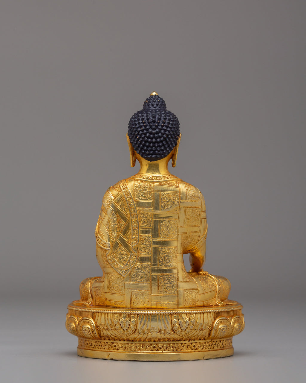 The statue depicts Shakyamuni Buddha in a state of tranquil composure, seated in the padmasana (lotus posture). His right hand rests in the bhumisparsha mudra, symbolising the moment of enlightenment, while his left hand holds an alms bowl, representing simplicity and renunciation. The detailed artistry and luminous gold finish enhance its sacred presence, offering both spiritual inspiration and artistic beauty.