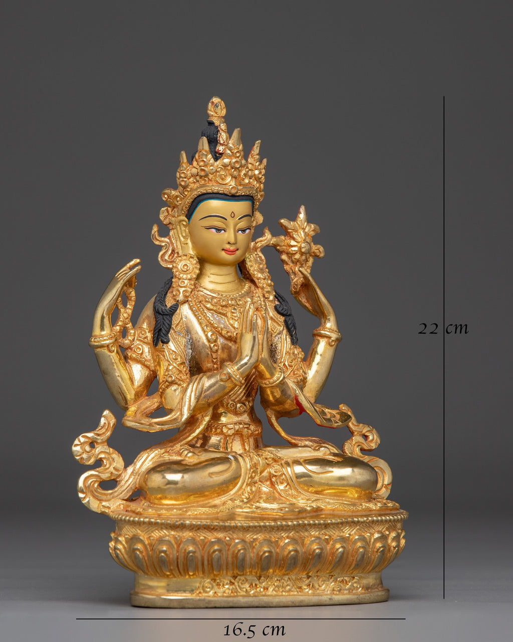 This Handmade gold-gilded Chenrezig Art, known as the embodiment of boundless compassion, represents boundless love, peace, and the desire to alleviate the suffering of all beings. This handcrafted statue is 8.7" (Height) x 6.5" (Base) and weighs 1.54 kg. It is made of copper, adorned with 24K gold gilding, and enhanced with detailed gold and acrylic paints. This sculpture, created by expert Nepalese artisans, symbolizes the spiritual traditions of Himalayan Buddhism and makes a meaningful addition to altars, meditation places, or sacred collections.