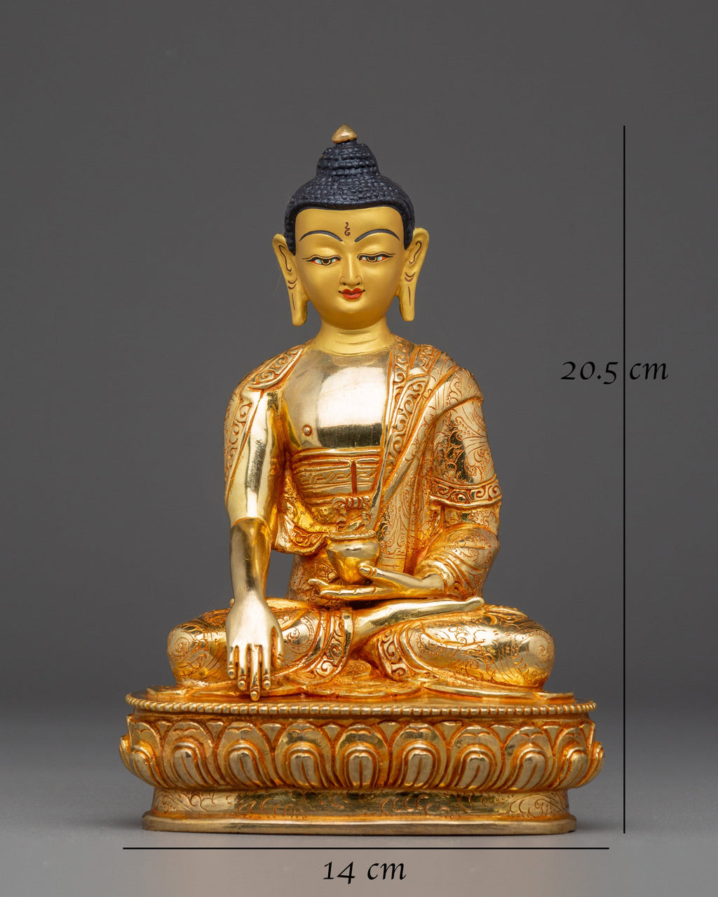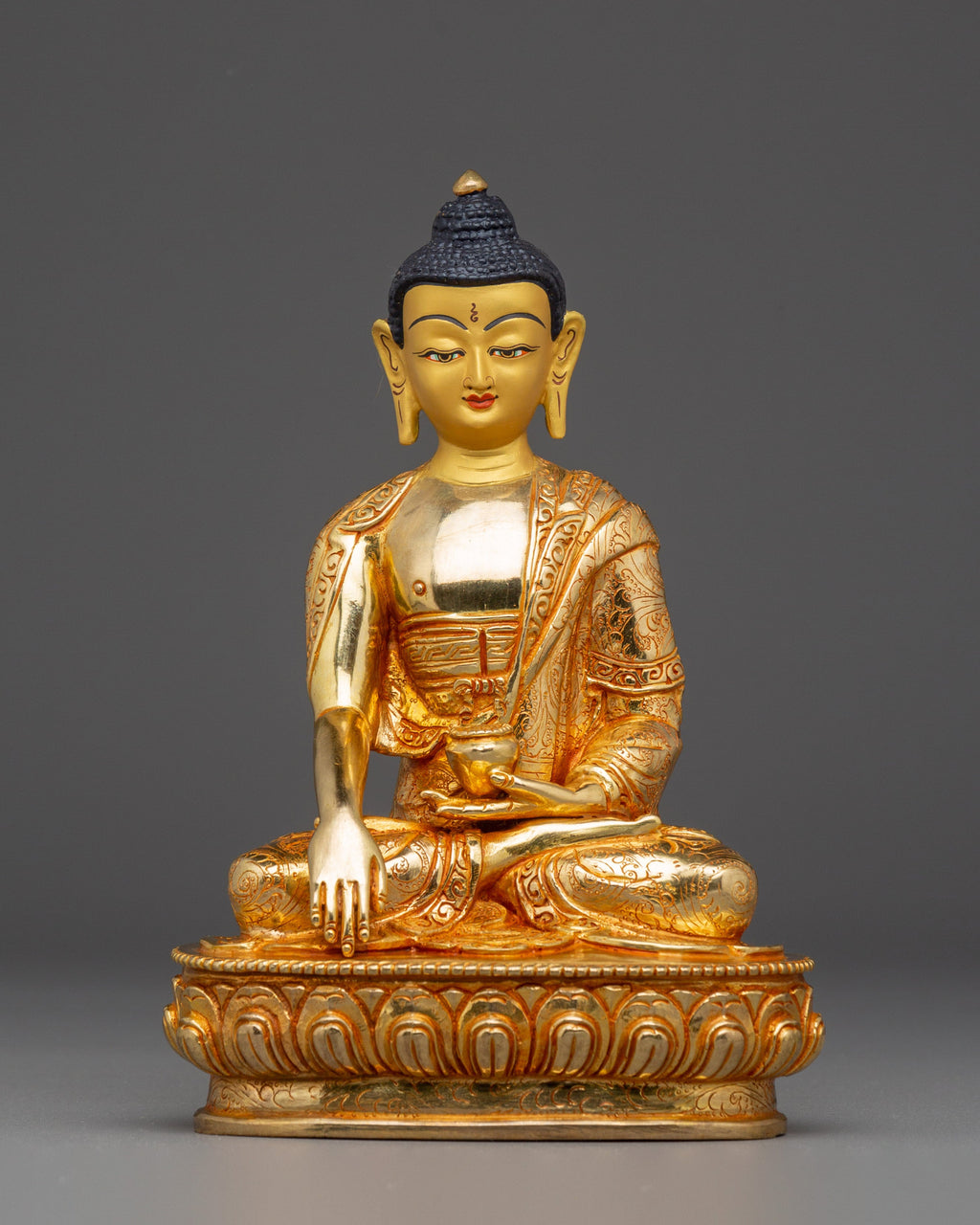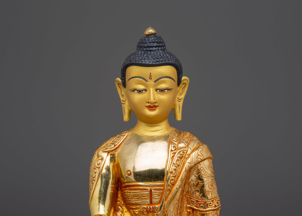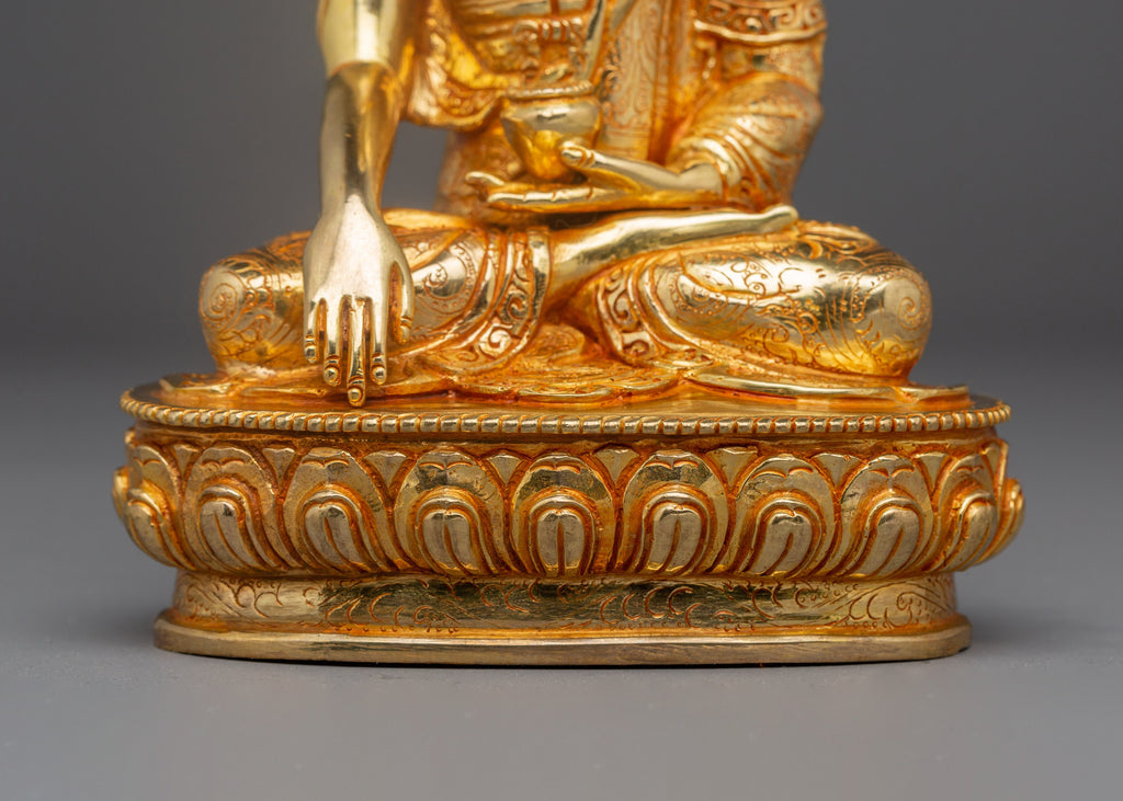 The Handmade Gold Gilded Statue of Shakyamuni Buddha captures the profound stillness and compassion of the historical Buddha, Siddhartha Gautama. Created by master artisans of the Himalayas, this exquisite sculpture is skillfully handcrafted from copper and adorned with radiant layers of gold gilding. The serene figure of the Buddha sits in the earth-touching mudra, representing the moment of enlightenment beneath the Bodhi tree. His calm expression, detailed robe, and refined lotus base reflect the devotion and sacred artistry that define traditional Buddhist craftsmanship. Each delicate feature, from the contours of the face to the hand-carved lotus petals, conveys the peace and spiritual wisdom that Shakyamuni Buddha embodies.