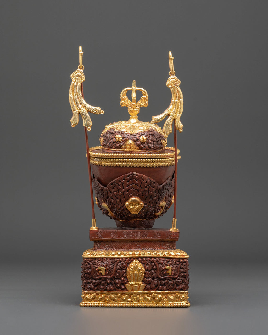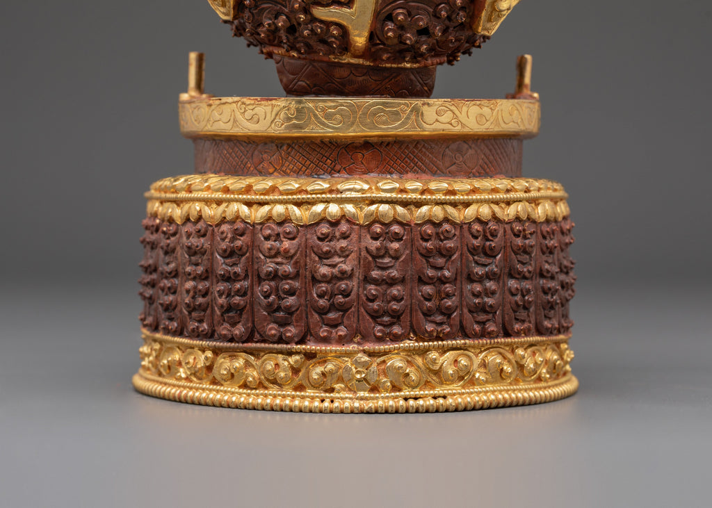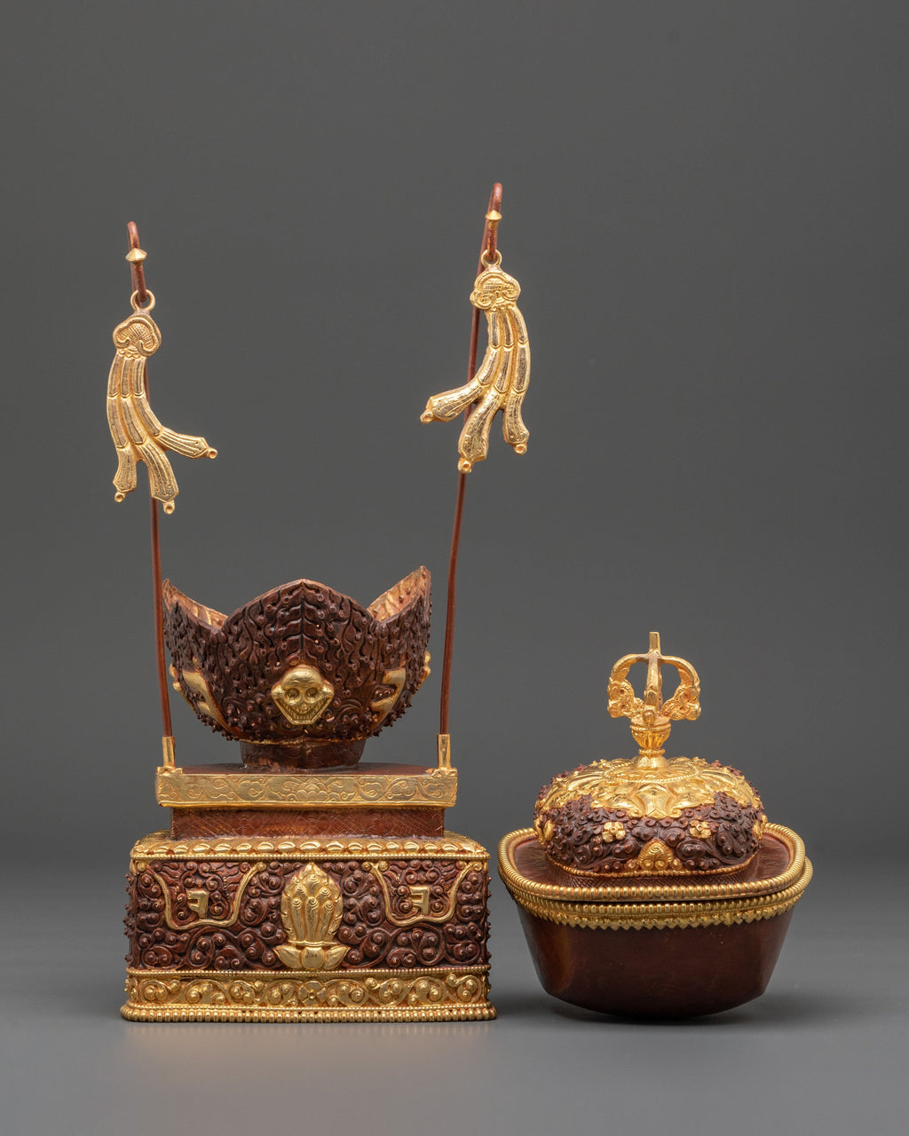 Each piece in this ritual Kapala pair is adorned with intricate carvings and gold embellishments, showcasing motifs inspired by Himalayan deities and auspicious emblems. The bowl rests on a decorative pedestal base, symbolizing stability and reverence. At the same time, the upper section is crowned with an ornate lid and flags that represent the victory of wisdom over ignorance. The deep copper hue, enhanced by acrylic color detailing, gives the set a regal appearance, while the gold-plated accents radiate spiritual brilliance.