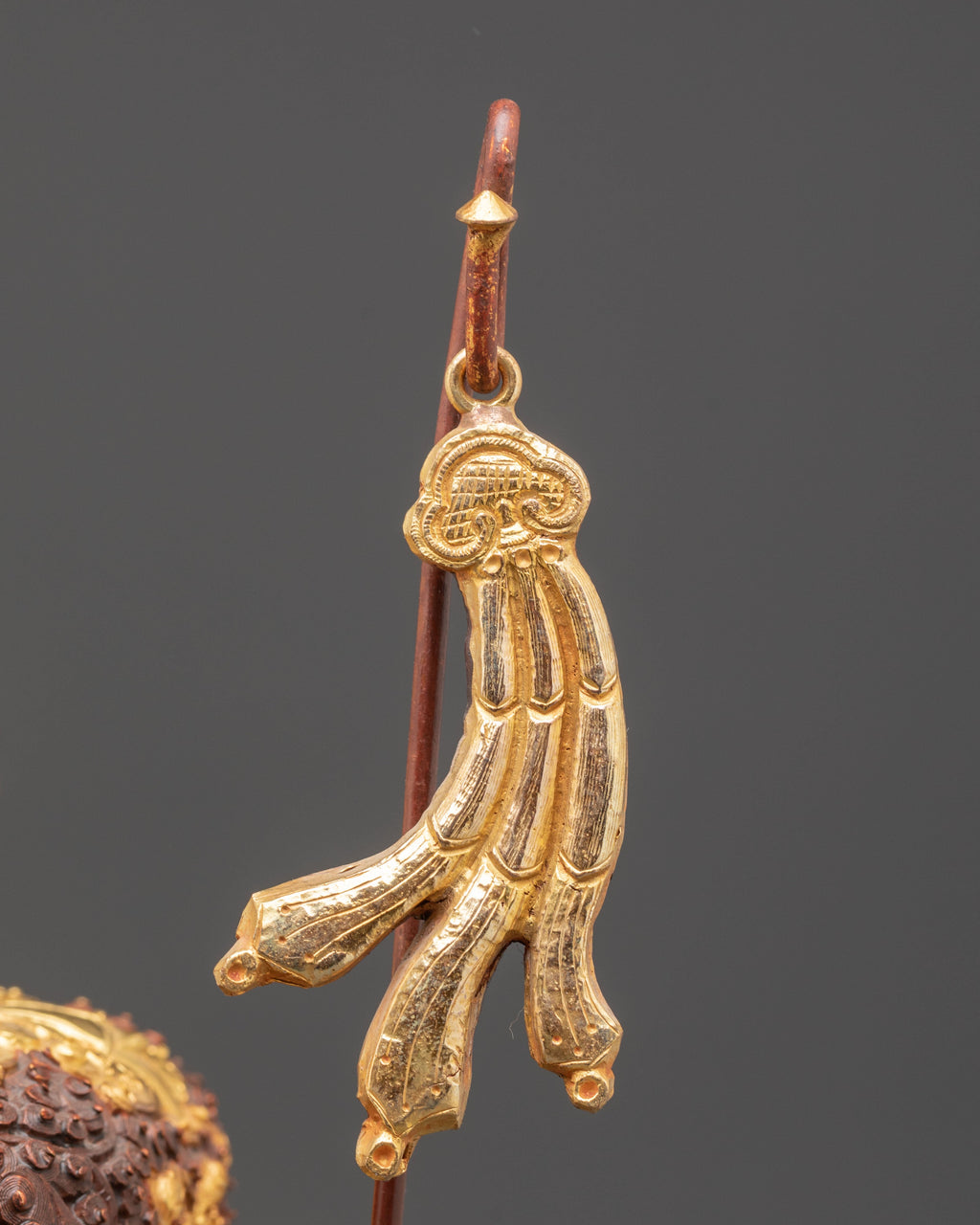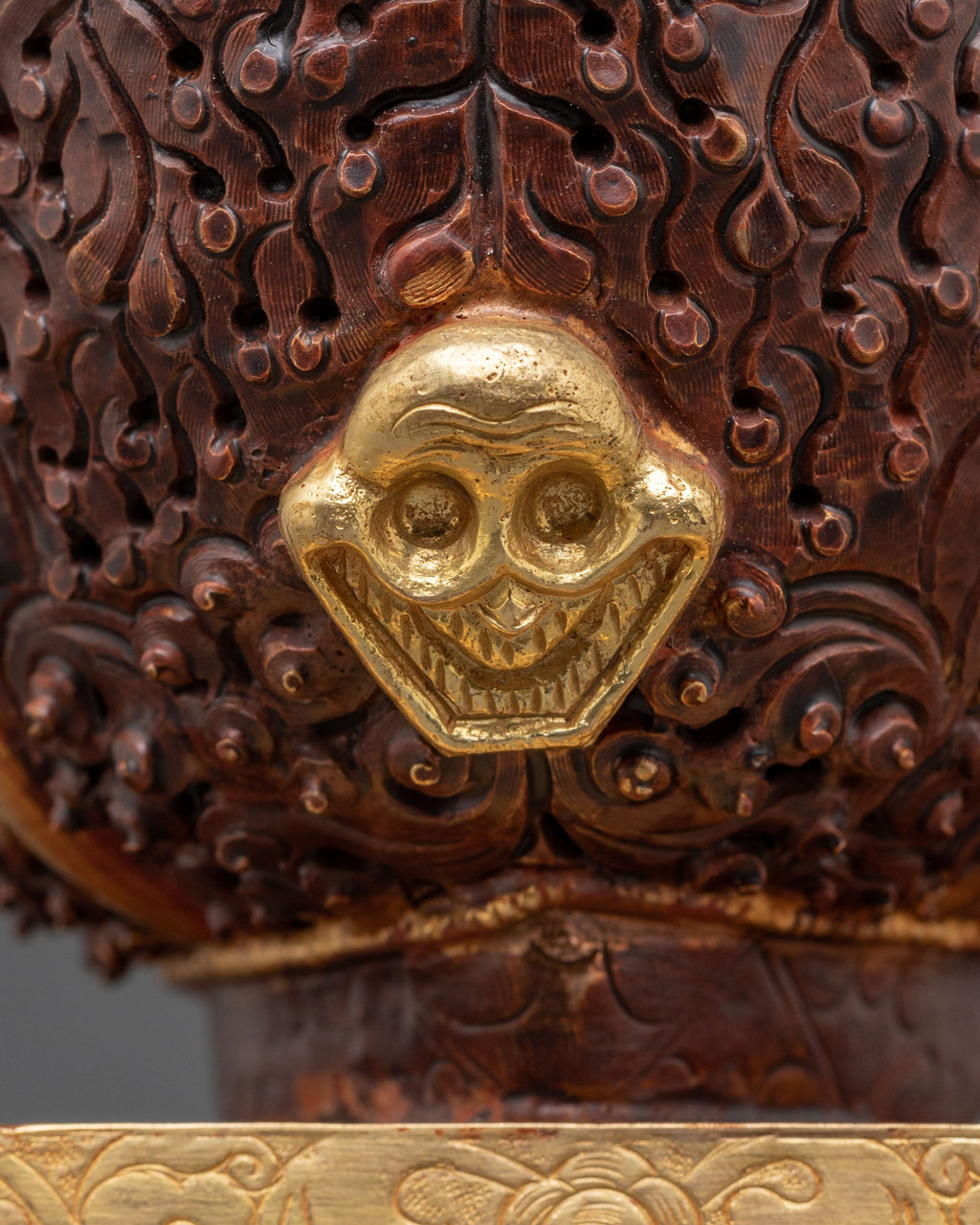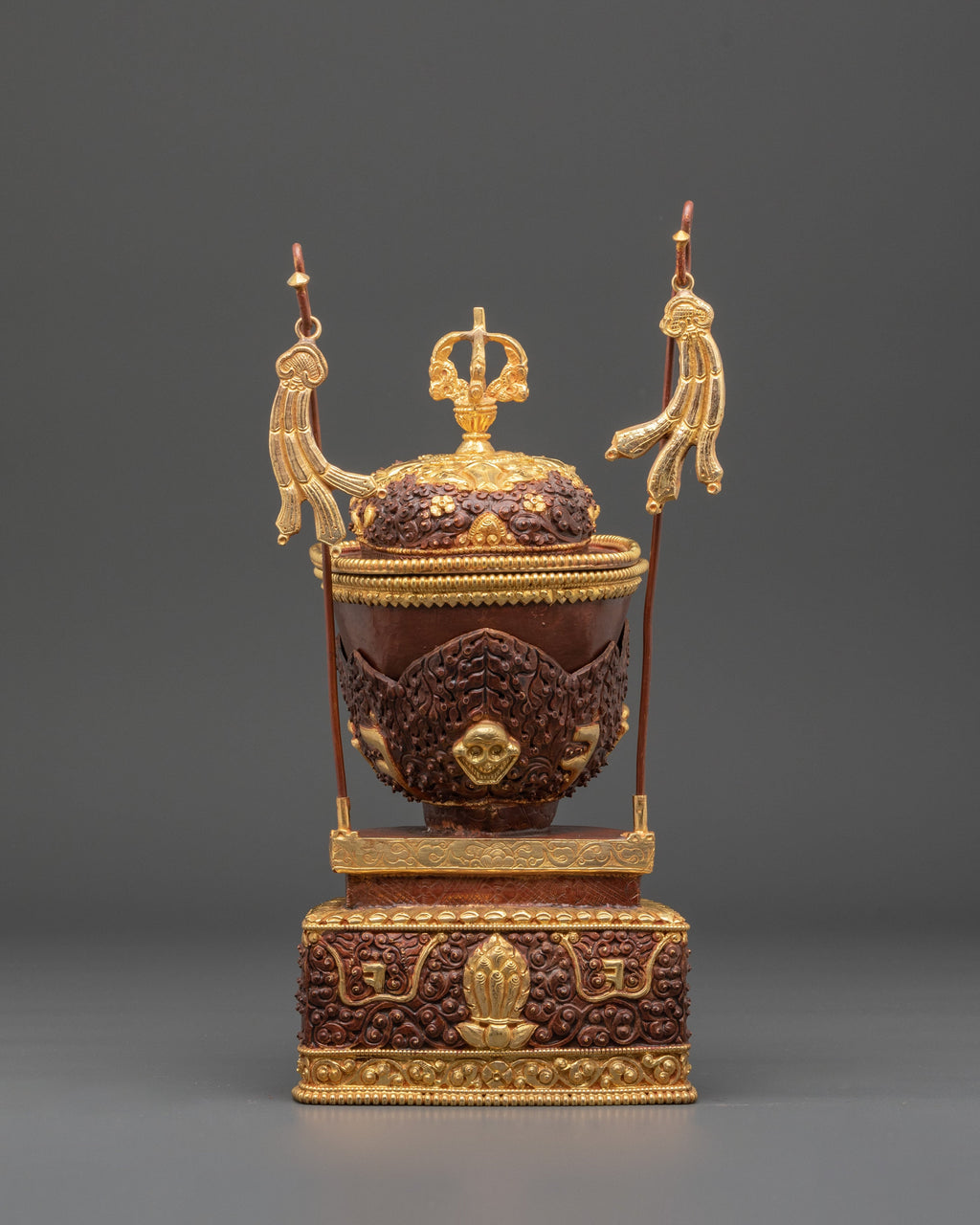 Each piece in this ritual Kapala pair is adorned with intricate carvings and gold embellishments, showcasing motifs inspired by Himalayan deities and auspicious emblems. The bowl rests on a decorative pedestal base, symbolizing stability and reverence. At the same time, the upper section is crowned with an ornate lid and flags that represent the victory of wisdom over ignorance. The deep copper hue, enhanced by acrylic color detailing, gives the set a regal appearance, while the gold-plated accents radiate spiritual brilliance.