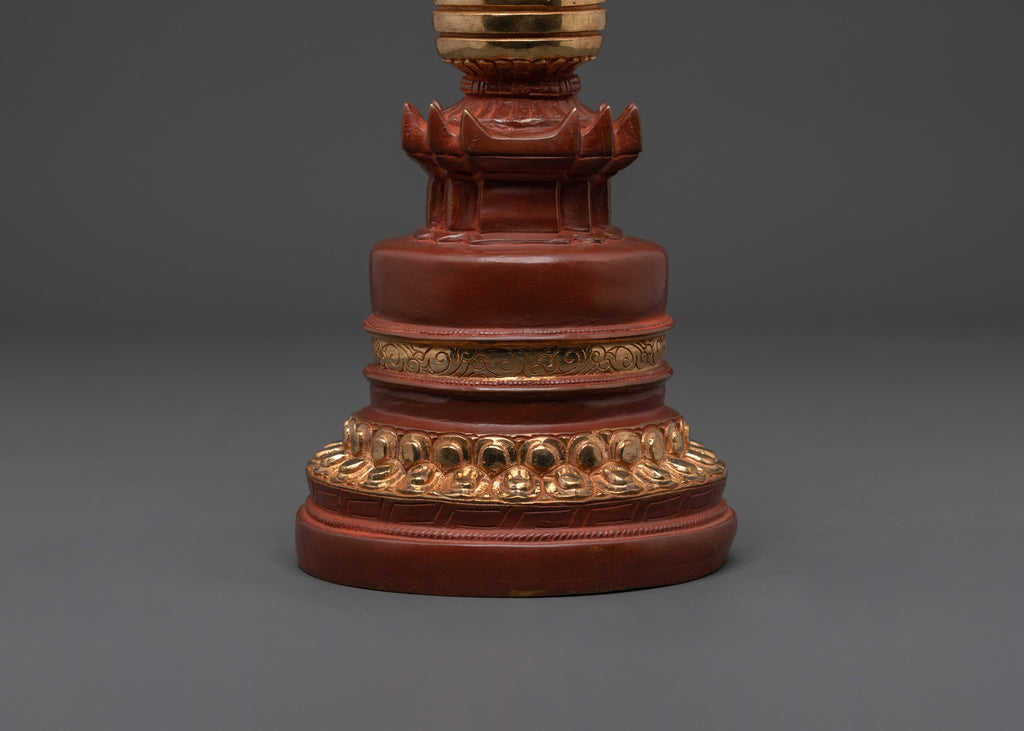 Meticulously handcrafted, each stupa is a masterpiece showcasing fine details that highlight its spiritual importance. Constructed from copper and finished with a radiant gold plating, it brings both sophistication and cultural depth to your space. Ideal for those looking to embrace Buddhist wisdom, this stupa promotes tranquility and harmony in any setting. Weighing 1.56kg, it offers a solid and enduring presence, making it a meaningful and lasting addition to your spiritual collection.