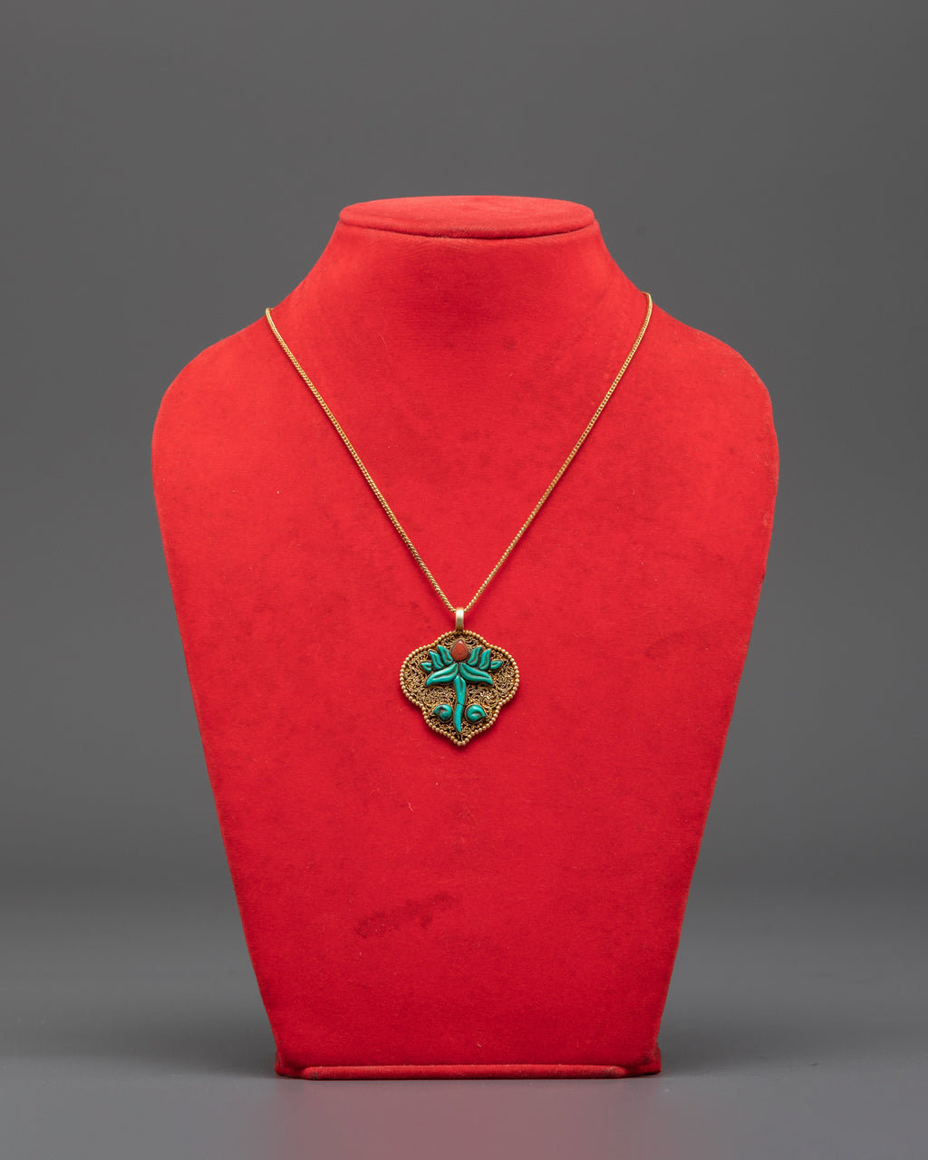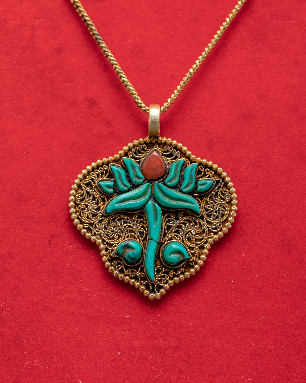 This Handmade Gold Plated Turquoise Floral Pendant showcases exquisite craftsmanship, featuring a stunning floral design that brings the beauty of nature into a wearable form. The pendant is intricately adorned with turquoise stones, carefully arranged to form a blossoming flower, complemented by artificial coral at the center. The gold-plated silver setting enhances the delicate detailing of the flowers and leaves, creating a piece of jewelry that exudes elegance and charm. The vibrant turquoise, paired with the deep red coral accents, adds a bold yet harmonious color contrast to the design.