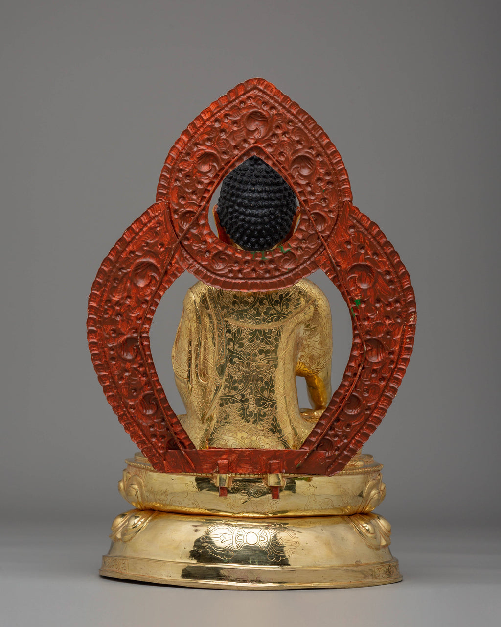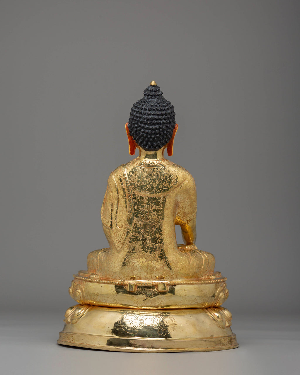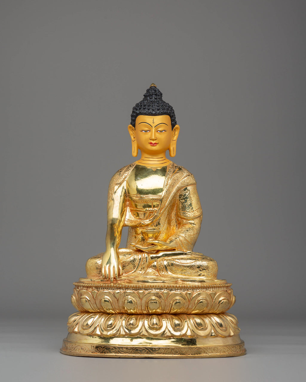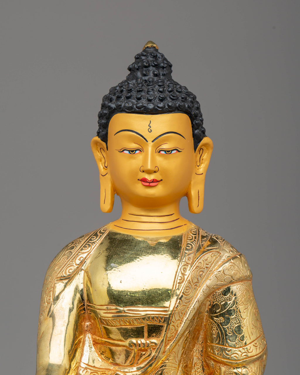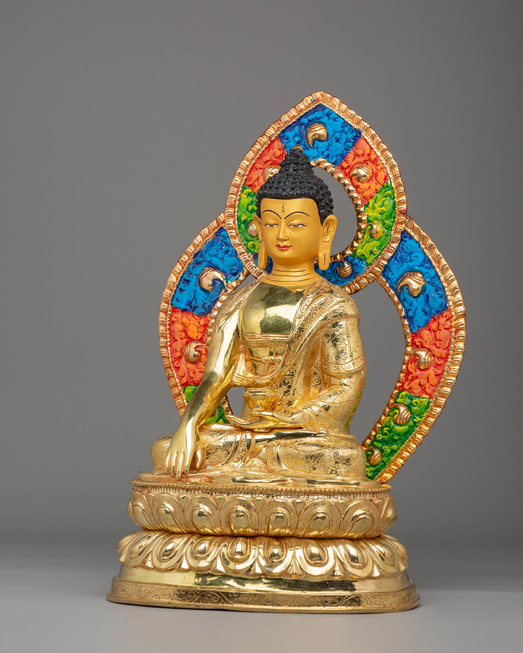 Presenting the exquisite Shakyamuni Buddha Statue, a stunning representation of peace, wisdom, and spiritual awakening. Standing at 41 cm in height and 26 cm in width, weighing 3.97 kg, this statue is meticulously crafted from copper and adorned with luxurious 24K gold gilding. The gold highlights the divine nature of Shakyamuni Buddha, while the vibrant acrylic colors accentuate every intricate detail, bringing the statue to life. Whether displayed in your home, meditation room, or altar, this statue serves as a reminder of the Buddha’s teachings and the path to enlightenment.