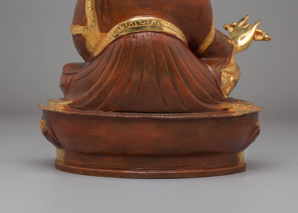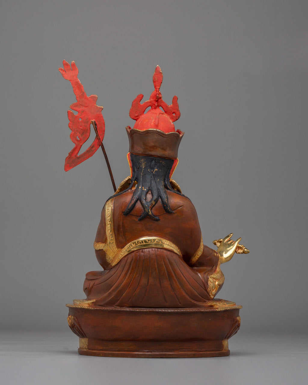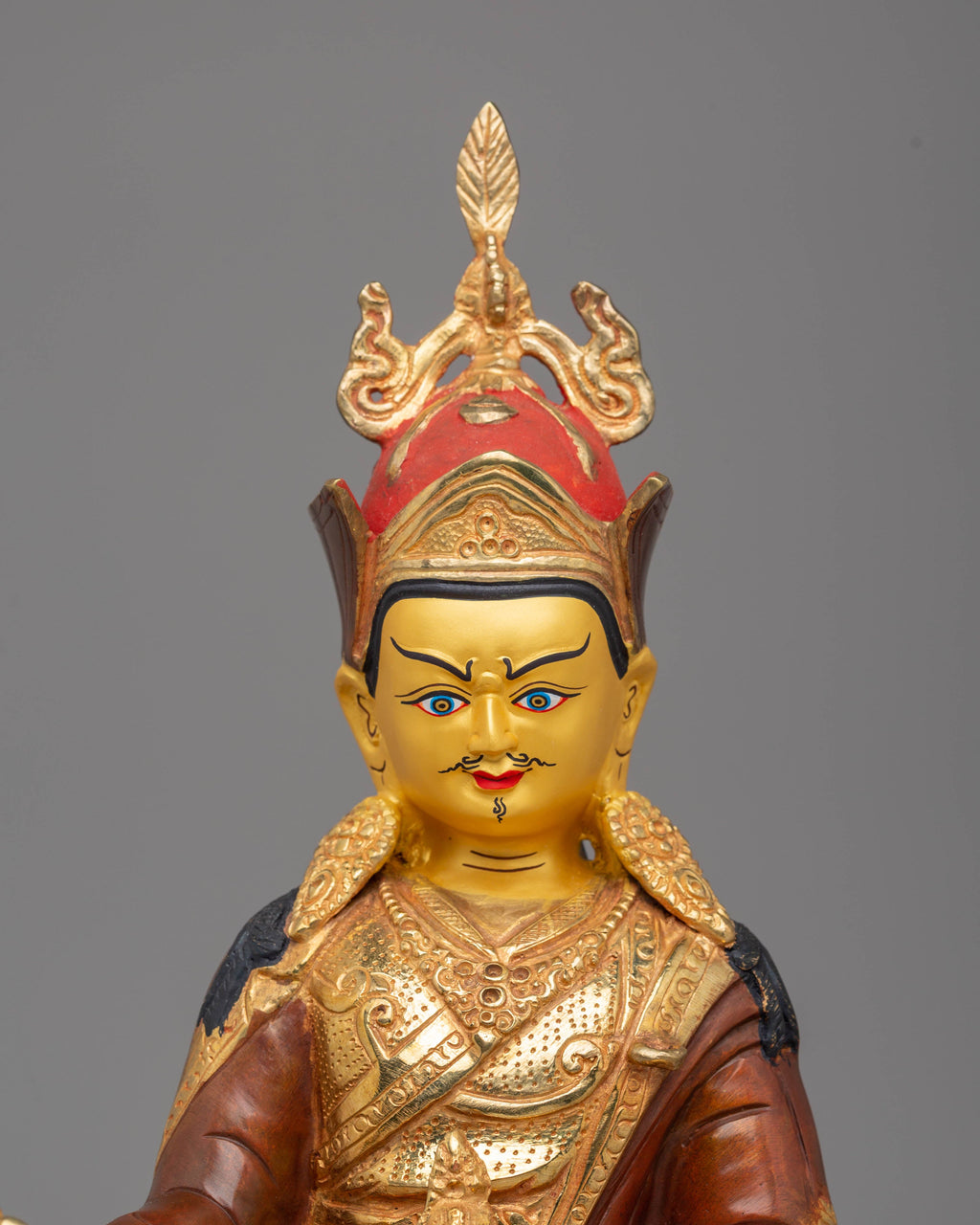 The Guru Rinpoche statue is rich in symbolic iconography, each element representing his profound teachings and spiritual power. In his right hand, he holds a Vajra, symbolizing indestructible truth and the unshakable power of enlightenment. His left hand holds a Kalasha, a sacred vessel of immortality and abundance, representing the nourishment of the body and spirit. The Khattvanga, a staff held in his other hand, signifies his mastery over worldly and spiritual realms, symbolizing the unity of wisdom and compassion. The lotus base on which Guru Rinpoche sits represents purity, as the lotus rises from the mud untouched by it, much like the path of enlightenment. His hat, often depicted as a scholar’s cap, symbolizes his role as a spiritual teacher and master of tantric wisdom. Together, these elements capture the essence of Guru Rinpoche’s profound wisdom and spiritual guidance.