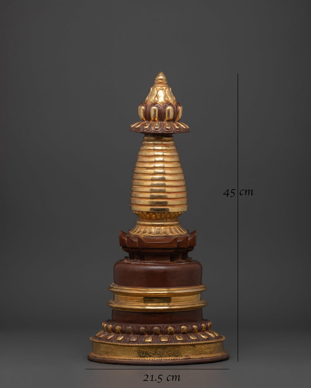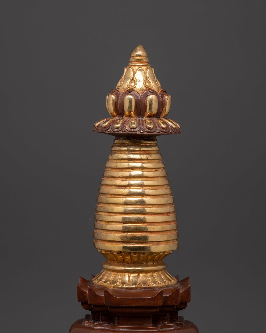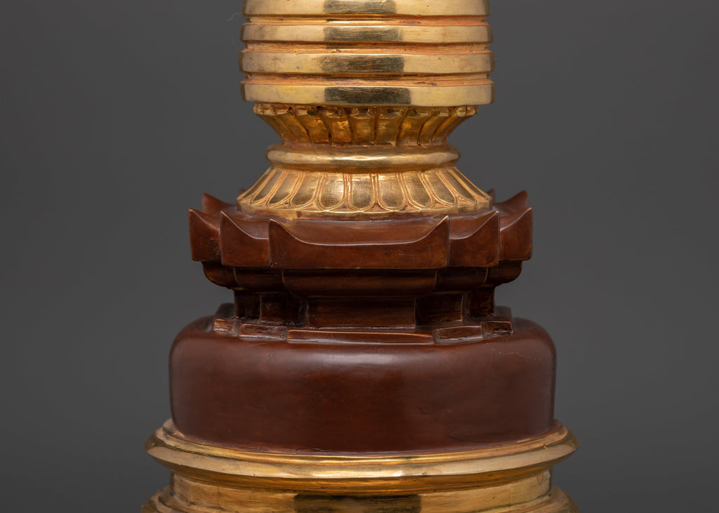 The design of the Handmade Golden Stupa features a distinct, layered structure with a finely shaped gold-plated top, symbolizing the path to enlightenment. The stupa's copper body is highlighted with vibrant acrylic colors that add depth and dimension, further enhancing the spiritual symbolism. The gold plating gives the stupa an aura of sacredness, symbolizing the Buddha's enlightenment. The lower sections of the stupa are adorned with decorative patterns and motifs, reflecting the art and traditions of Tibetan Buddhist architecture.