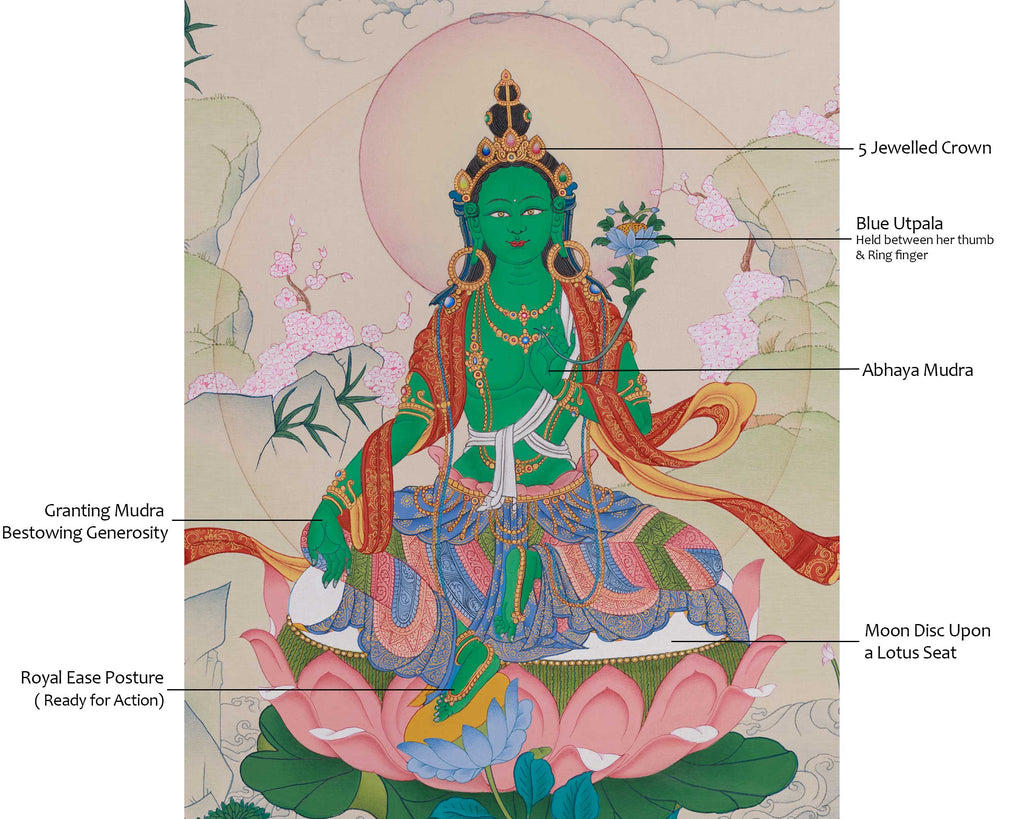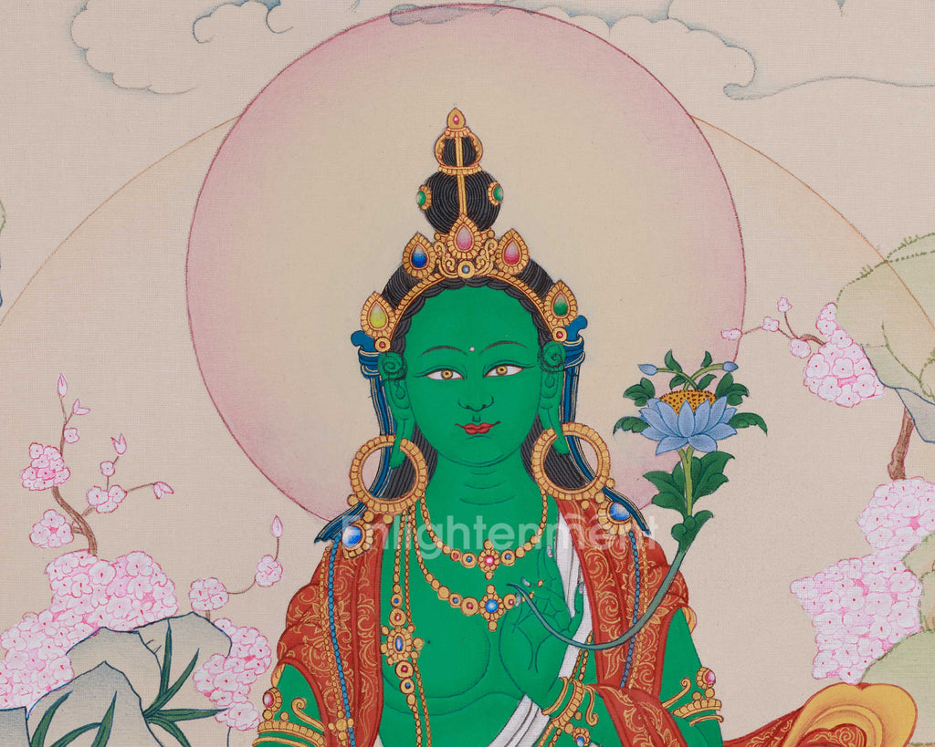 This exquisitely handmade Green Tara painting is created on fine cotton canvas, utilizing natural stone pigments and authentic 24K gold. The warm, earthy tones of the stones evoke a sense of comfort and profundity, while the shimmering gold accents impart a divine luminosity to Tara's form, emphasizing her sacred presence. Executed in the traditional Karma Gadri style, this thangka exemplifies the elegance and mastery inherent in Tibetan artistry, rendering it an exceptional piece of spiritual and visual significance. Green Tara, also known as Shyamatara, is a revered symbol of compassion, healing, and protection within Tibetan Buddhism. She is venerated for her swift intervention in alleviating the suffering of all sentient beings. Her mantra—"Om Tare Tuttare Ture Soha"—is recited to invoke her blessings for peace and safety.