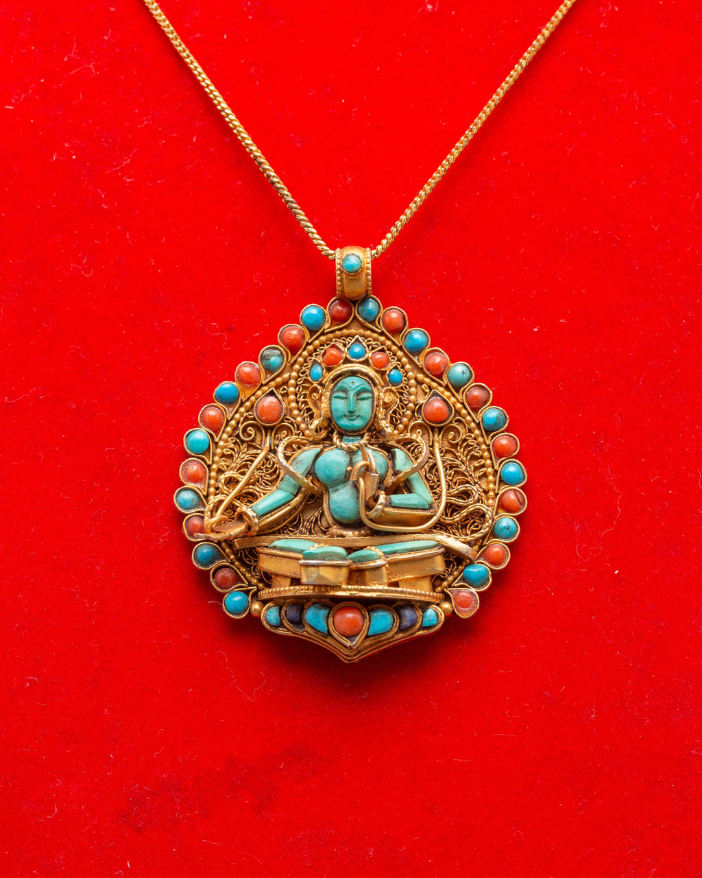 The locket is embellished with lapis lazuli, coral, and turquoise stones, each of which holds significant value in Tibetan Buddhism. Lapis lazuli indicates wisdom, coral represents energy and power, and turquoise encourages healing and emotional harmony. These stones surround the precise image of Green Tara, who is seen seated in a meditation stance with her hands in gestures of peace and blessing. The combination of these stones and the excellent craftsmanship results in a visually striking piece of jewelry that holds deep spiritual meaning.