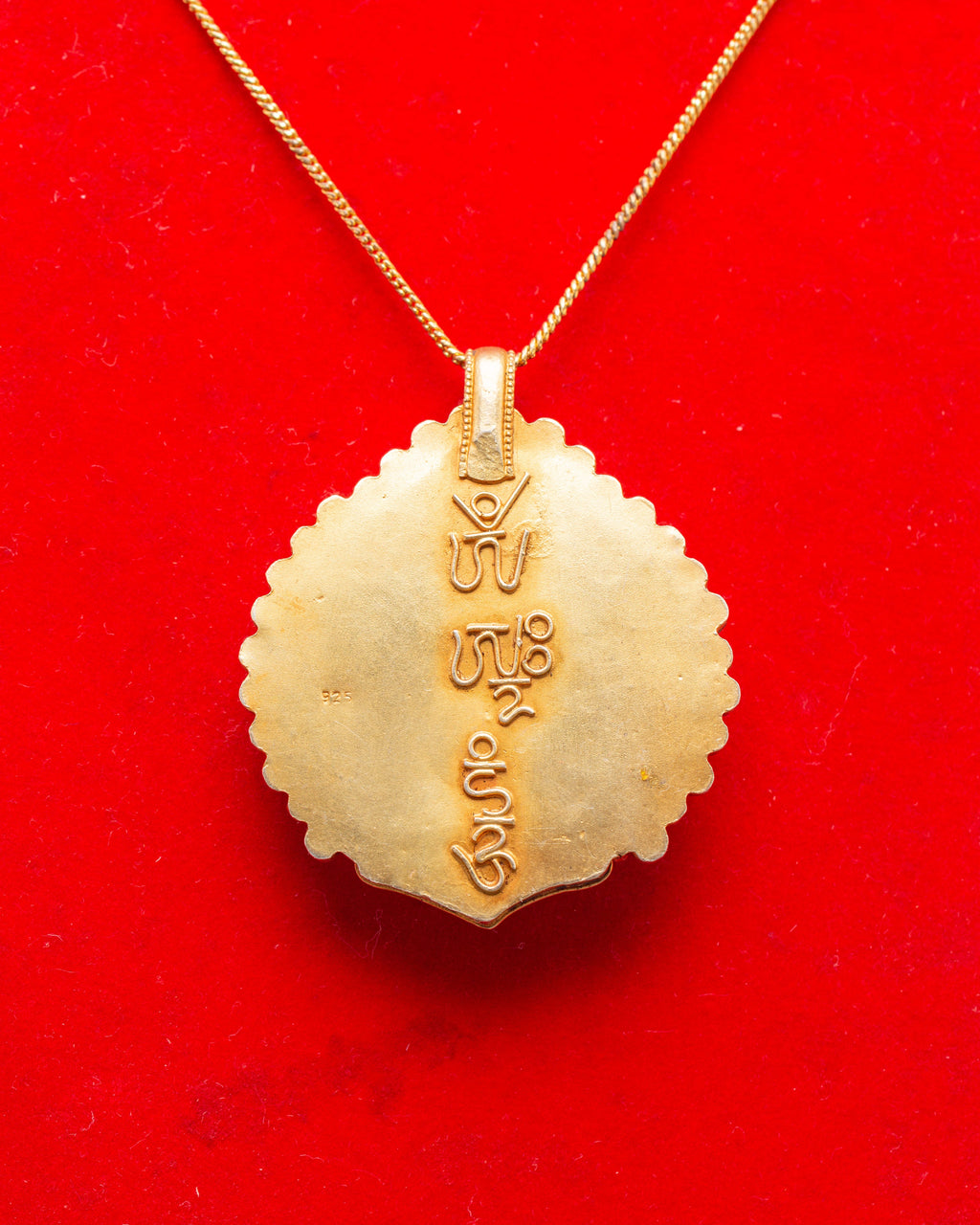 A Buddhist locket is a piece of jewelry designed to hold a small prayer, mantra, or image related to Buddhist practice. The locket may feature a design or image of a Buddhist deity, such as the Buddha, or a representation of a sacred symbol, like the lotus flower. It is typically worn as a talisman to remind the wearer of their spiritual path and to offer protection. Some Buddhist lockets are also used as a form of religious devotion and are frequently given as gifts to friends and family members to provide them with spiritual support and blessings.