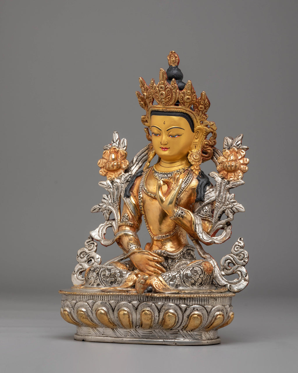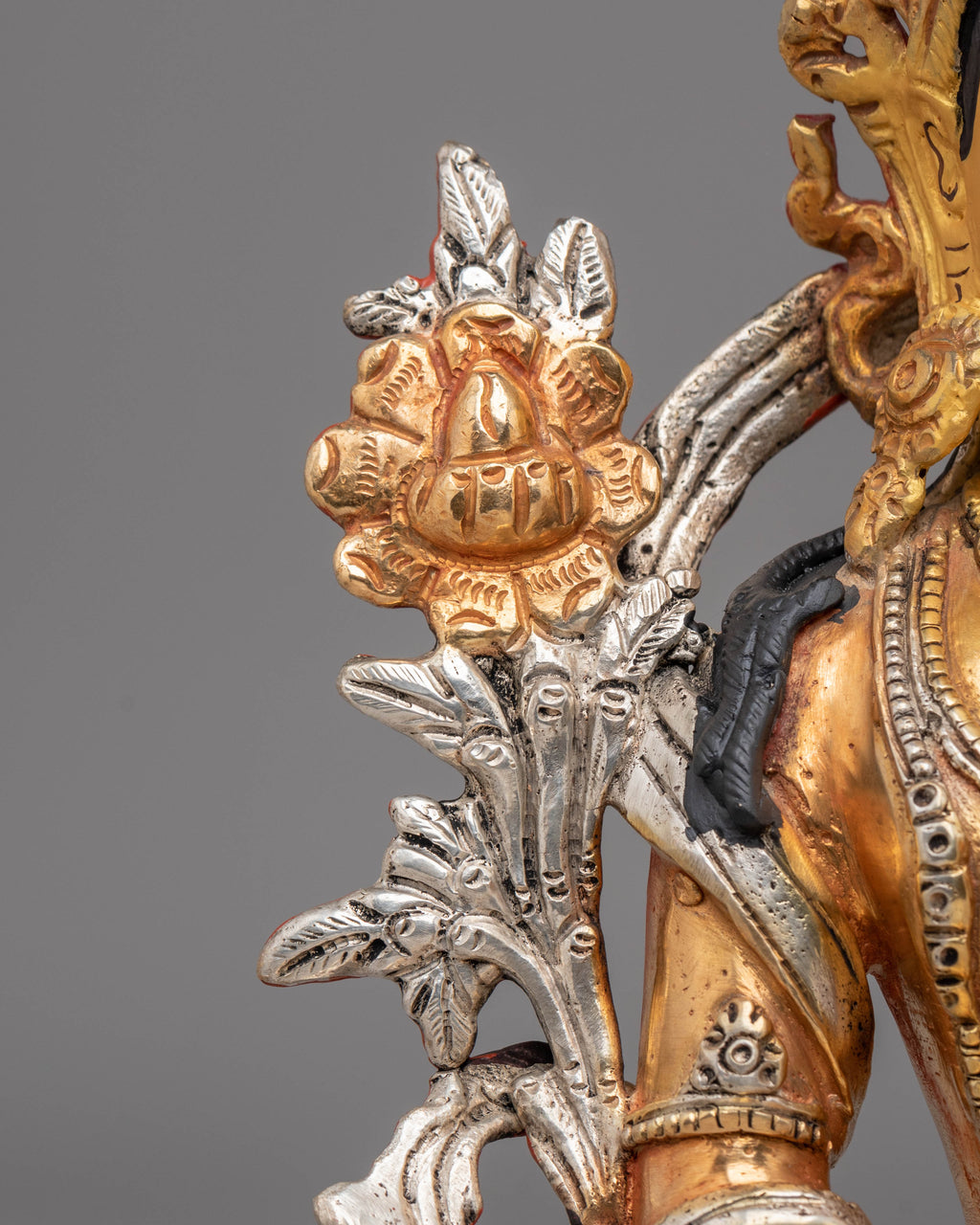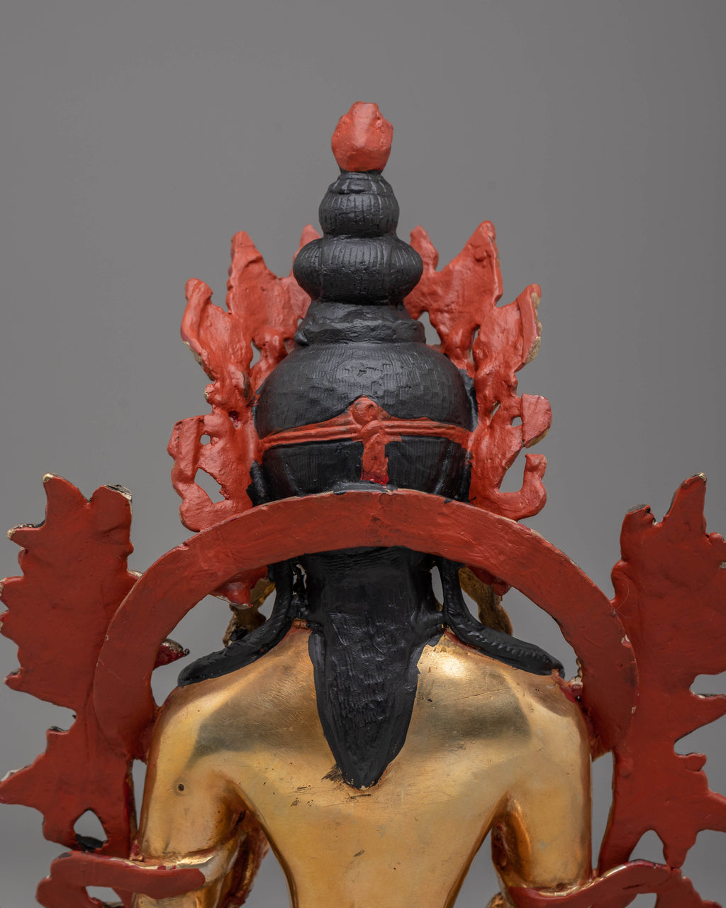 This Copper Statue of Lokeshwor: The Compassionate Bodhisattva depicts Lokeshwor seated in lalitasana, exuding grace and serenity. His right hand is holding a delicate lotus flower, while his left hand rests behind his left leg. He is shown stepping on an upataala with his right leg, symbolizing poised movement and spiritual readiness. Adorned with a five-pointed crown and seated on a lotus base, this statue beautifully represents the Bodhisattva’s compassionate and enlightened nature.