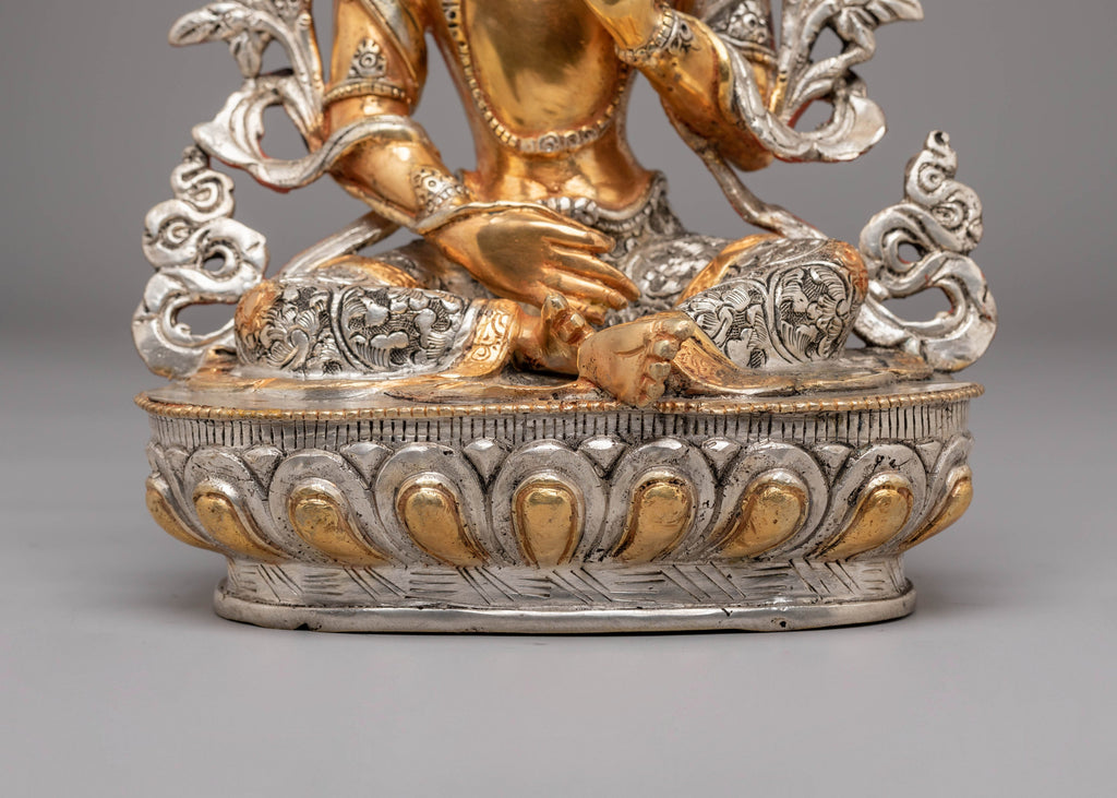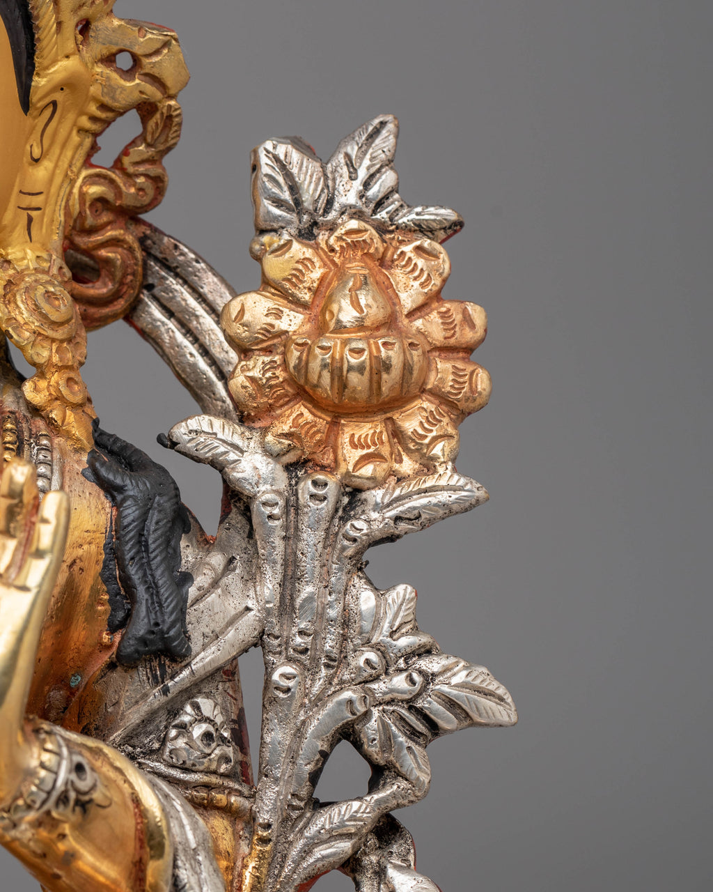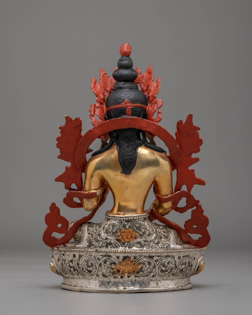 The Handmade Lokeshwor Spiritual Statue is a remarkable representation of compassion, wisdom, and spiritual grace. Crafted from copper and adorned with electro gold and silver plating, it exudes divine energy and tranquility. Standing 31.5 cm tall and 22 cm wide, this statue is meticulously hand-painted with acrylic colors, capturing the intricate details of Lokeshwor's serene expression and elegant posture. Lokeshwor, also known as the "Lord of the World," symbolizes boundless compassion and embodies enlightenment. This statue serves as a powerful focal point for meditation, prayer, and contemplation, helping to deepen one's connection to the divine and cultivate inner peace.