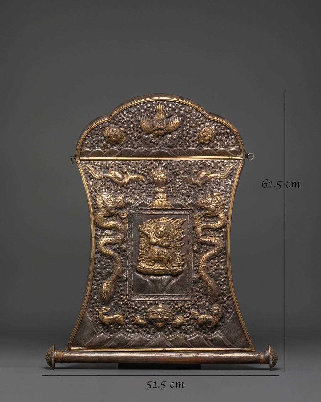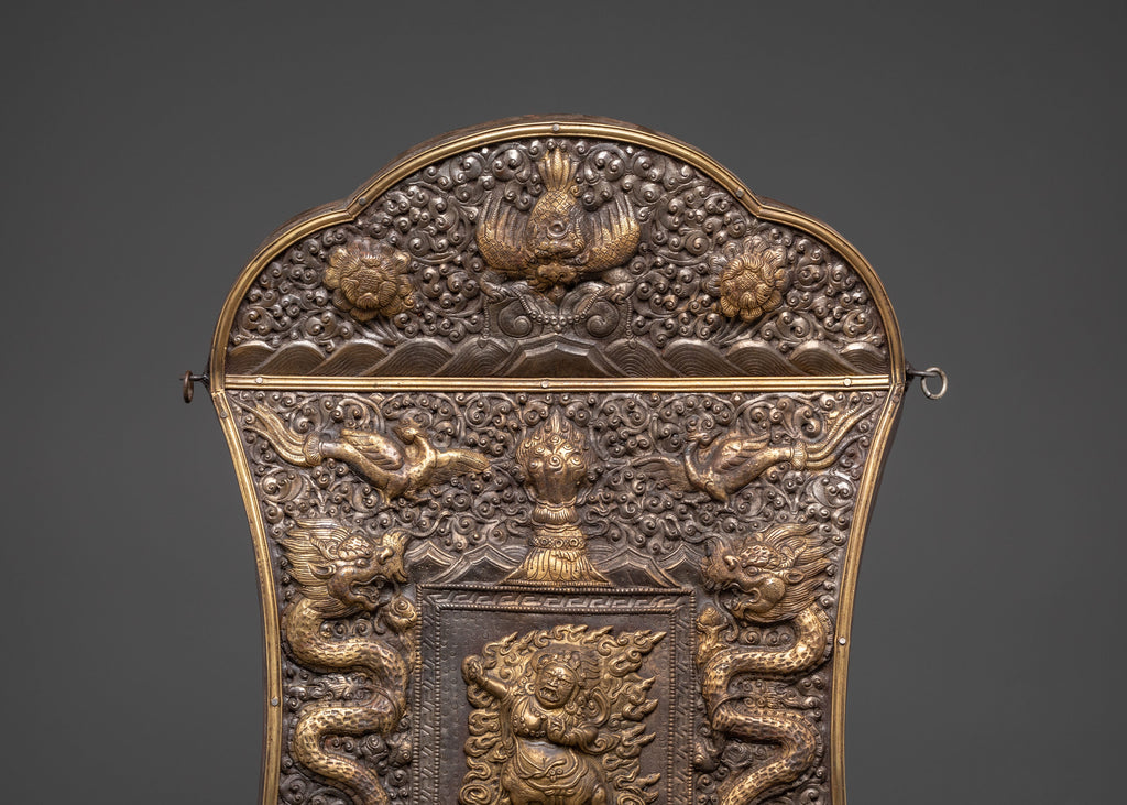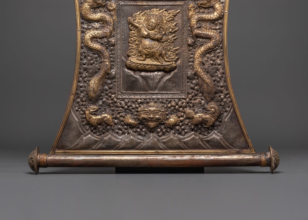 The combination of iron and brass adds depth to the relief work, making every detail—from Mahakala’s fierce features to the entwining dragon designs—stand out with vivid clarity. This sacred wall hanging not only serves as a powerful art piece but also as a profound symbol of protection, making it an ideal addition to meditation spaces, prayer rooms, or any setting dedicated to spiritual growth.