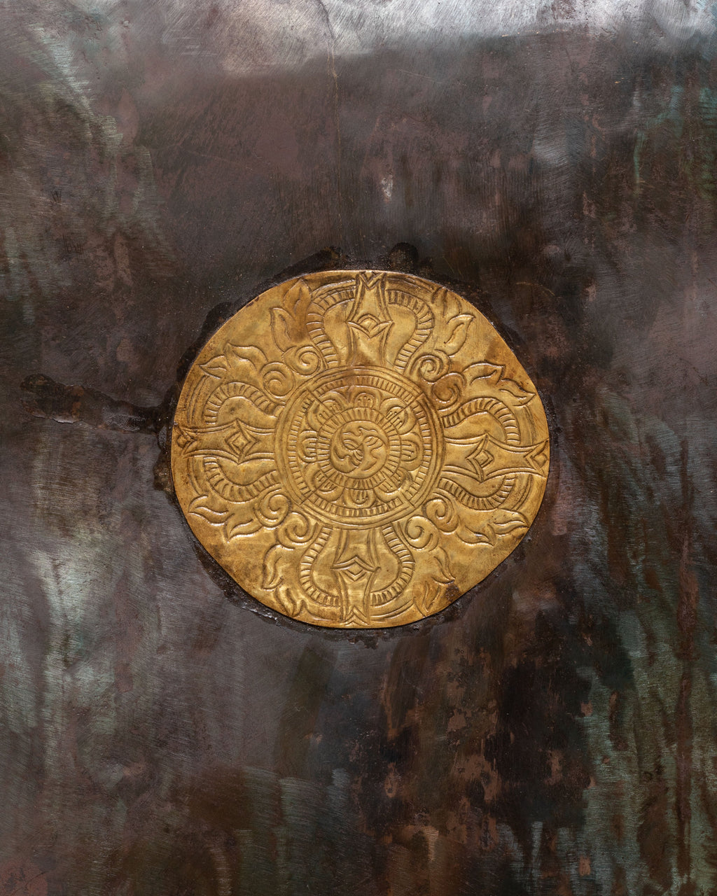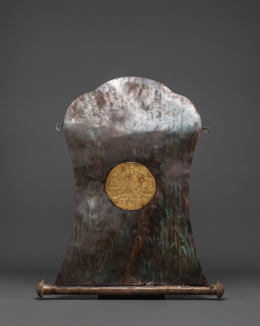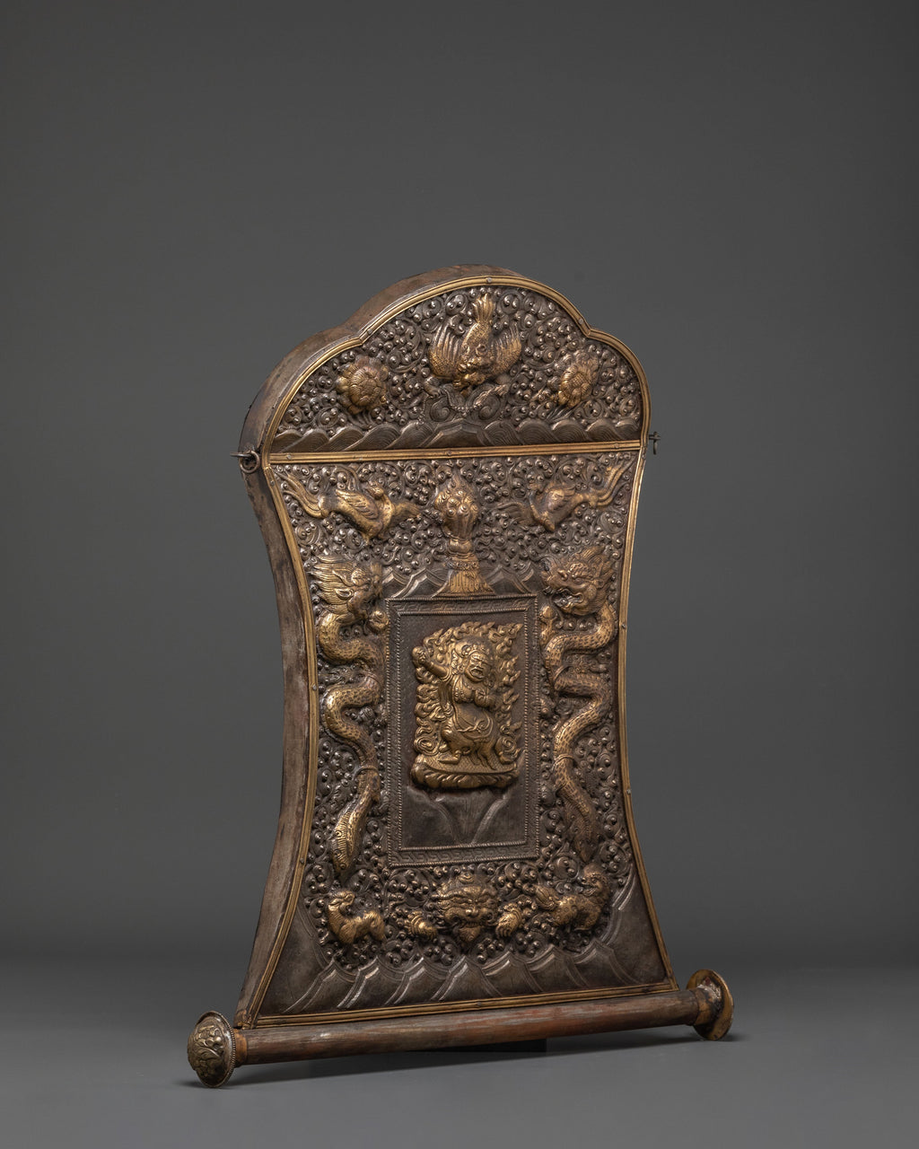 The combination of iron and brass adds depth to the relief work, making every detail—from Mahakala’s fierce features to the entwining dragon designs—stand out with vivid clarity. This sacred wall hanging not only serves as a powerful art piece but also as a profound symbol of protection, making it an ideal addition to meditation spaces, prayer rooms, or any setting dedicated to spiritual growth.