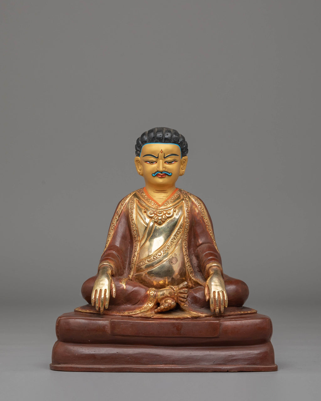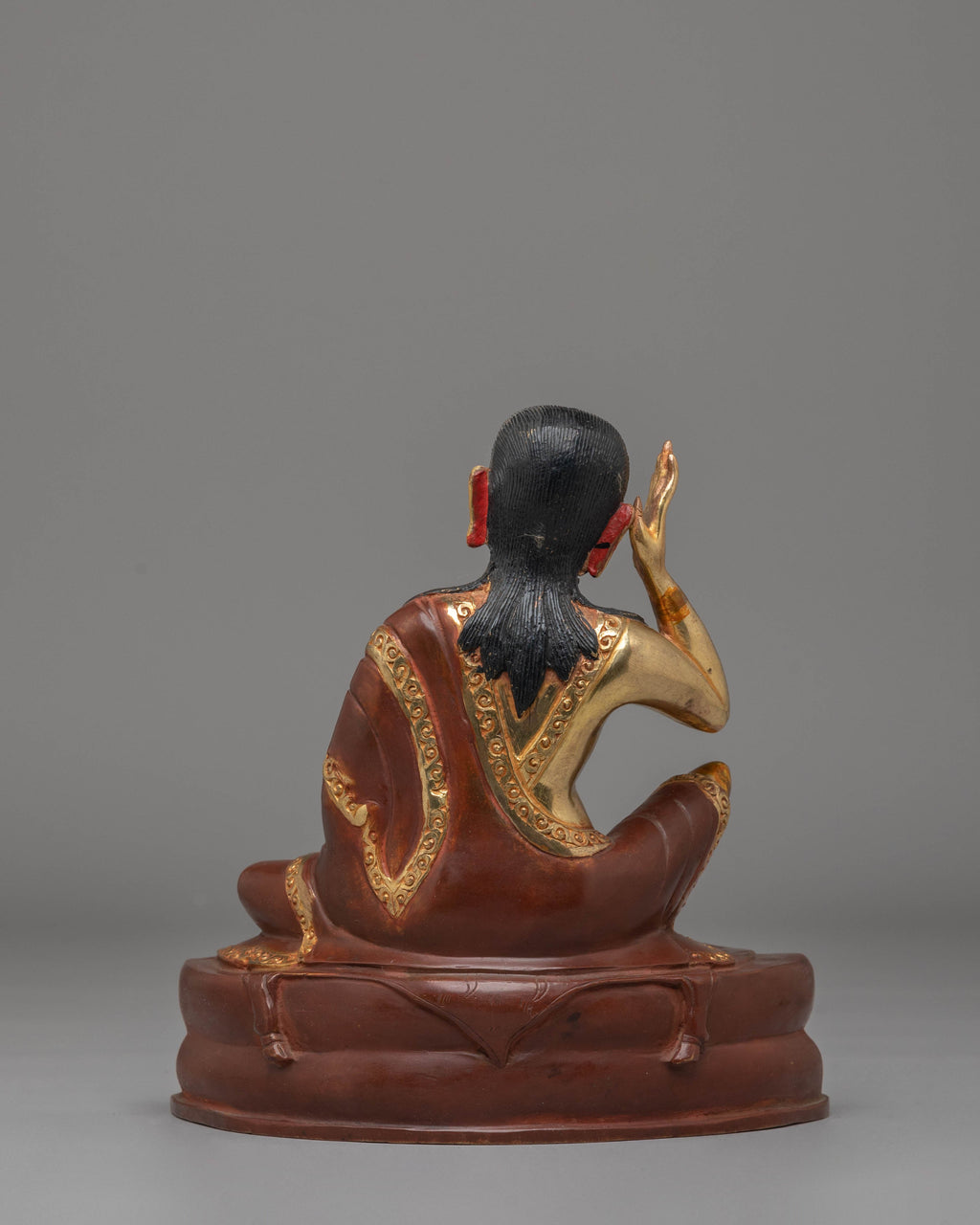 The sculptures capture the essence of each enlightened master through intricate details. Milarepa is depicted seated in meditation, symbolizing his deep wisdom and spiritual practice. Gomopa is shown holding sacred implements, representing his mastery over advanced tantric teachings. Marpha is portrayed in a contemplative posture, reflecting his profound insight into the Dharma. The combination of 24K gold plating and acrylic color enhances their visual appeal and highlights the fine craftsmanship involved in bringing these revered figures to life.
