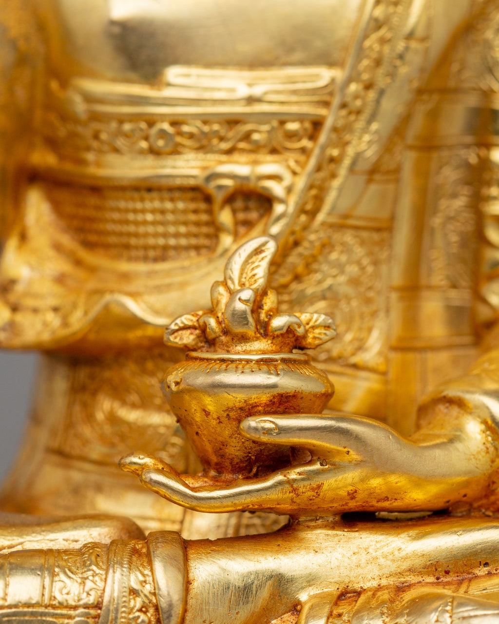 The Medicine Buddha is depicted holding an alms bowl, in which a healing portion is believed to reside. In his right hand, he carries a myrobalan plant, a medical herb that represents his capacity to heal physical and spiritual illnesses. His right arm has an exquisite carving of one of 8 auspicious symbols (Endless Knot). This symbolizes Samsara, the endless cycle of suffering within Tibetan Buddhism, which includes the chain of birth, death, and rebirth. His tranquil visage and powerful aura exude deep compassion and serenity, promising protection and well-being to those who seek his blessing.