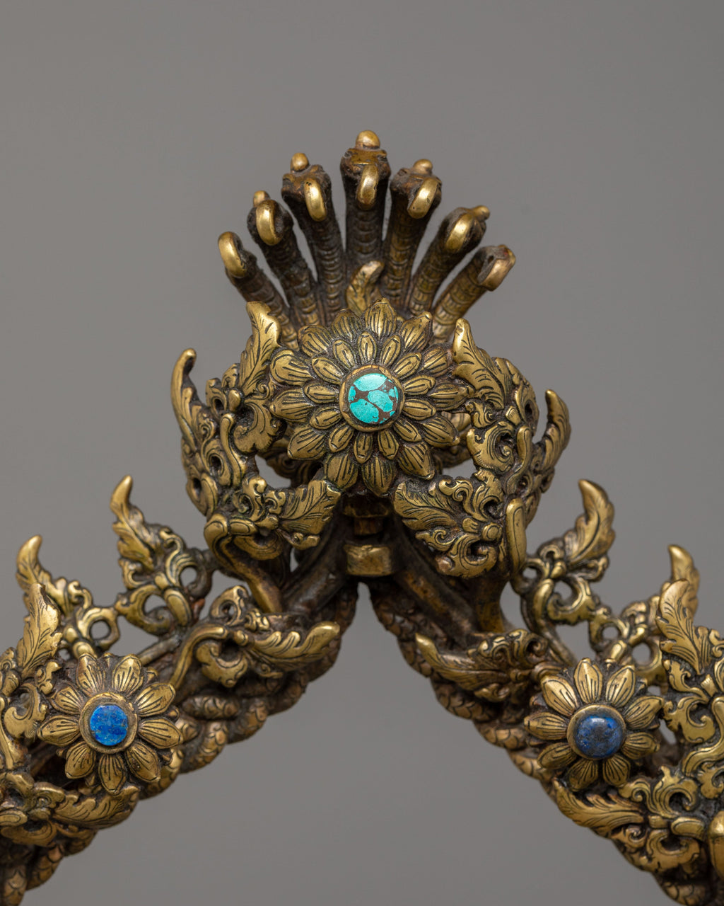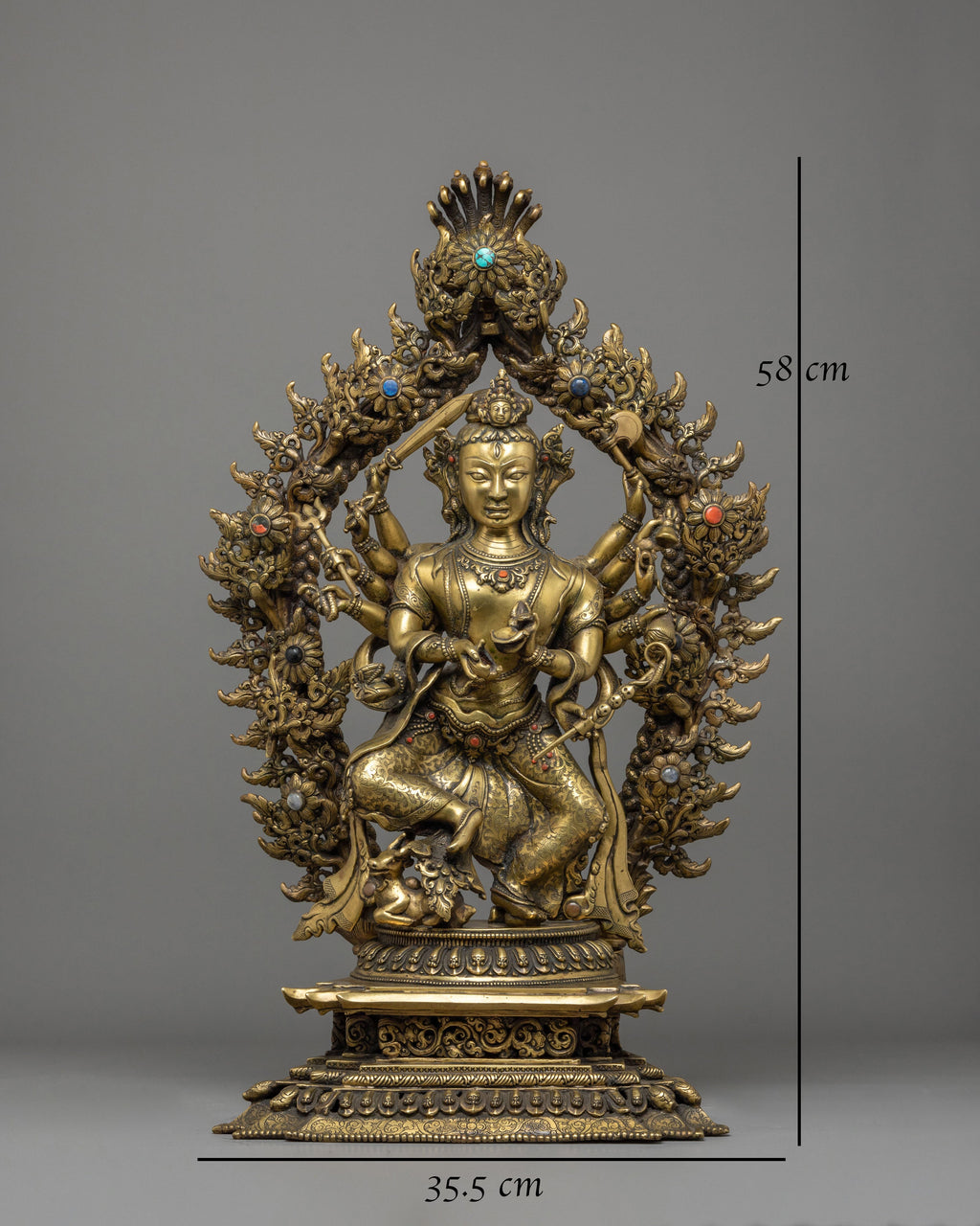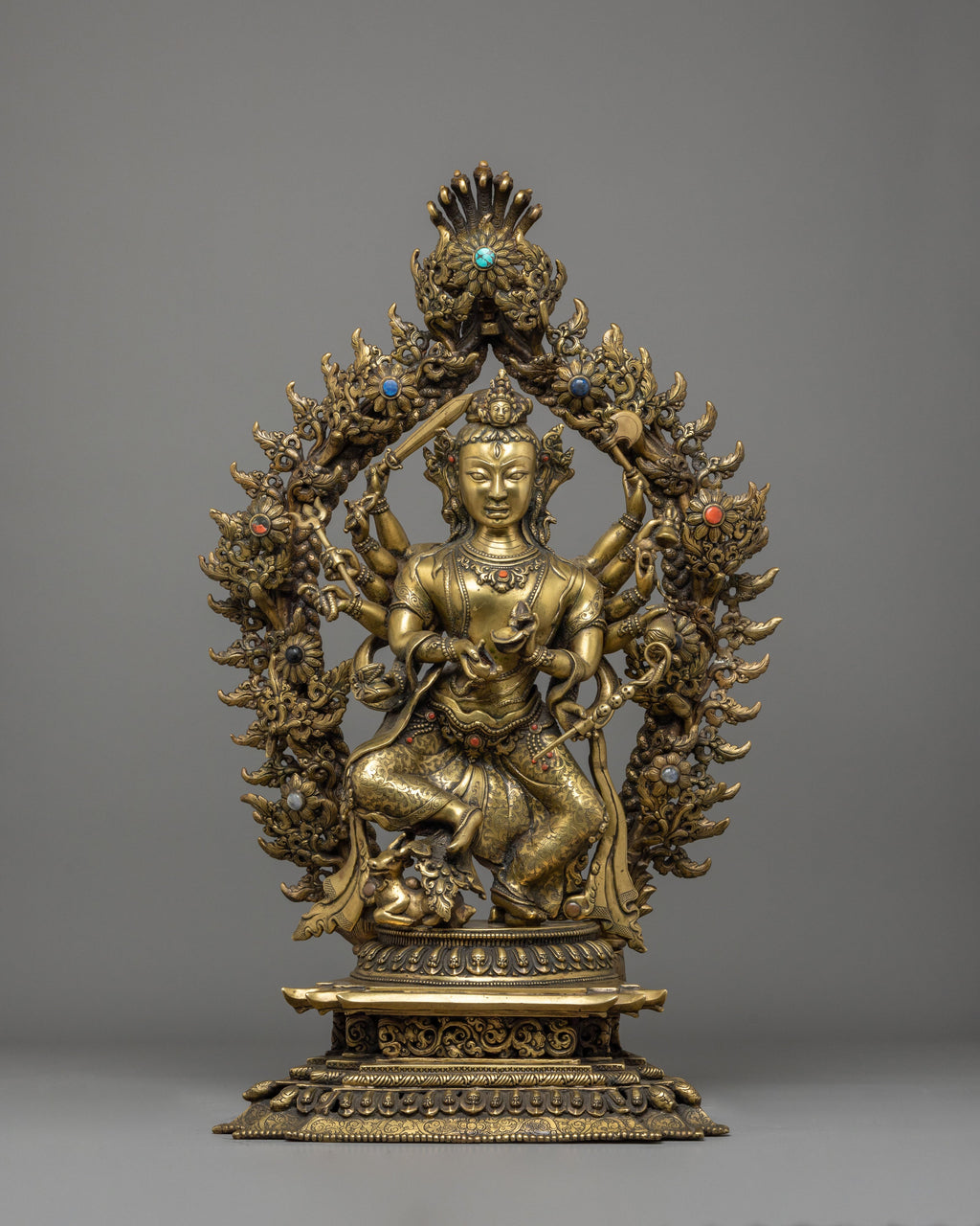 This Handmade Nityanath Shiva Statue with Nandi showcases exceptional craftsmanship, featuring intricate motifs and delicate floral patterns meticulously engraved across Shiva’s attire and the surrounding aureole. The detailed carvings and embedded stones on the aureole symbolize divine radiance and purity, enhancing the statue’s sacred presence. Accompanied by Nandi, the holy bull embodying loyalty, devotion, and spiritual strength, the sculpture reflects profound spiritual significance. Each of Shiva’s multiple hand gestures represents cosmic balance, protection, and the harmonious union of creation and transformation—key principles of Hindu philosophy. This statue is a powerful symbol of devotion and inner peace, perfect for enriching your sacred space or art collection.