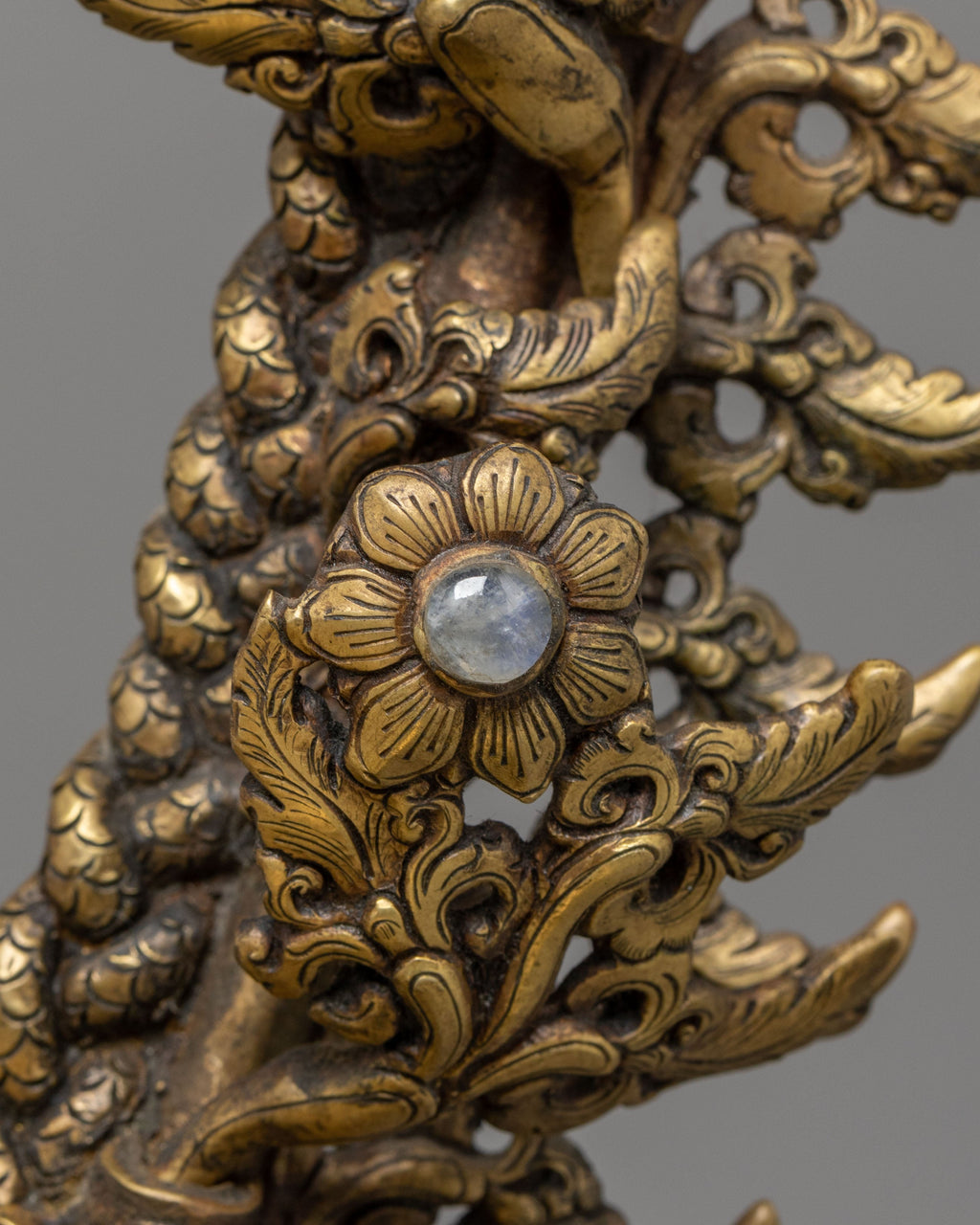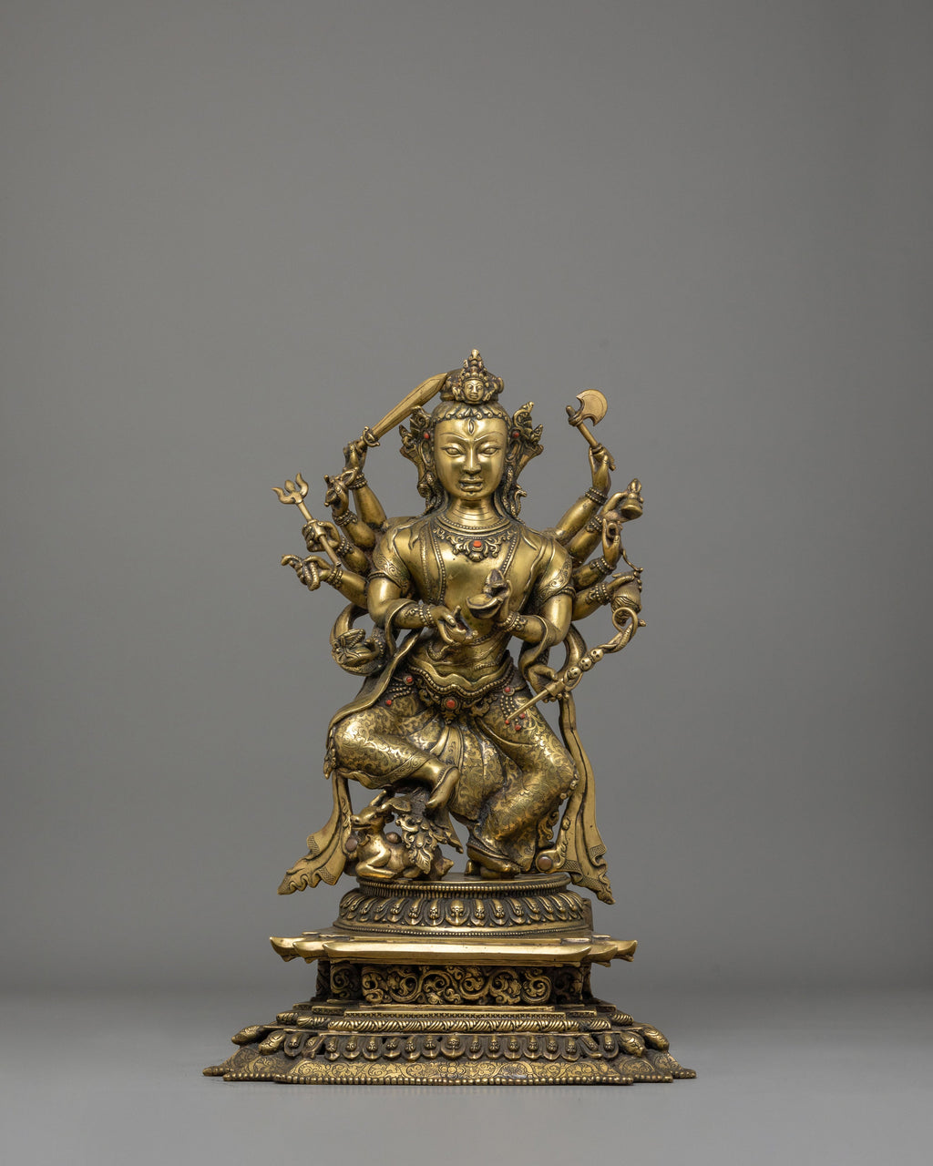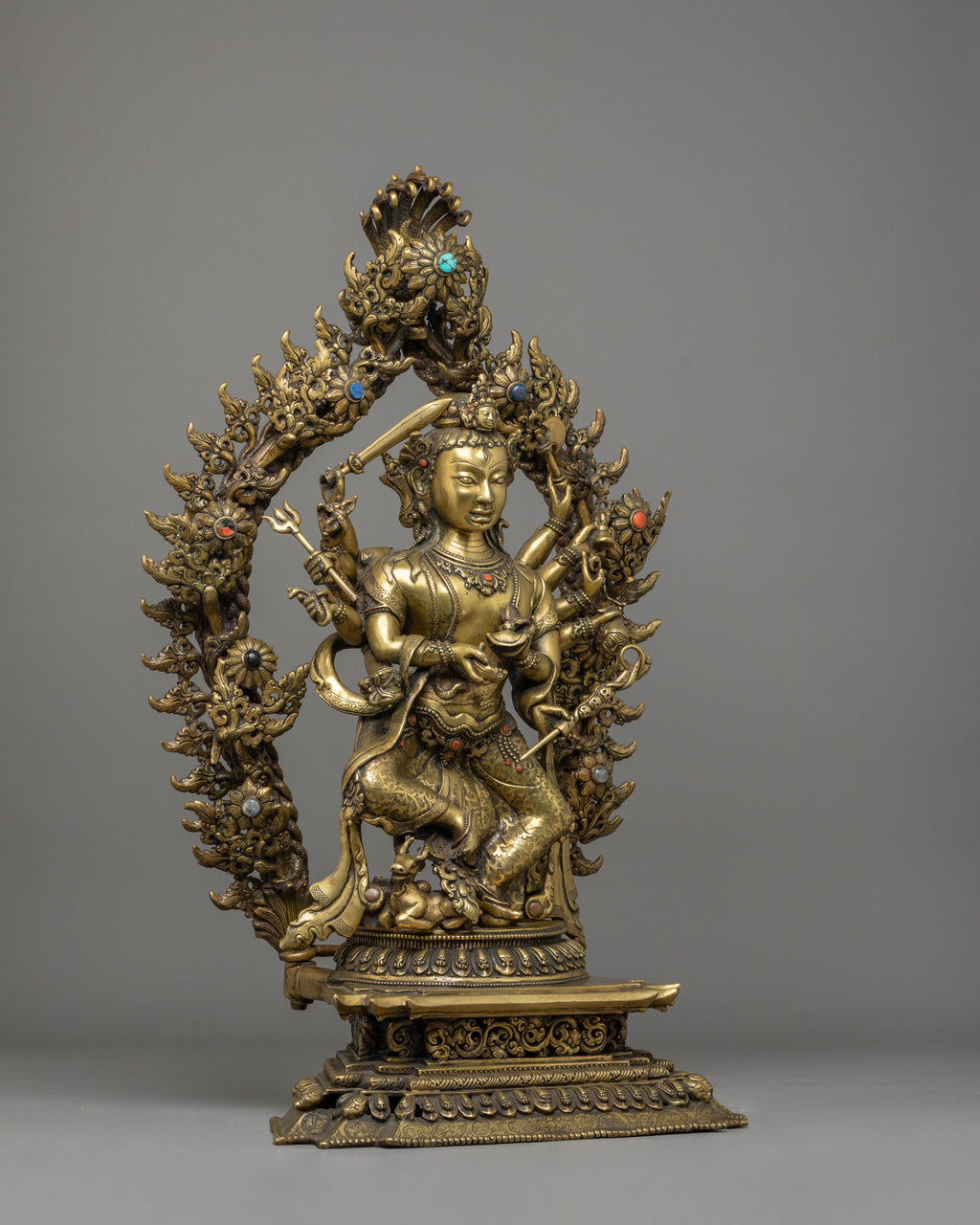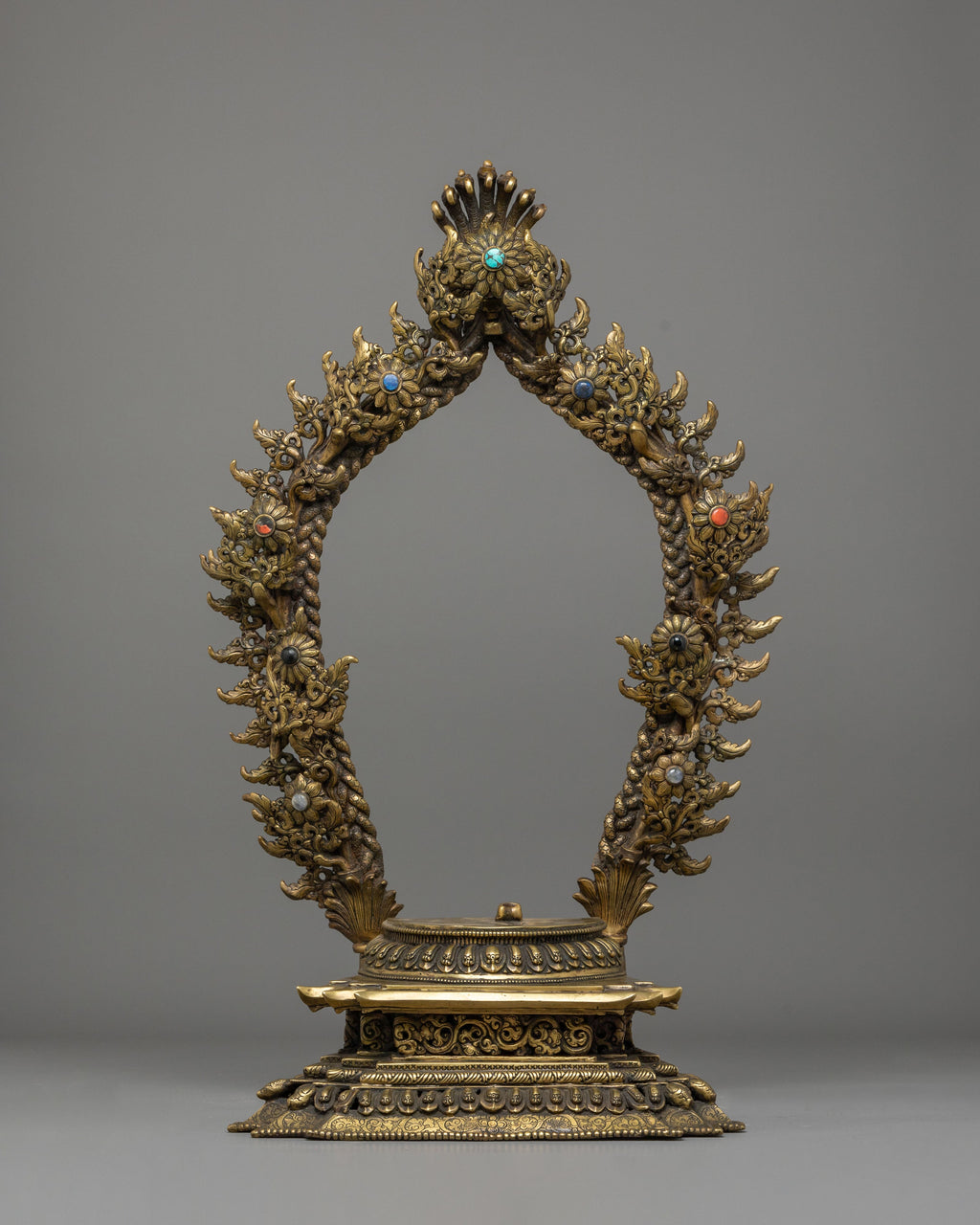 This Handmade Nityanath Shiva Statue with Nandi showcases exceptional craftsmanship, featuring intricate motifs and delicate floral patterns meticulously engraved across Shiva’s attire and the surrounding aureole. The detailed carvings and embedded stones on the aureole symbolize divine radiance and purity, enhancing the statue’s sacred presence. Accompanied by Nandi, the holy bull embodying loyalty, devotion, and spiritual strength, the sculpture reflects profound spiritual significance. Each of Shiva’s multiple hand gestures represents cosmic balance, protection, and the harmonious union of creation and transformation—key principles of Hindu philosophy. This statue is a powerful symbol of devotion and inner peace, perfect for enriching your sacred space or art collection.