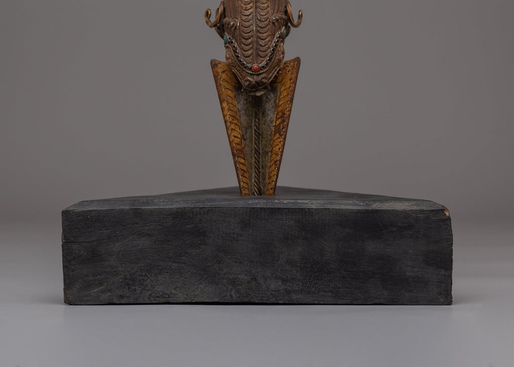 The Vajra at the top of the Handmade Phurba with Vajra is not only a symbol of divine power but also represents the symbol of enlightenment in Buddhism. Often referred to as the thunderbolt or diamond weapon, it signifies the unshakable nature of Buddha's teachings. The Phurba itself is associated with the deity Hayagriva, a powerful tantric deity known as the Horse-headed Wisdom Lord. Hayagriva is revered for his ability to destroy obstacles and purify spiritual blockages, making this Phurba with Vajra an essential tool for spiritual purification and empowerment.
