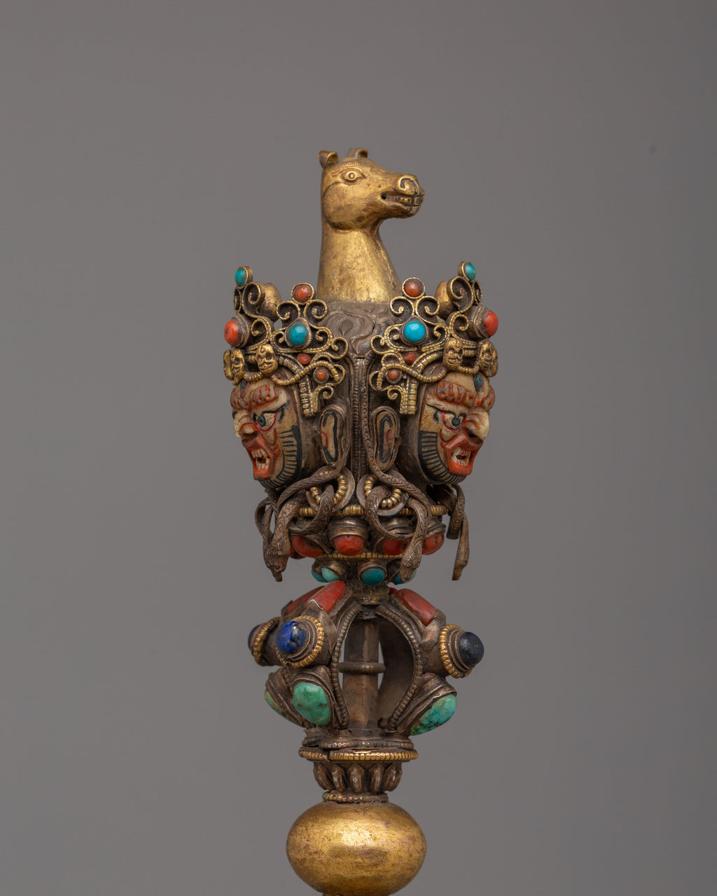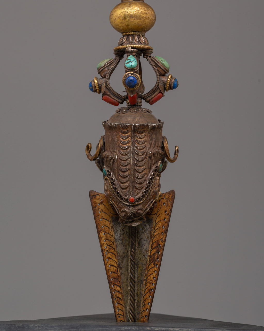 The Handmade Phurba with Vajra, adorned with gemstones, enhances the spiritual energy of any ritual. With Hayagriva as the central deity, the Phurba embodies the protection, wisdom, and compassion necessary for spiritual practice and meditation. The copper and silver materials, along with the vibrant gemstones, complete the craftsmanship, offering both a functional ritual object and a beautiful spiritual art piece. This Phurba is perfect for use on an altar, in Buddhist rituals, or as a sacred gift, serving as a reminder of spiritual strength, peace, and the destruction of negativity.