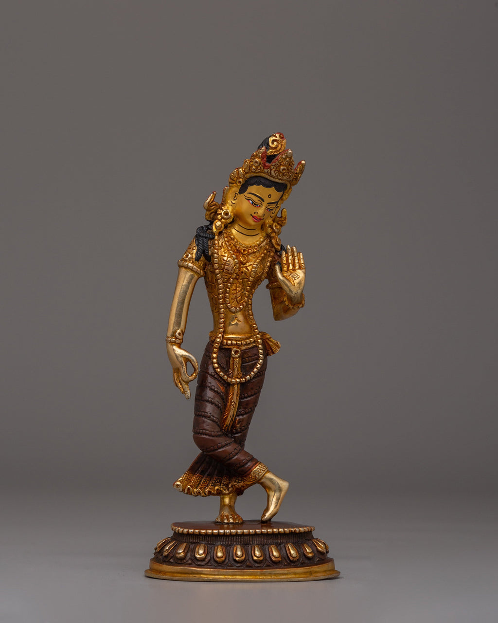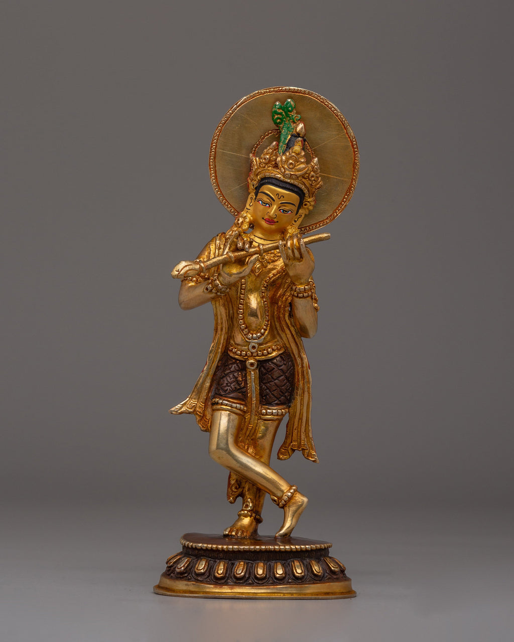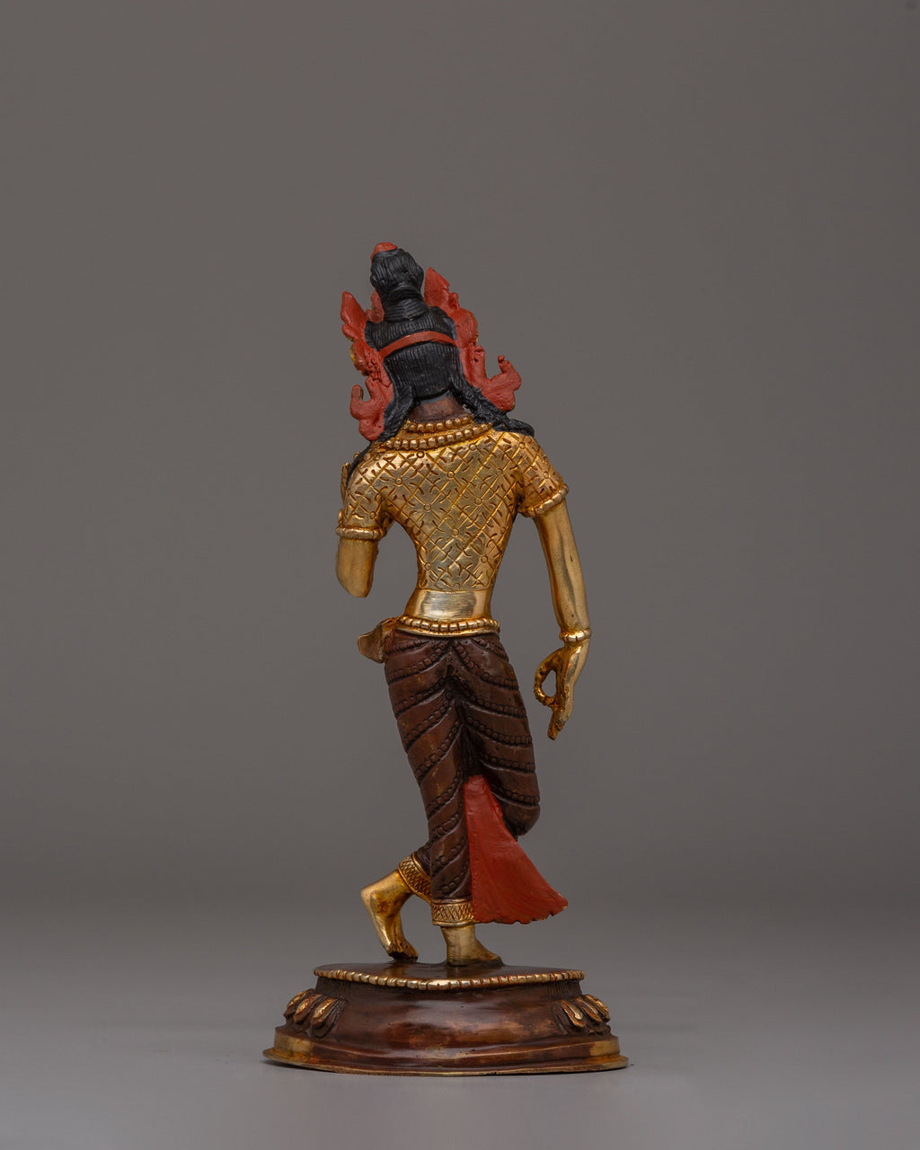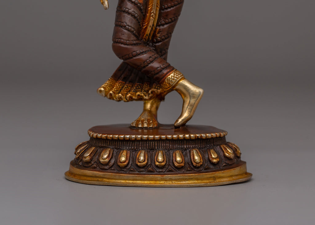 This exquisite Handmade Radha Krishna Statue captures the essence of love, devotion, and harmony. Crafted from copper and adorned with 24K gold plating and vibrant acrylic colors, this statue depicts Radha and Krishna in a graceful, embracing pose. Standing 18.5cm tall with Krishna at 21cm, it represents their eternal bond, making it a powerful symbol for spiritual connection and a beautiful addition to any altar or sacred space.