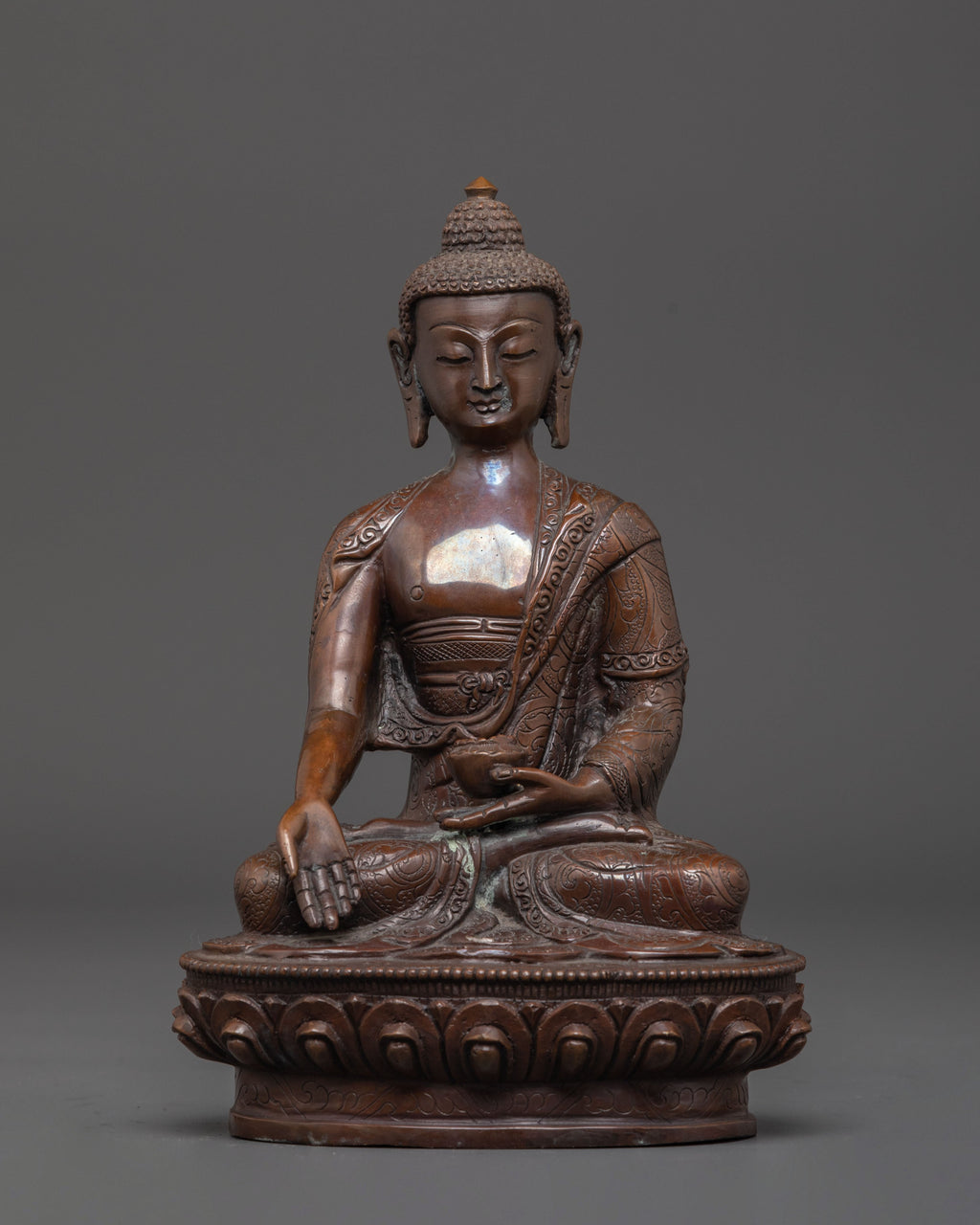 Ratnasambhava, the embodiment of equanimity and generosity, is depicted seated in padmasana (lotus posture) upon a detailed lotus base. His right hand displays the varada mudra (gesture of supreme generosity), symbolizing his boundless giving and compassion. In his left hand, he holds an alms bowl, representing purity and the acceptance of offerings with equanimity. The ushnisha adorning his head signifies his enlightened wisdom and spiritual attainment.