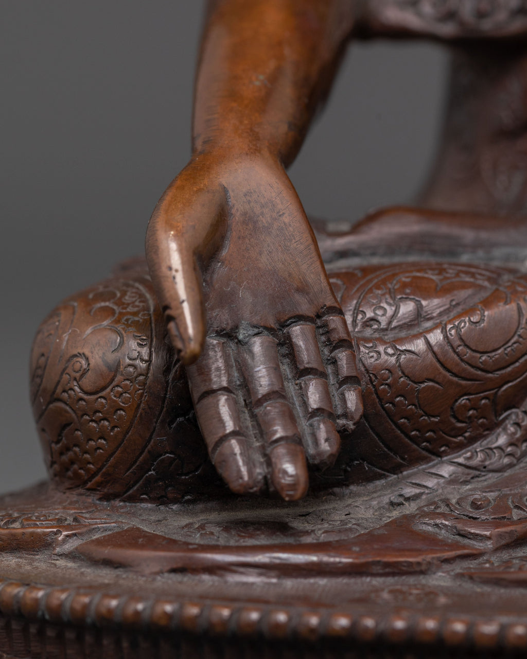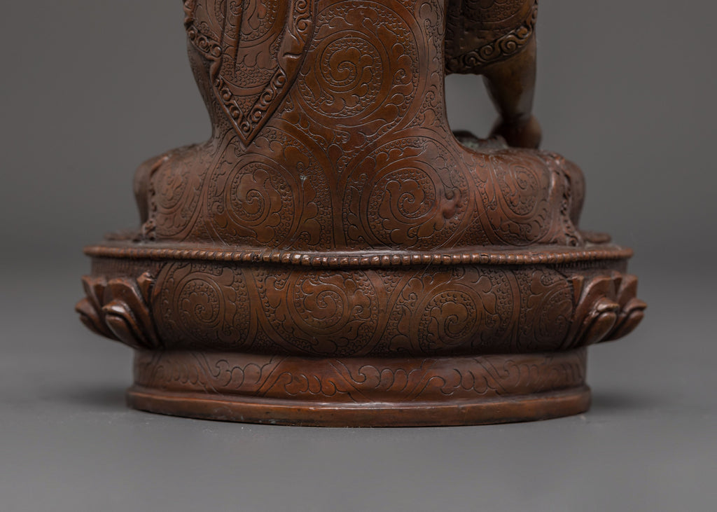 The handmade Ratnasambhava Copper Statue stands 8.3” (21 cm) tall with a 5.5” (14 cm) base and weighs 1.13 kg. Expertly handcrafted from oxidized copper, it highlights the serene presence of Ratnasambhava, the Buddha of Wealth and Abundance. This statue is ideal for those seeking the blessings of prosperity, generosity, and inner balance in their spiritual practice or as a decorative piece for the home.