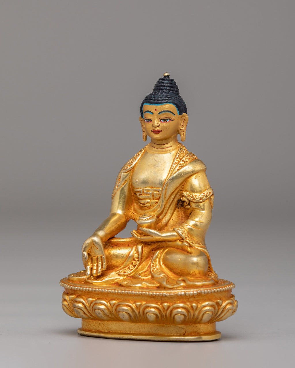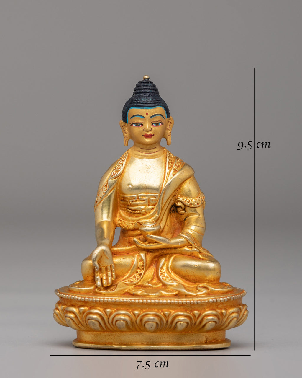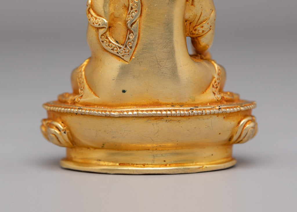 This Traditional Ratnasambhava Statue is made with a copper body and finished with 24K gold plating, giving it a sacred look for your altar or meditation space. Measuring 9.5 cm in height and 7.5 cm in width, and weighing 0.26 kg, this statue is ideal for personal altars, small shrines, or meditation corners. The acrylic color accents bring out the details and the gold finish, making it a beautiful centerpiece for any spiritual space. It brings calm energy to your meditation space.