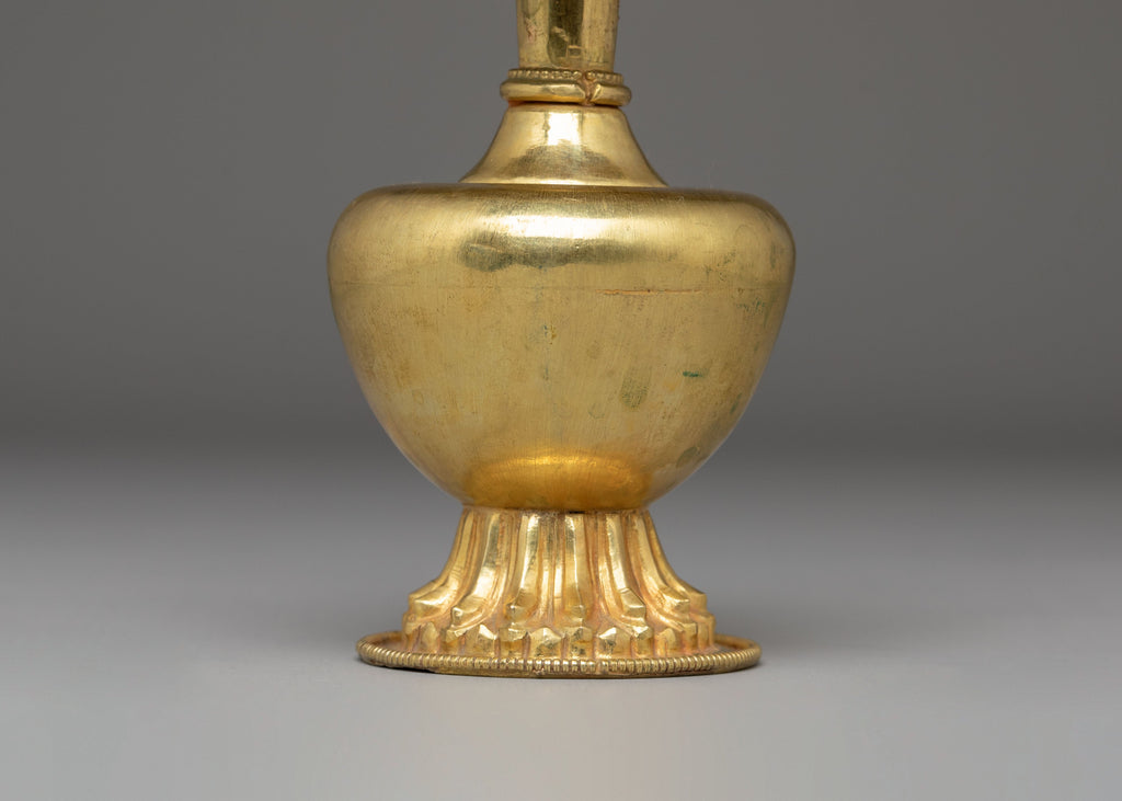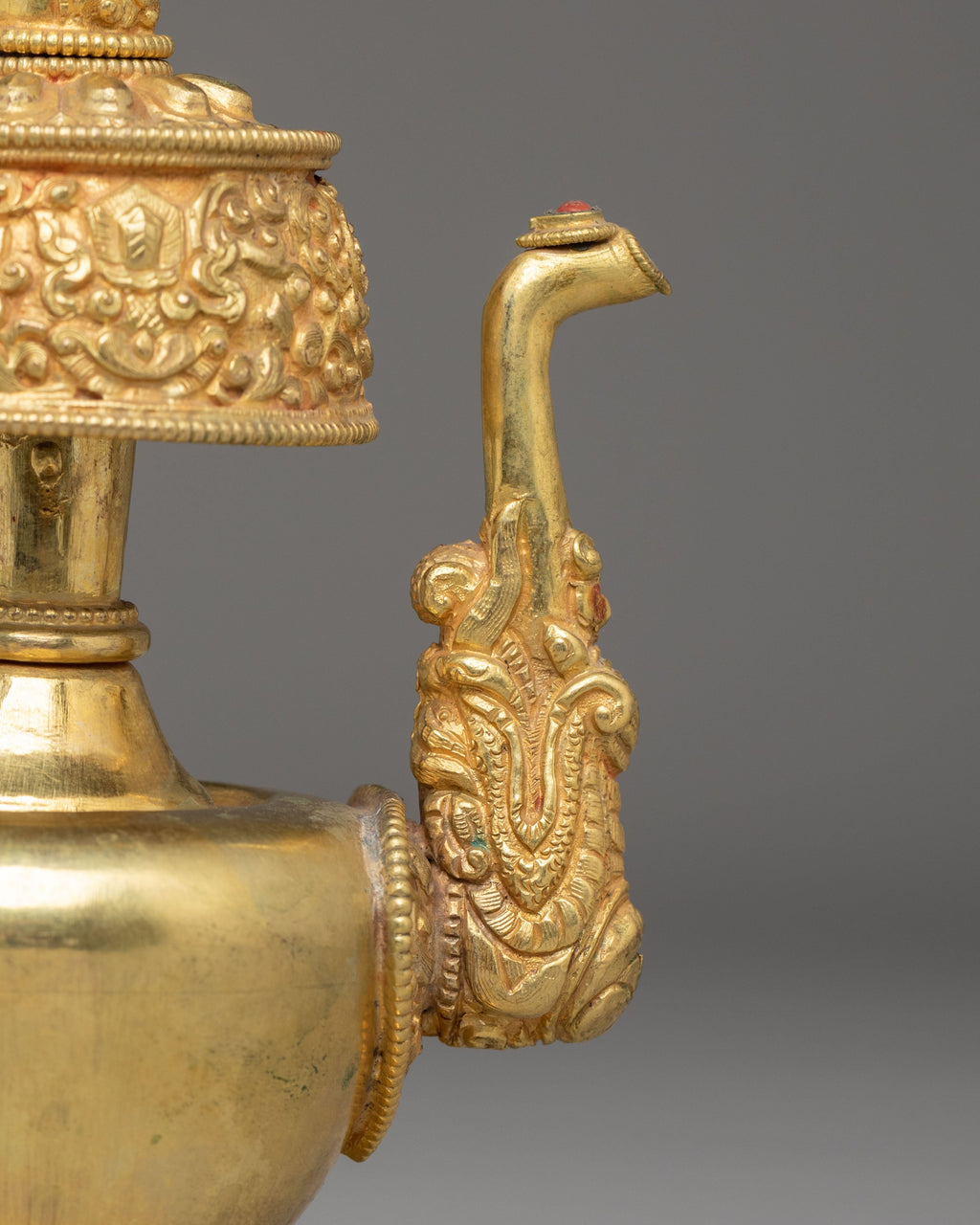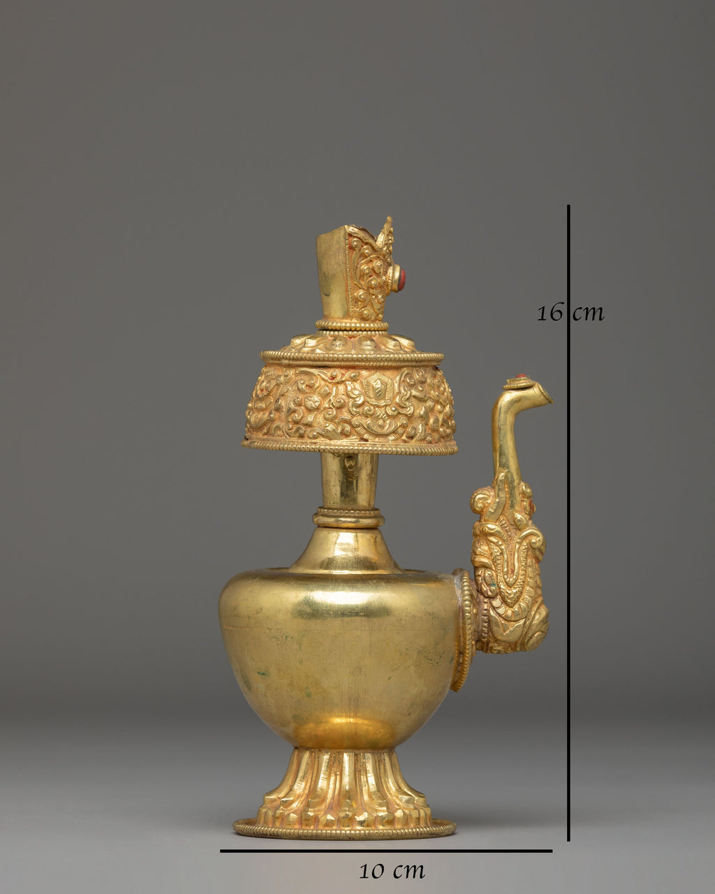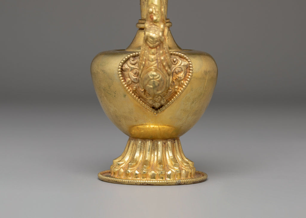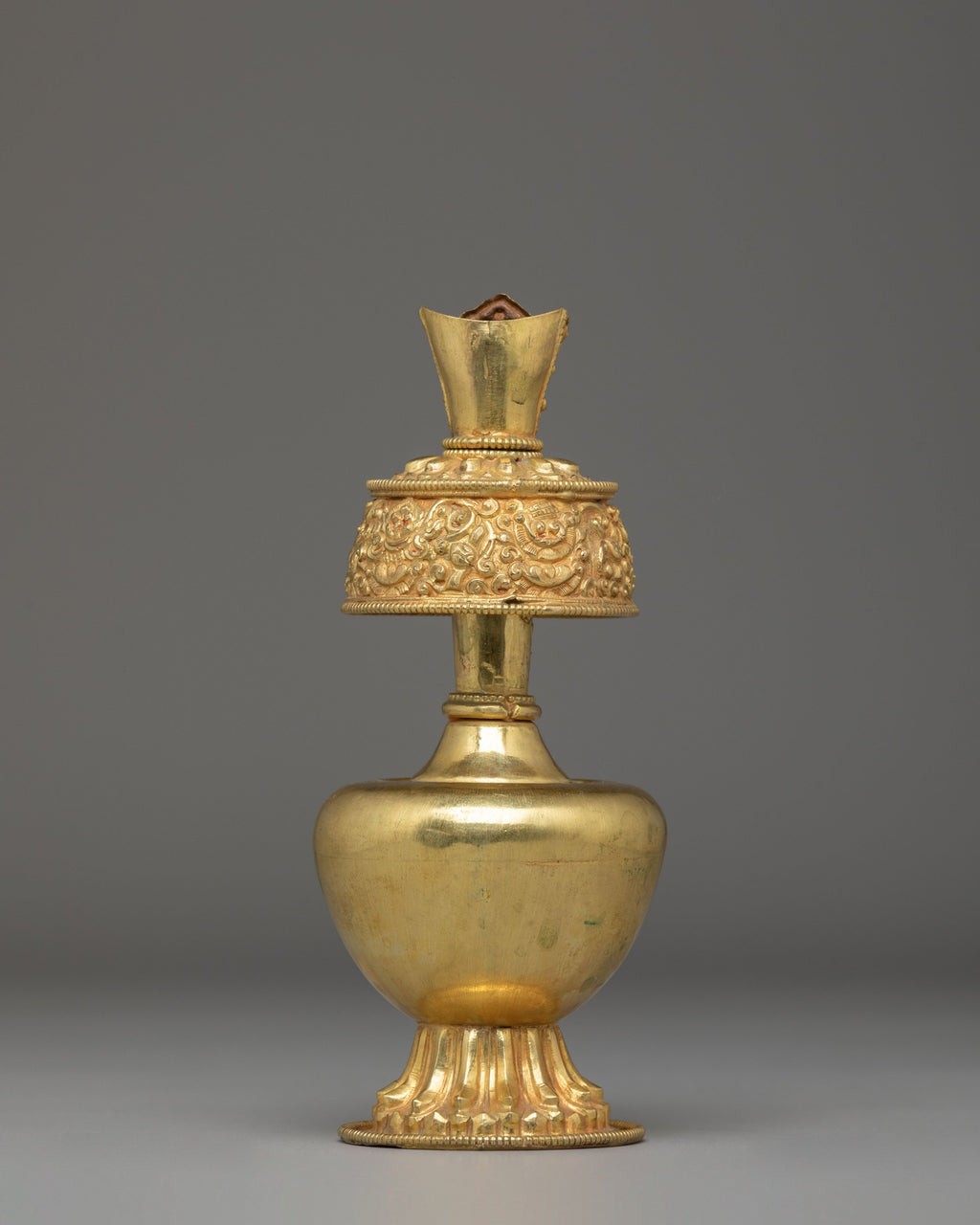This Himalayan Sacred Bhumba is made of copper, gold-plated for a bright, beautiful finish. The introduction of a coral stone enriches the design by bringing brilliant color and spiritual significance. This delicately carved vessel is 16 cm high and 10 cm wide, making it suitable for a variety of spiritual or ornamental purposes. Weighing only 0.26 kg, it has a light yet quiet presence that makes it ideal for exhibition in any altar or meditation place.