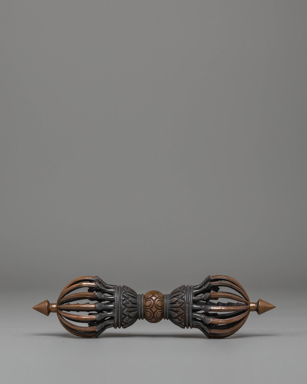 The vajra features the classic prong structure that symbolizes the fusion of compassion and enlightened wisdom. Each contour and sculpted detail pays homage to the sacred geometry of Vajrayana iconography, expressing the harmony between the physical and spiritual realms. The central sphere embodies the pure nature of the mind, while the outward prongs convey the transformative energy that supports meditative and ceremonial practices.