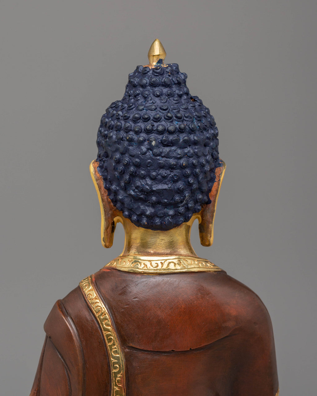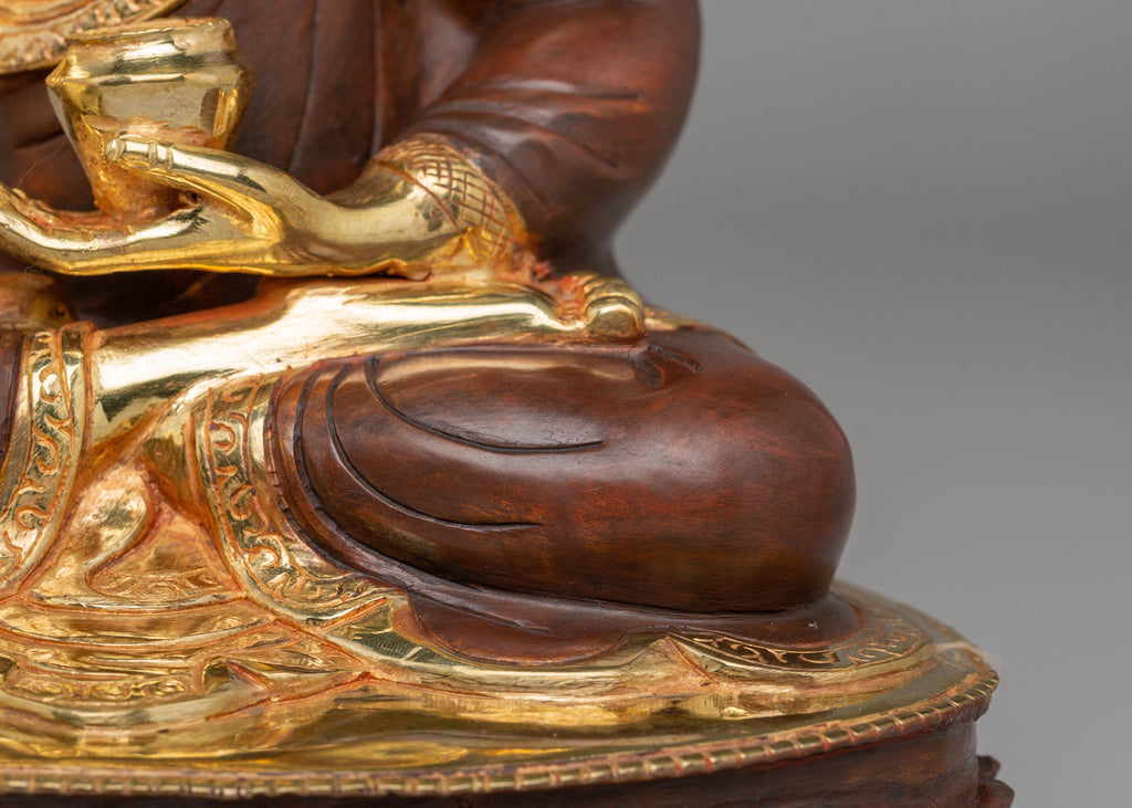 The Shakyamuni Buddha is depicted with key symbolic elements: his right hand in the Bhumisparsha Mudra, signifying his enlightenment and victory over Mara. The left hand holds an alms bowl, symbolizing humility and selflessness. Sitting on a lotus base, he represents purity and spiritual growth. The Ushnisha above his head symbolizes divine wisdom, while the monastic robes reflect his renunciation of worldly attachments, embodying his path to enlightenment.