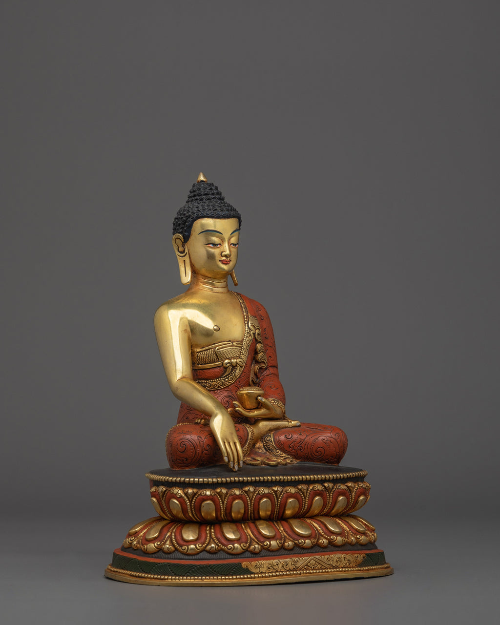 This finely crafted Shakyamuni Buddha statue stands 23 cm tall and measures 18 cm in width, making it perfectly sized for personal altars and sacred spaces. Weighing 2.17 kg, its copper body offers intricate detail, honoring traditional Himalayan artistry. Gilded with gold, the statue radiates a holy glow that enhances its serene presence. The skillful use of acrylic colors accentuates a peaceful expression, inviting calm and spiritual grounding. This exquisite piece embodies the wisdom and compassion of the Enlightened One, making it a meaningful addition to any meditation or devotional practice.