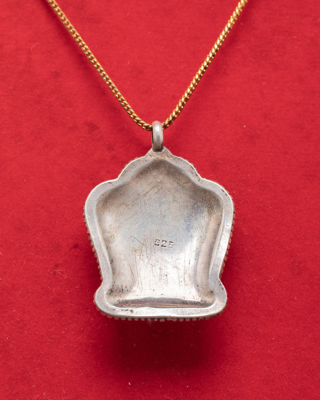 A Buddhist locket is a piece of jewelry designed to hold a small prayer, mantra, or image related to Buddhist practice. The locket may feature a design or image of a Buddhist deity, such as the Buddha, or a representation of a sacred symbol, like the lotus flower. It is typically worn as a talisman to remind the wearer of their spiritual path and to offer protection. Some Buddhist lockets are also used as a form of religious devotion and are frequently given as gifts to friends and family members to provide them with spiritual support and blessings.