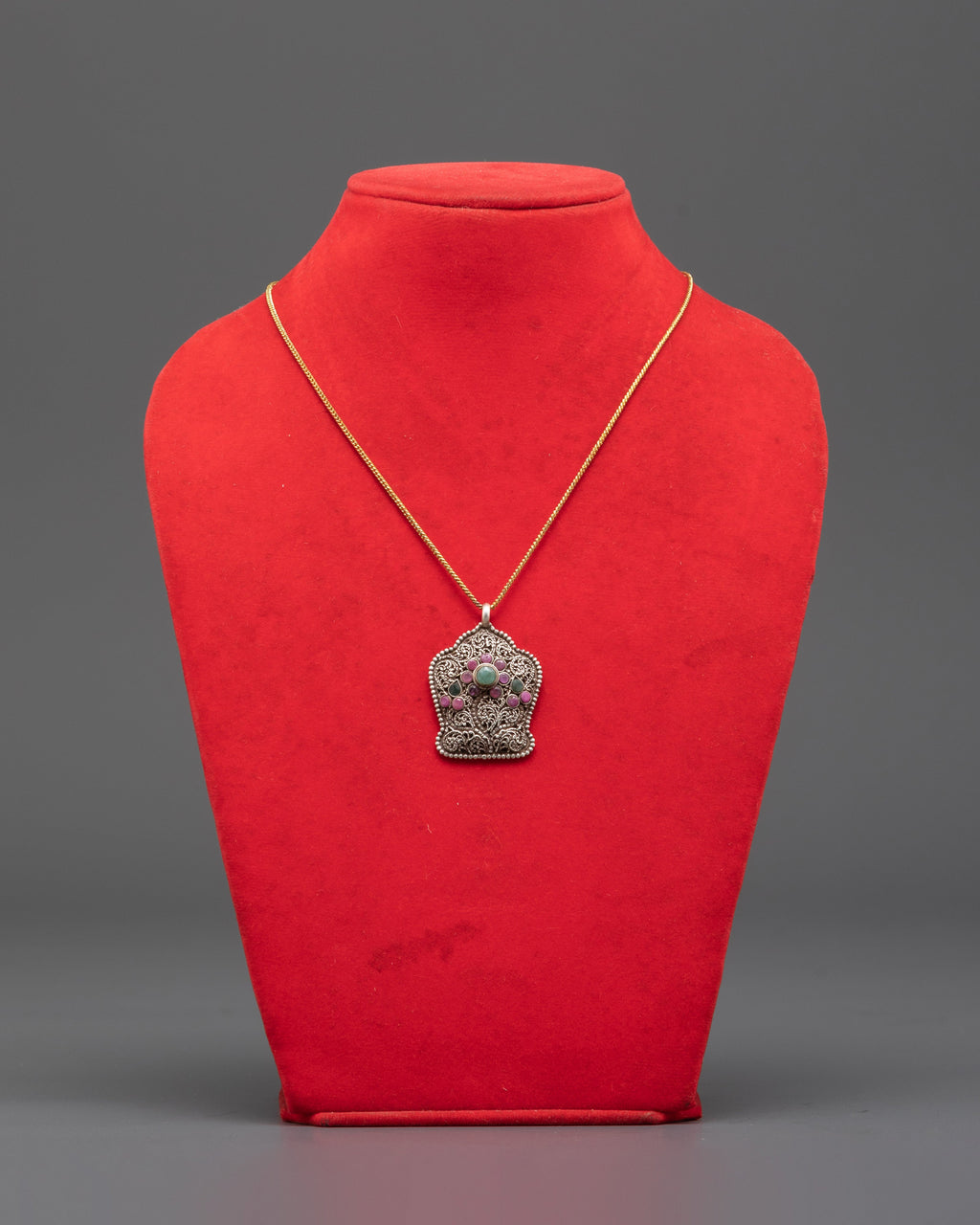 The floral motifs in this traditional pendant represent growth, renewal, and the flourishing of life, making it a meaningful symbol of prosperity and natural harmony. Each flower pattern has been meticulously handcrafted by skilled artisans who understand the sacred significance of botanical imagery in jewelry design, where blooms symbolize feminine grace, beauty, and the cycle of life. The shield-like silhouette adds a regal quality to this ornate silver pendant. At the same time, the combination of emerald and ruby stones creates a captivating color palette that catches light from every angle. This handmade silver flower motif pendant weighs 6 grams, providing a substantial feel that speaks to its quality construction and premium materials, making it perfect for those who appreciate traditional filigree jewelry, ornate floral designs, and artisan-crafted silver pendants with gemstone accents.