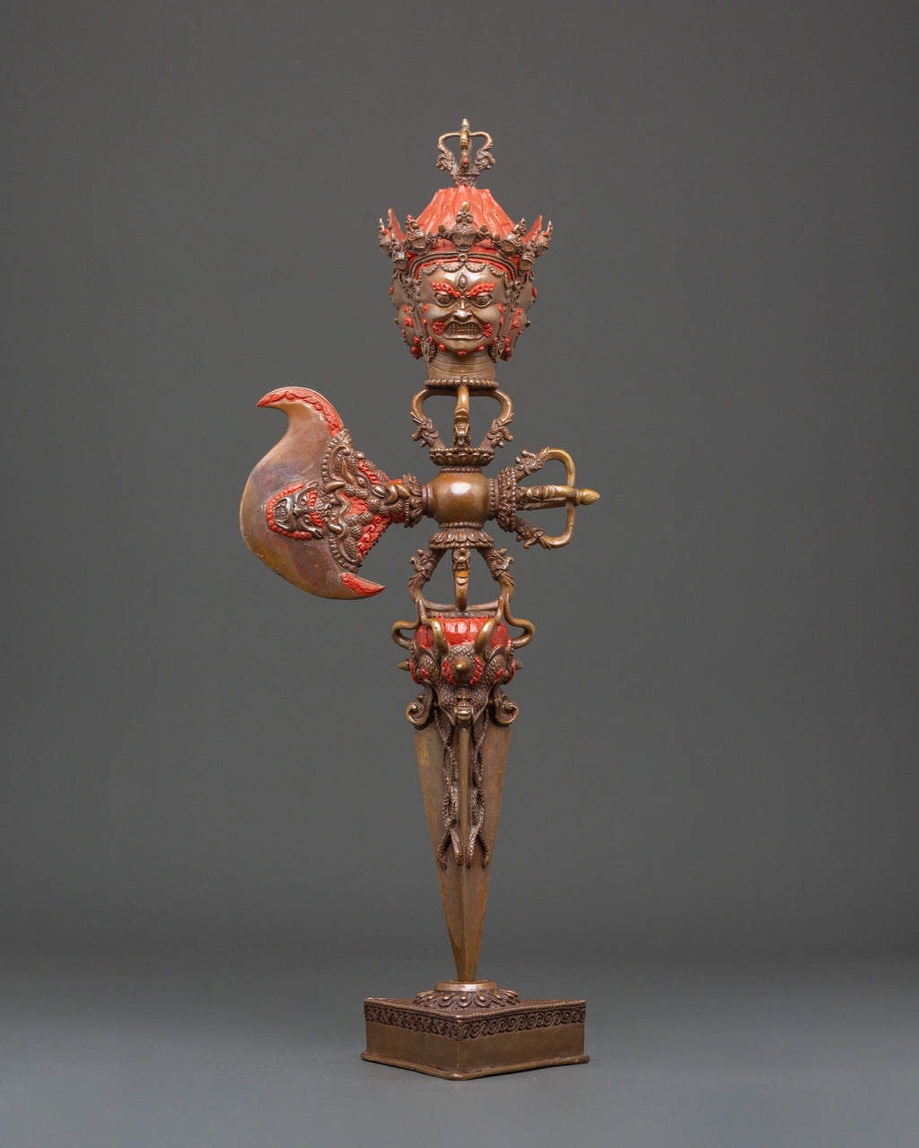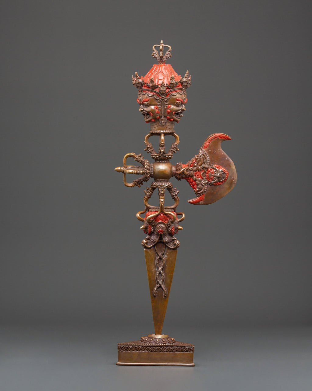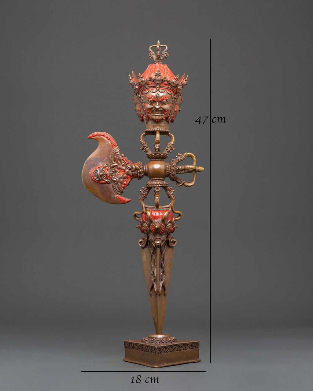 Experience the sacred power of Tibetan Buddhism with our magnificent Spiritual Tibetan Phurba Ritual Dagger, a ceremonial masterpiece rooted in Vajrayana tradition. This impressive oxidized copper phurba stands 47cm tall and 18cm wide, weighing 2.42kg of masterfully crafted spiritual artistry. In Tibetan Buddhist practice, the phurba serves as a ritual implement for purification ceremonies and protection rituals, symbolically destroying negative energies and spiritual obstacles. The three-sided blade represents the transformation of the three poisons (ignorance, attachment, and aversion) into wisdom, compassion, and skillful means. This traditional Buddhist ceremonial tool transforms any meditation space or altar into a sanctuary of spiritual protection and enlightenment.