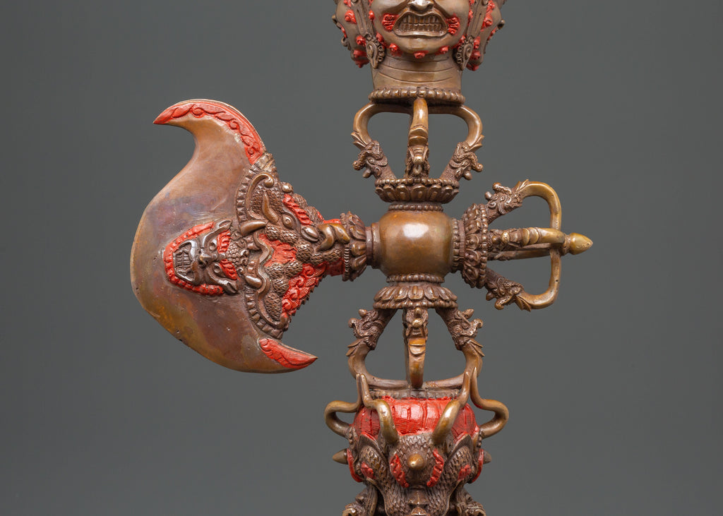 The ceremonial dagger (Sanskrit: Kila; Tibetan: phurba) is essential for expelling evil and is considered particularly effective in neutralizing the forces obstructing Tantric Buddhist practice. It has ancient origins, first appearing in the Indian Rig Veda as the core blade of the vajra used by Indra to destroy the primordial cosmic snake Vritra. Kila, derived from Sanskrit, was most likely associated with Vedic sacrifices. Meditation on the Vajrakila Tantra, an early Indian scripture first promoted in Tibet in the eighth century by Padmasambhava, one of the founding teachers of Tibetan Buddhism, is used to invoke the three-headed Vajrakila Buddha.