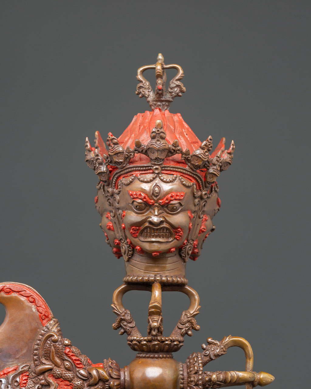 The intricate design features elaborate symbolic elements that tell the story of Buddhist cosmology and spiritual transformation. The ornate handle showcases detailed makara (mythical sea creature) motifs with fierce protective expressions, representing the power to overcome worldly obstacles and negative influences. The central shaft displays traditional Tibetan decorative patterns and sacred symbols, while the distinctive triangular blade maintains the classical phurba form used in monastery ceremonies for centuries. The oxidized copper construction creates rich patina that highlights every carved detail, from the flowing ribbons and tassels to the intricate facial features of the protective deities. Each element has been meticulously handcrafted to honor the traditional Himalayan artistic heritage while serving as a powerful focal point for spiritual practice.