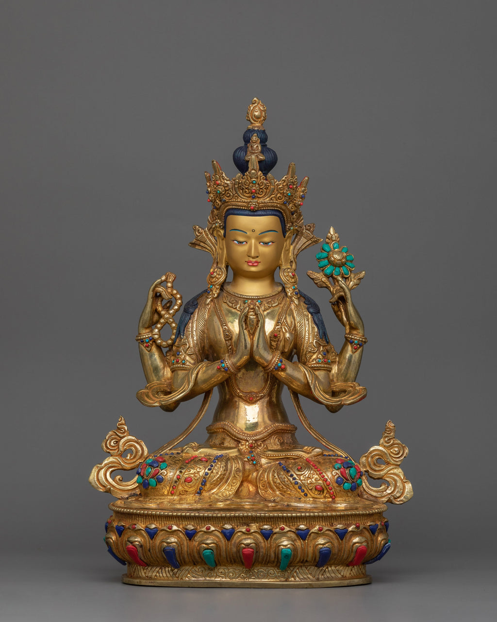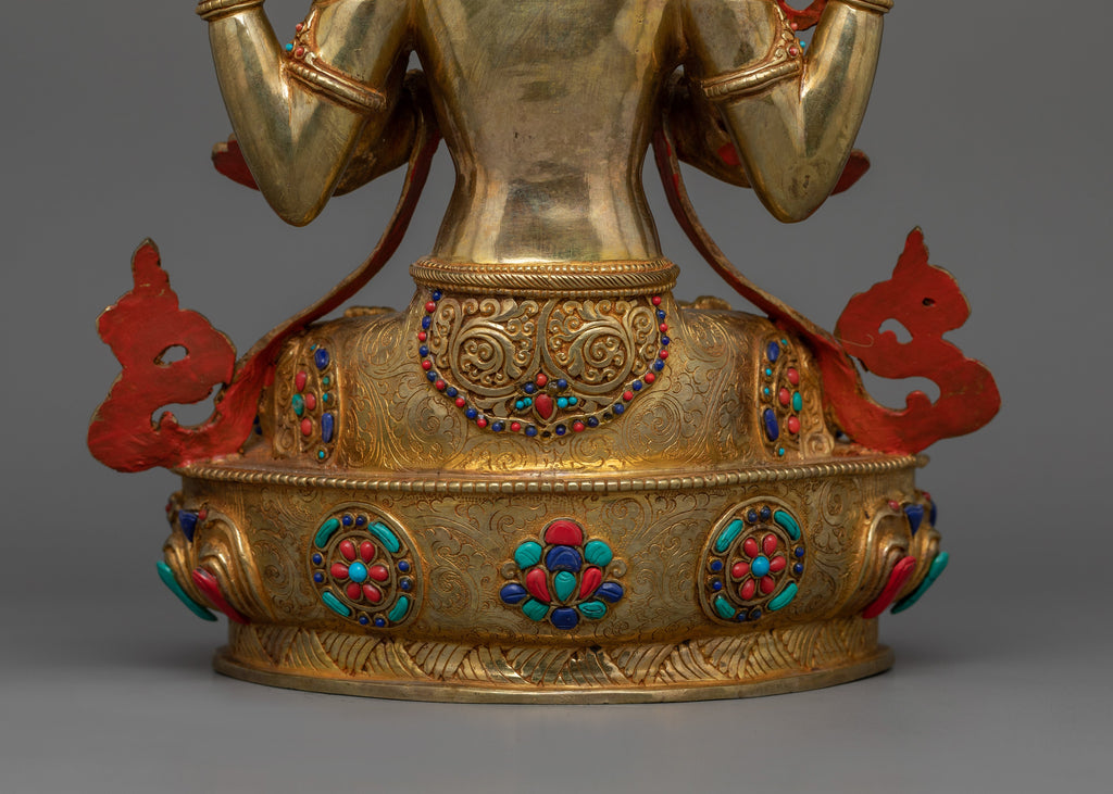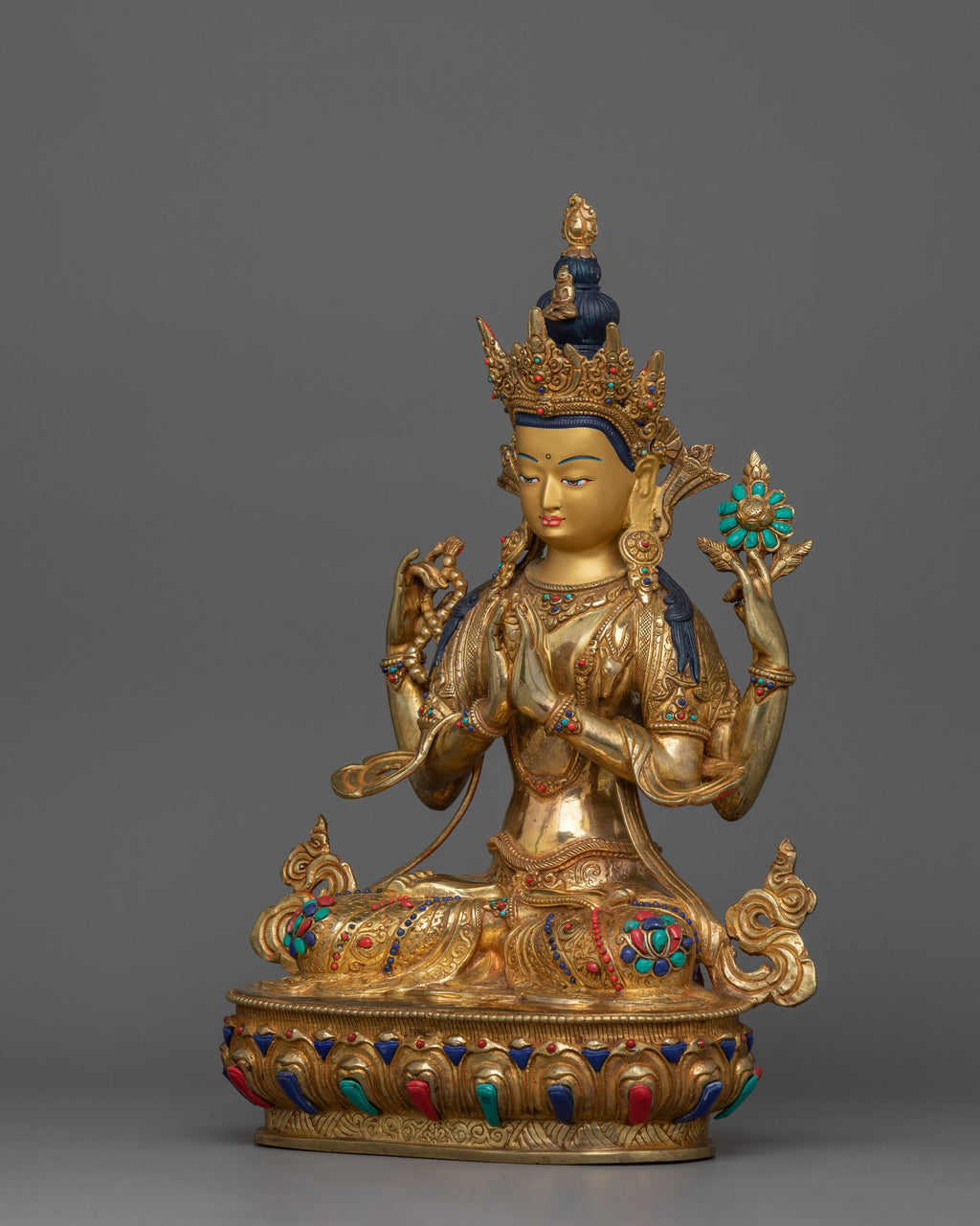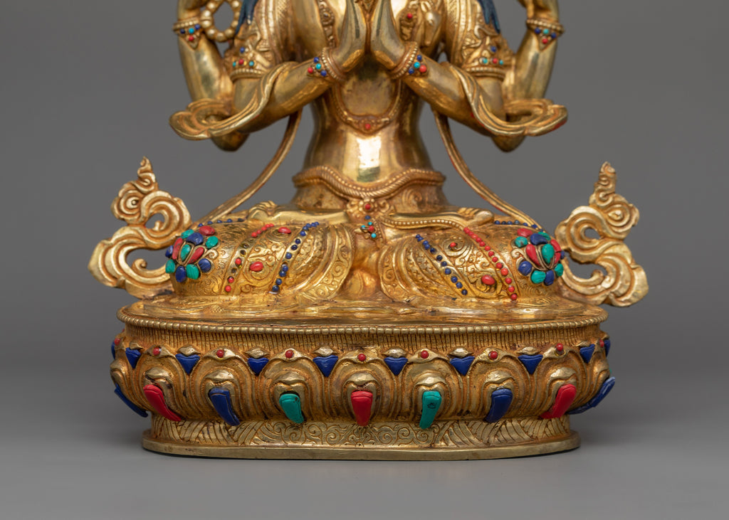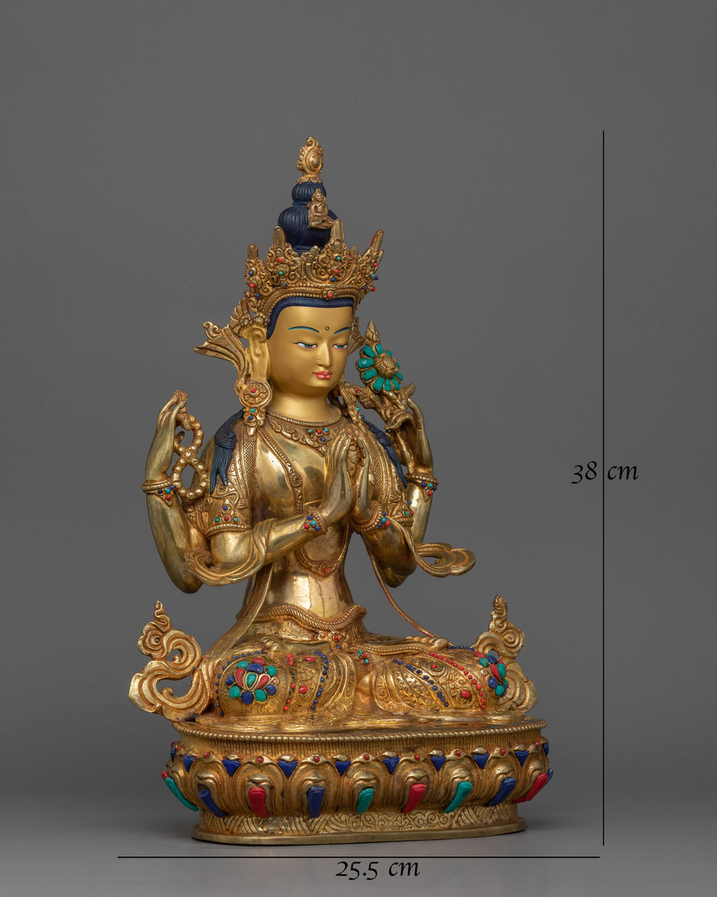 This handmade statue of Chenrezig, stands at 15”/38cm (Height) and 10”/25.5cm (Base). This statue is made up of a copper body with 24k gold gilding and gemstones. Designed by talented Nepalese artisans, this detailed sculpture is ideal for altars, meditation areas, or as a meaningful decor item for individuals seeking awareness in their daily lives.